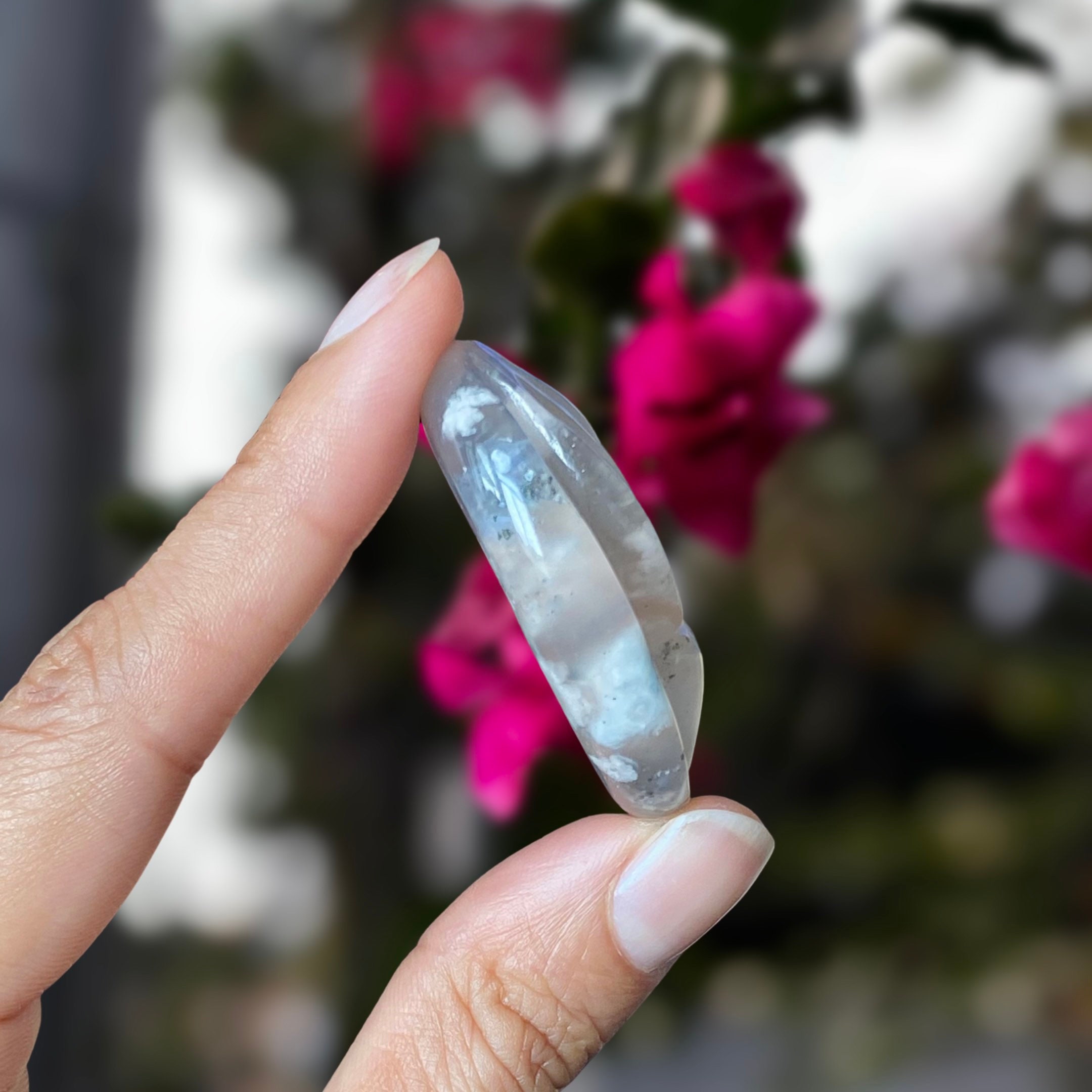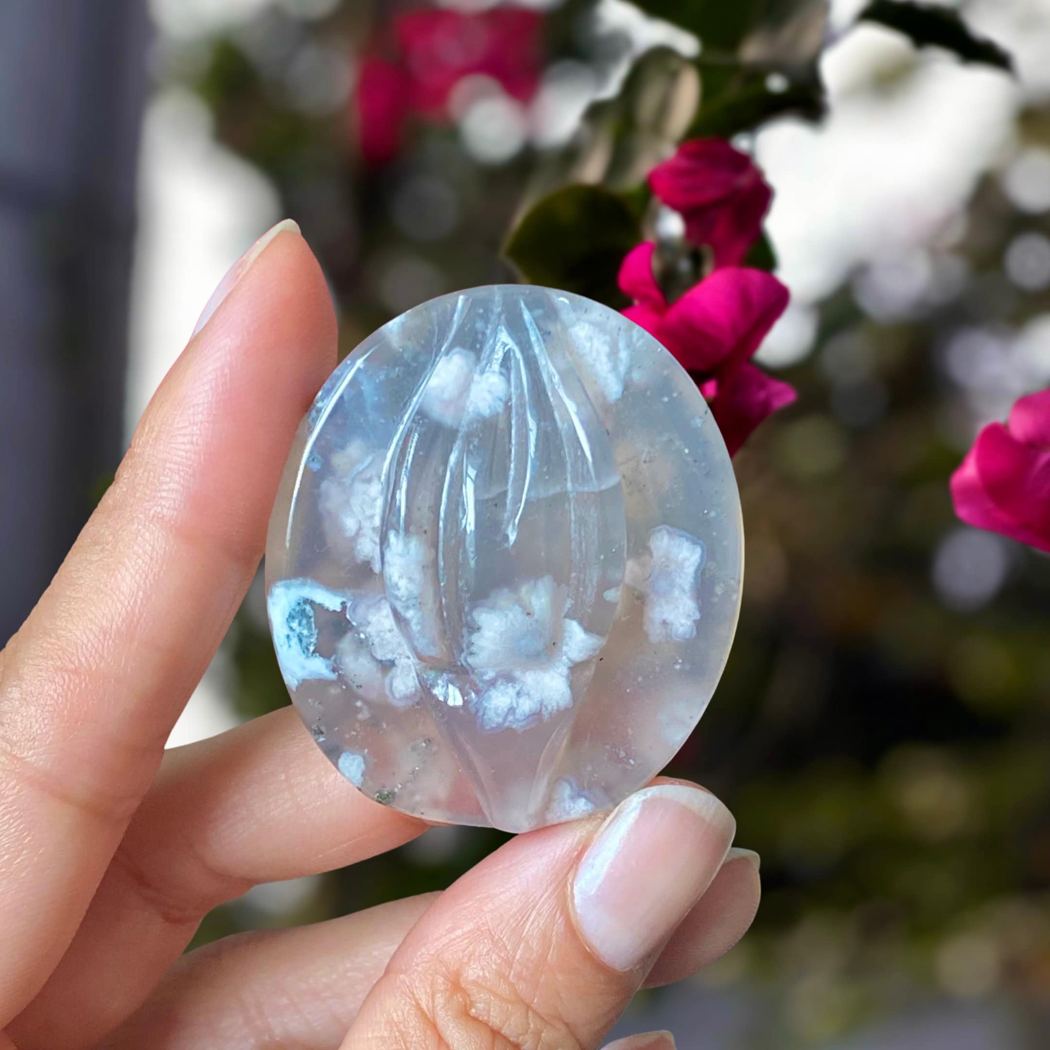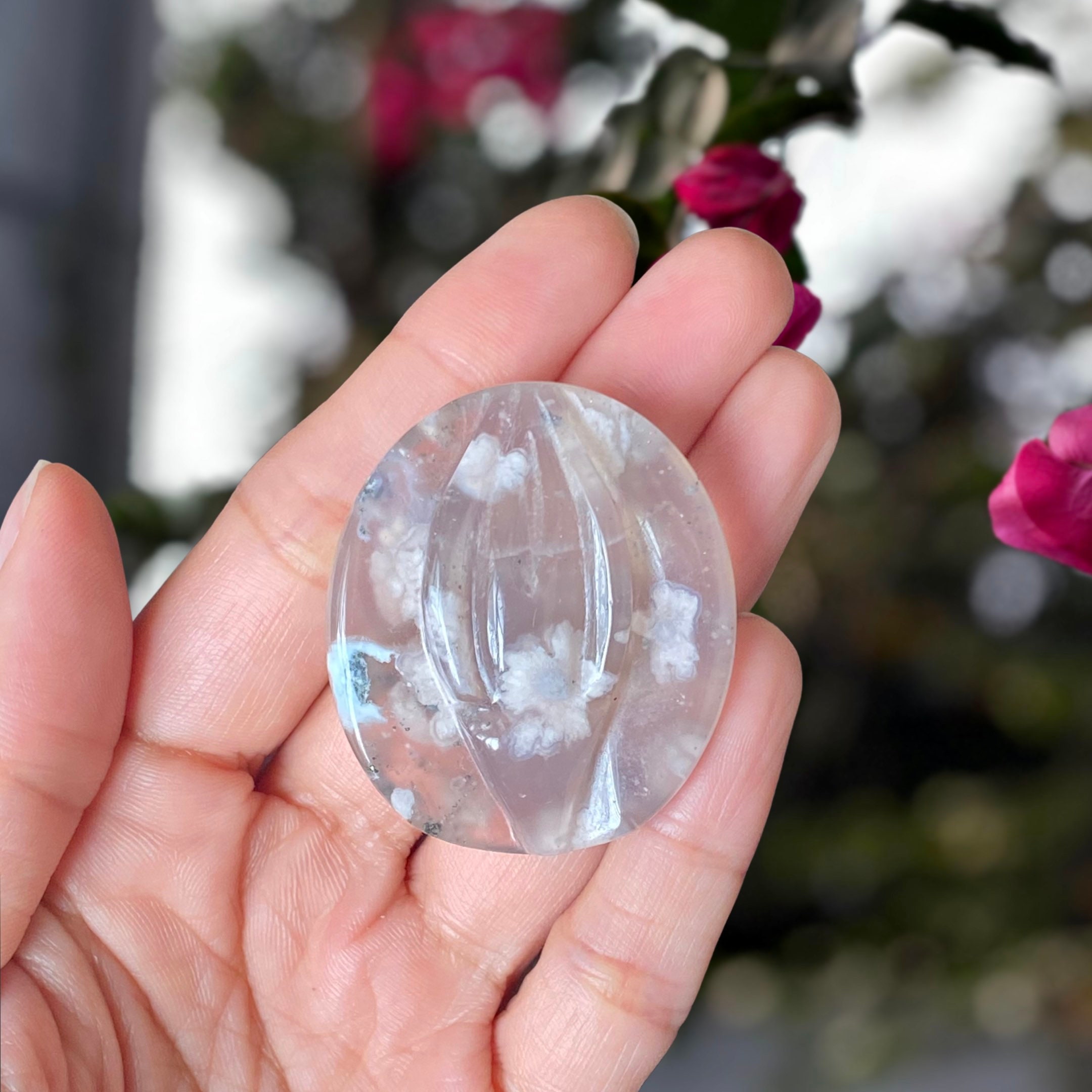 Listing Information: Hand-Carved Flower Agate Yoni (Sacred Space). Approx. 1.5 x 1.3 inches. Velvet Pouch for Safekeeping.