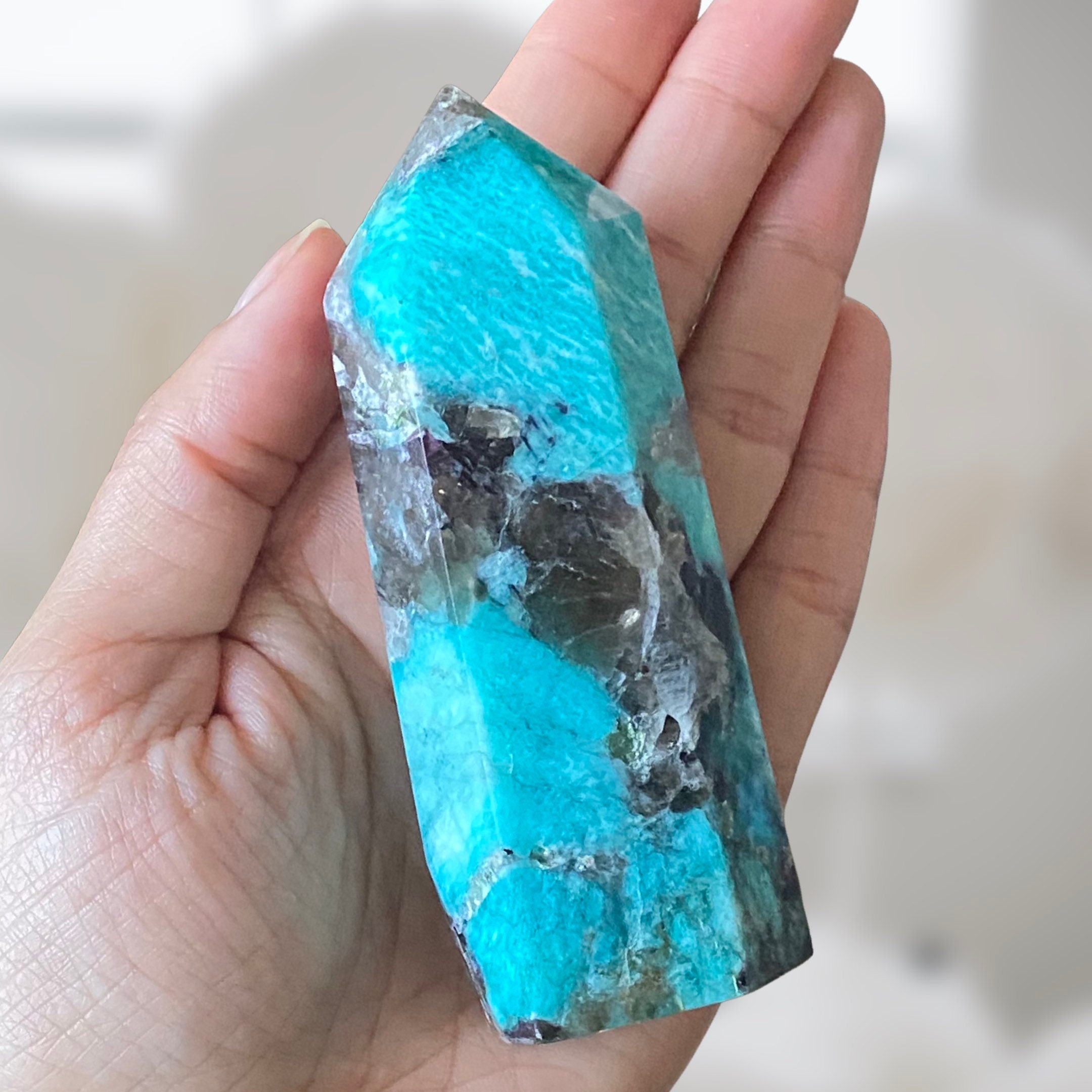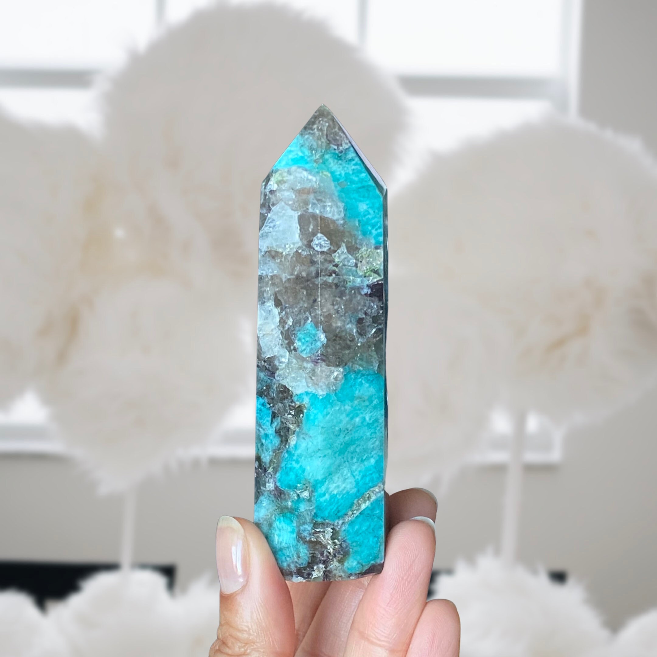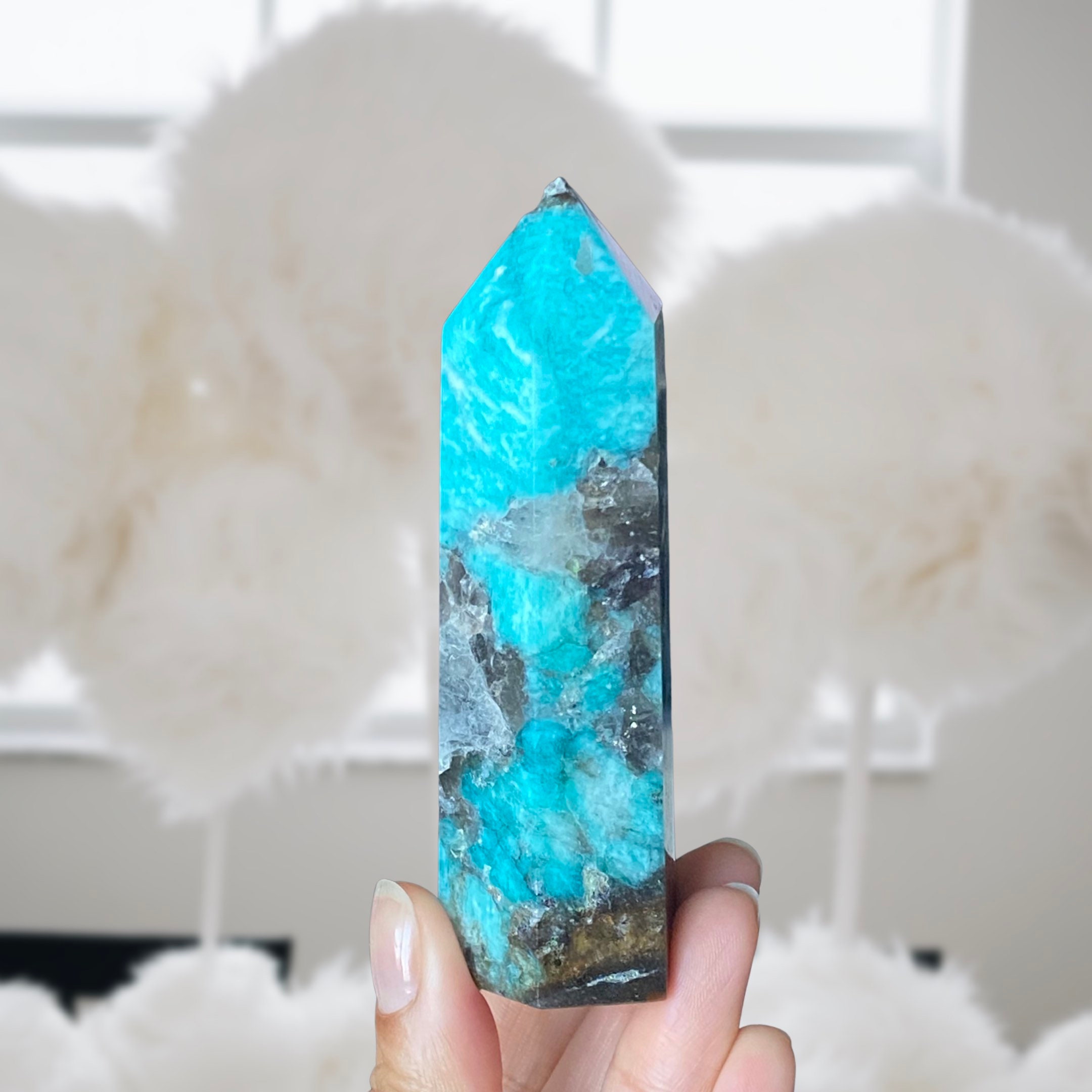 Listing Information: Natural Amazonite Tower w/ Smoky Quartz and Lepidolite inclusions (approx. 1.3 x 0.90 x 3.7 inches. 189 grams). This tower is cut to six side facets that come to a point and then highly polished. You will receive the exact tower as photographed.