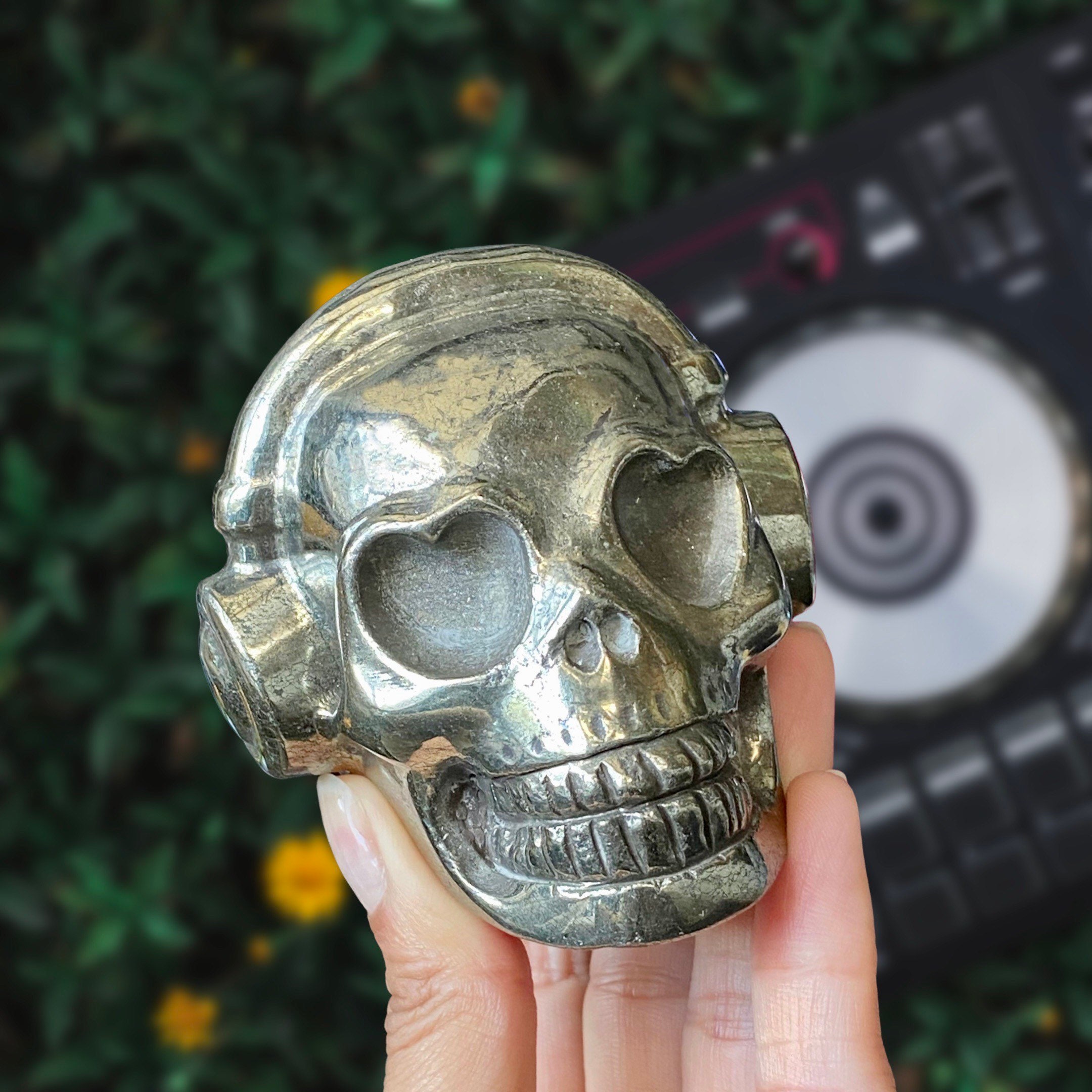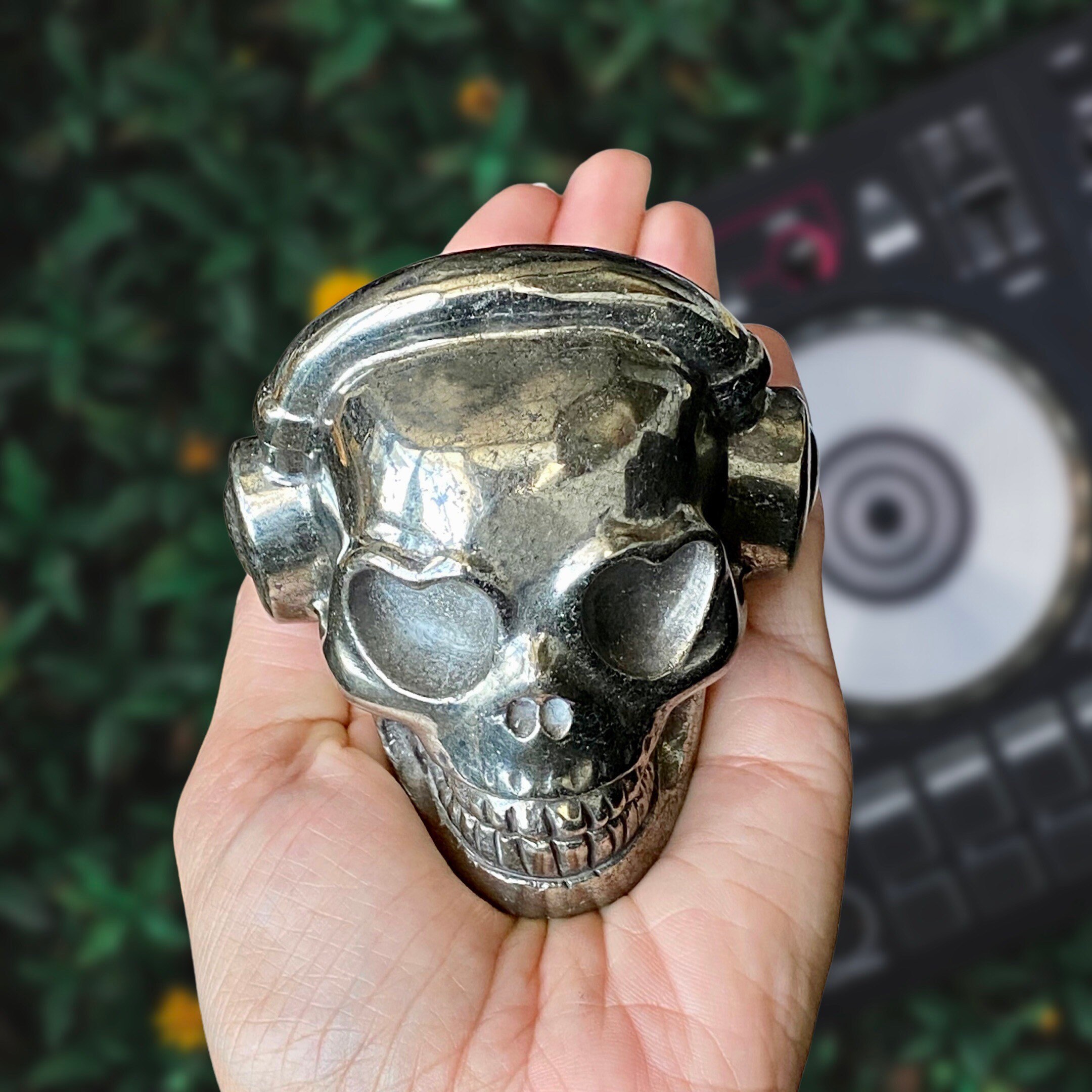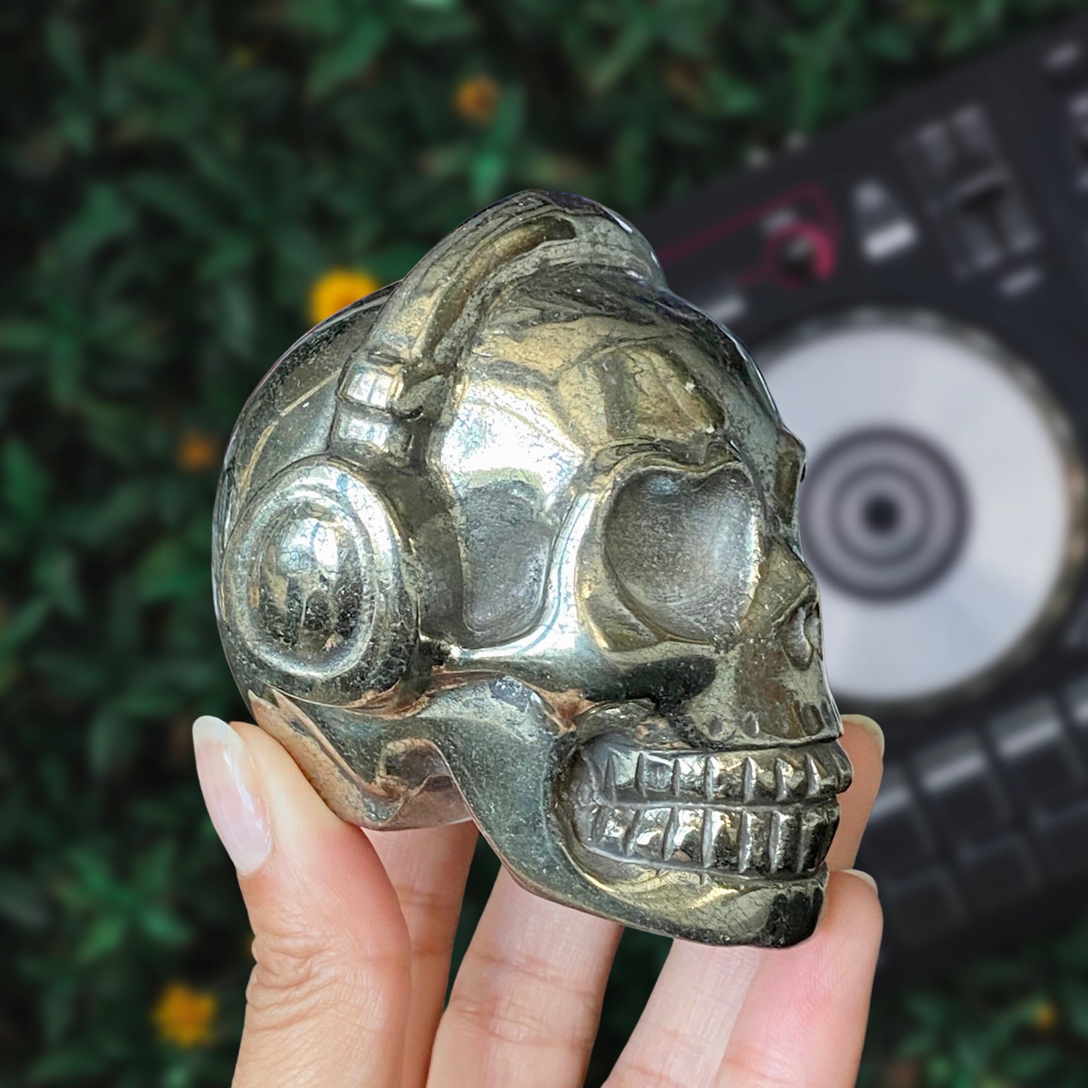 Listing Information: Hand-Carved Pyrite Skull w/Headphones. Approx. 2.9 x 3 x 2.5 inches, 826 - 879 grams. You will receive a similar skull to the one shown. As each piece is individually made, skull shape and design may vary slightly.