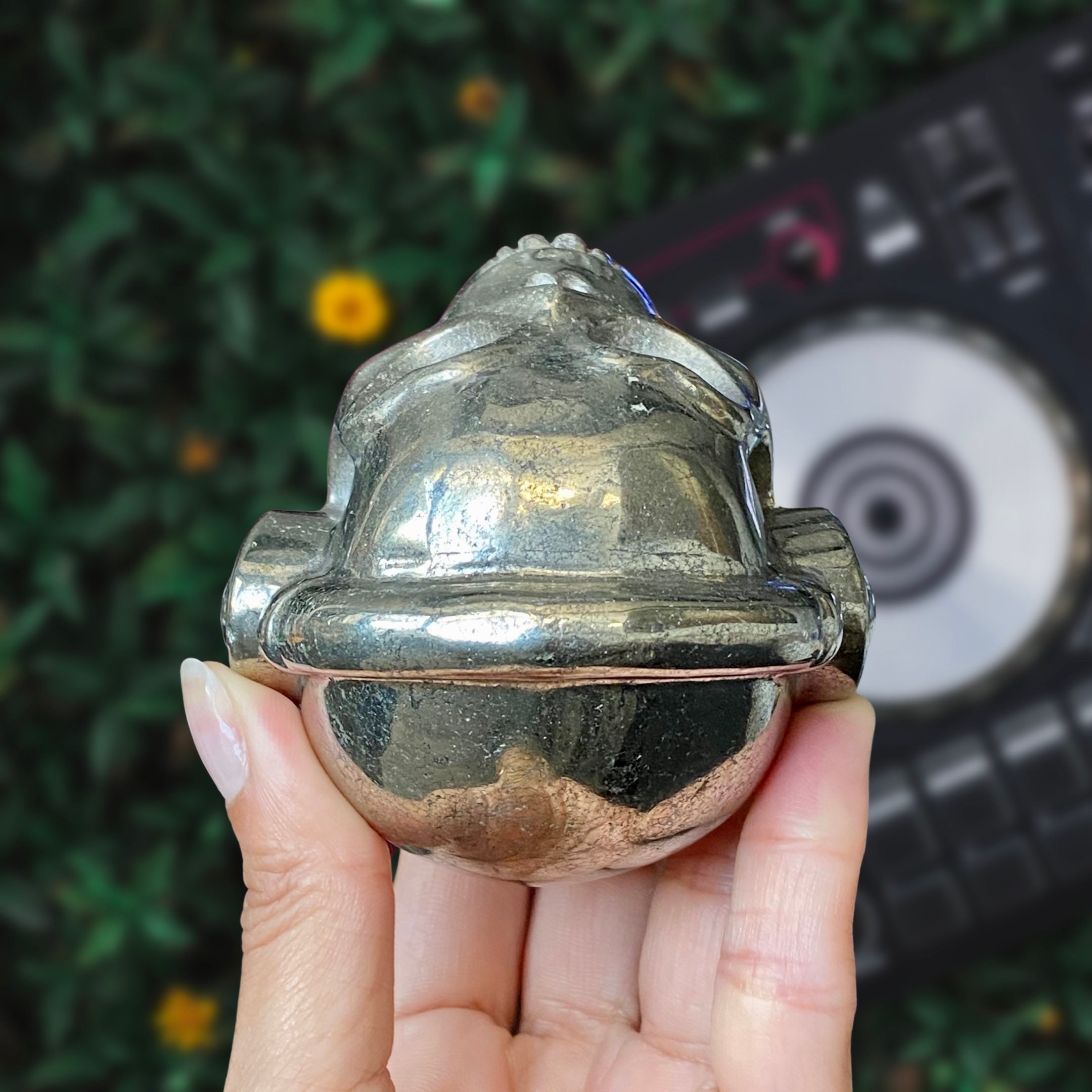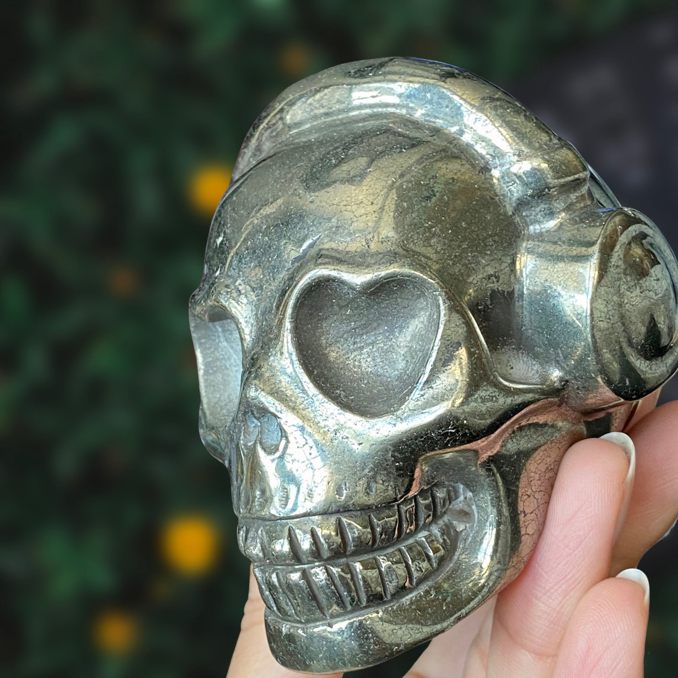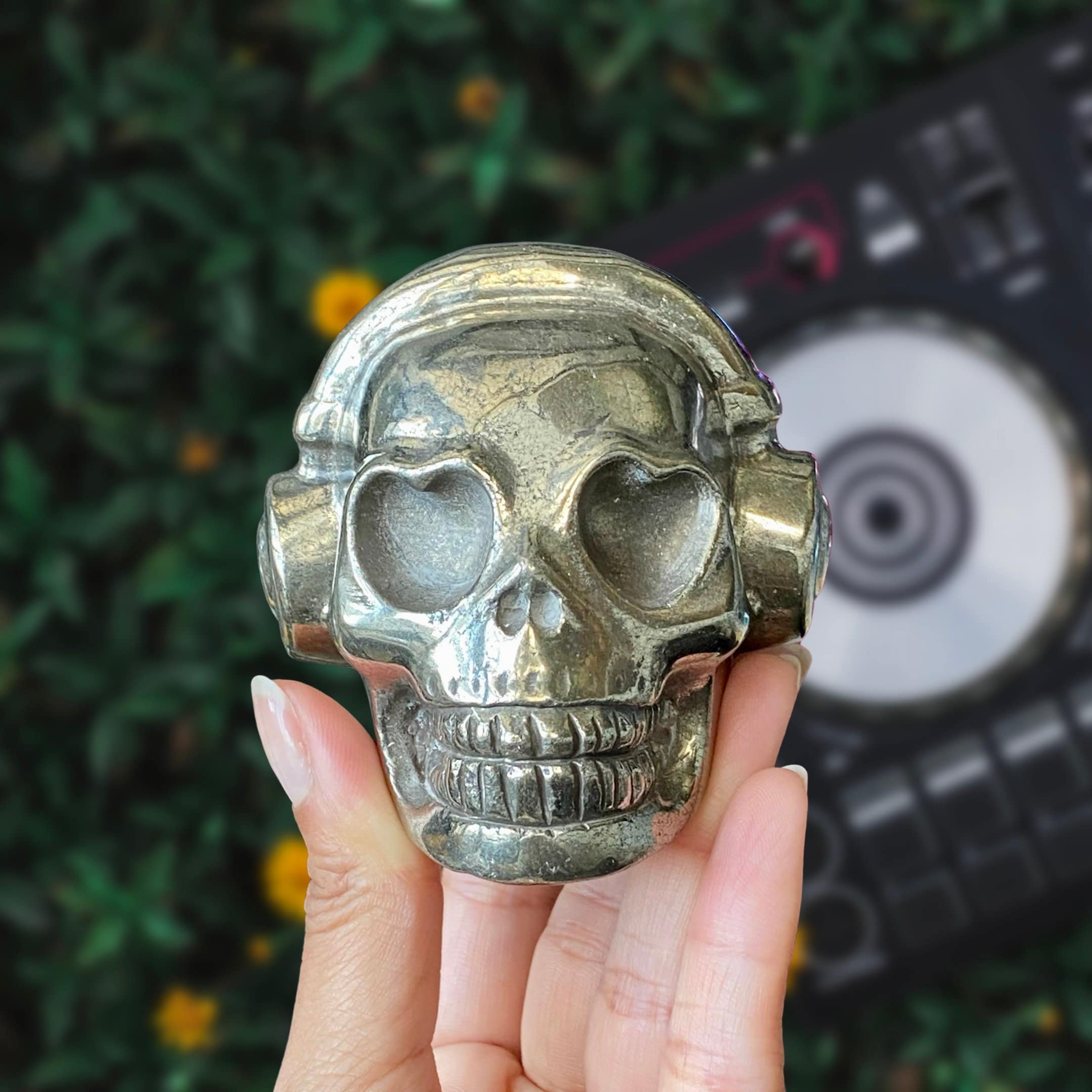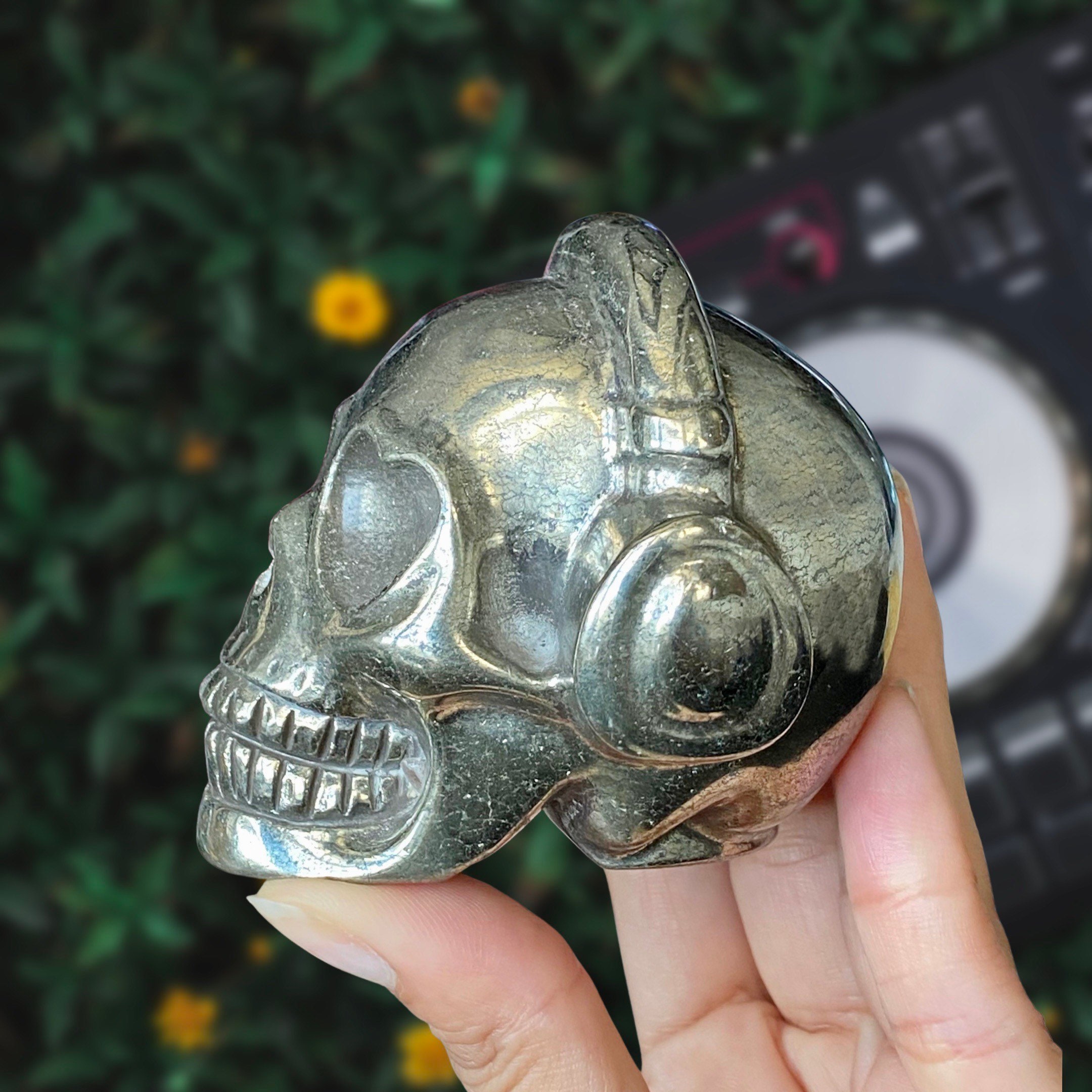 Listing Information: Hand-Carved Pyrite Skull w/Headphones. Approx. 2.9 x 3 x 2.5 inches, 826 - 879 grams. You will receive a similar skull to the one shown. As each piece is individually made, skull shape and design may vary slightly.