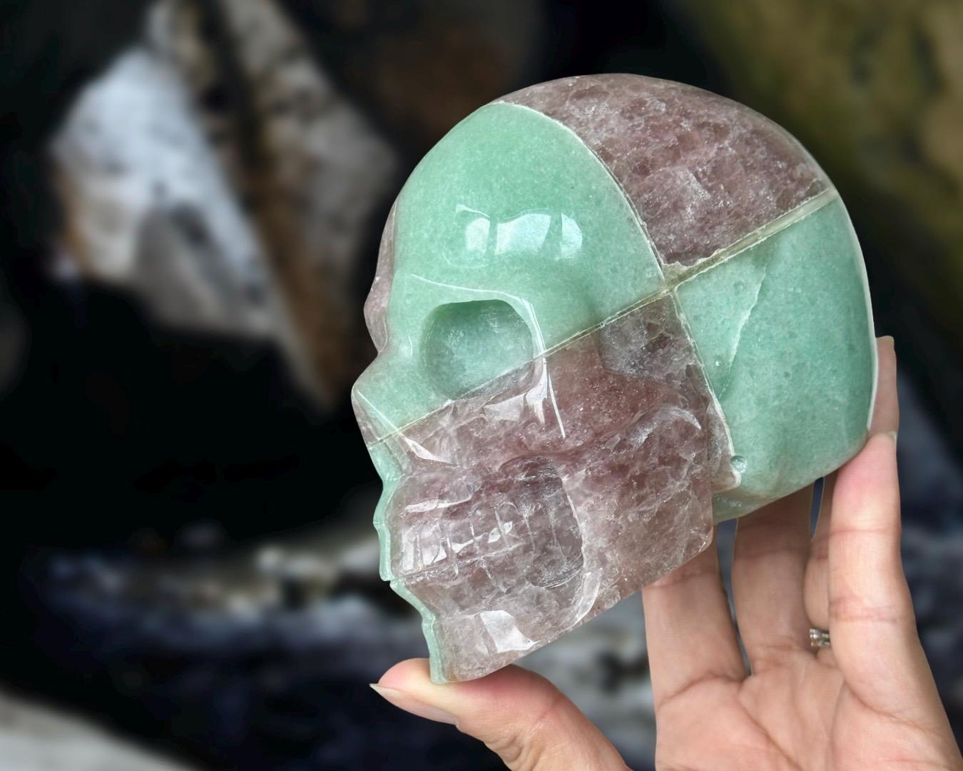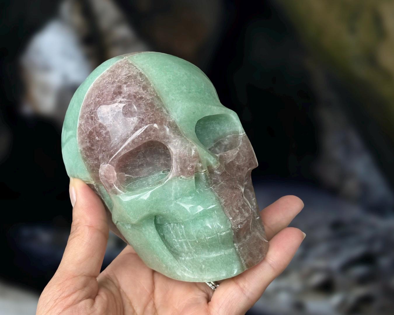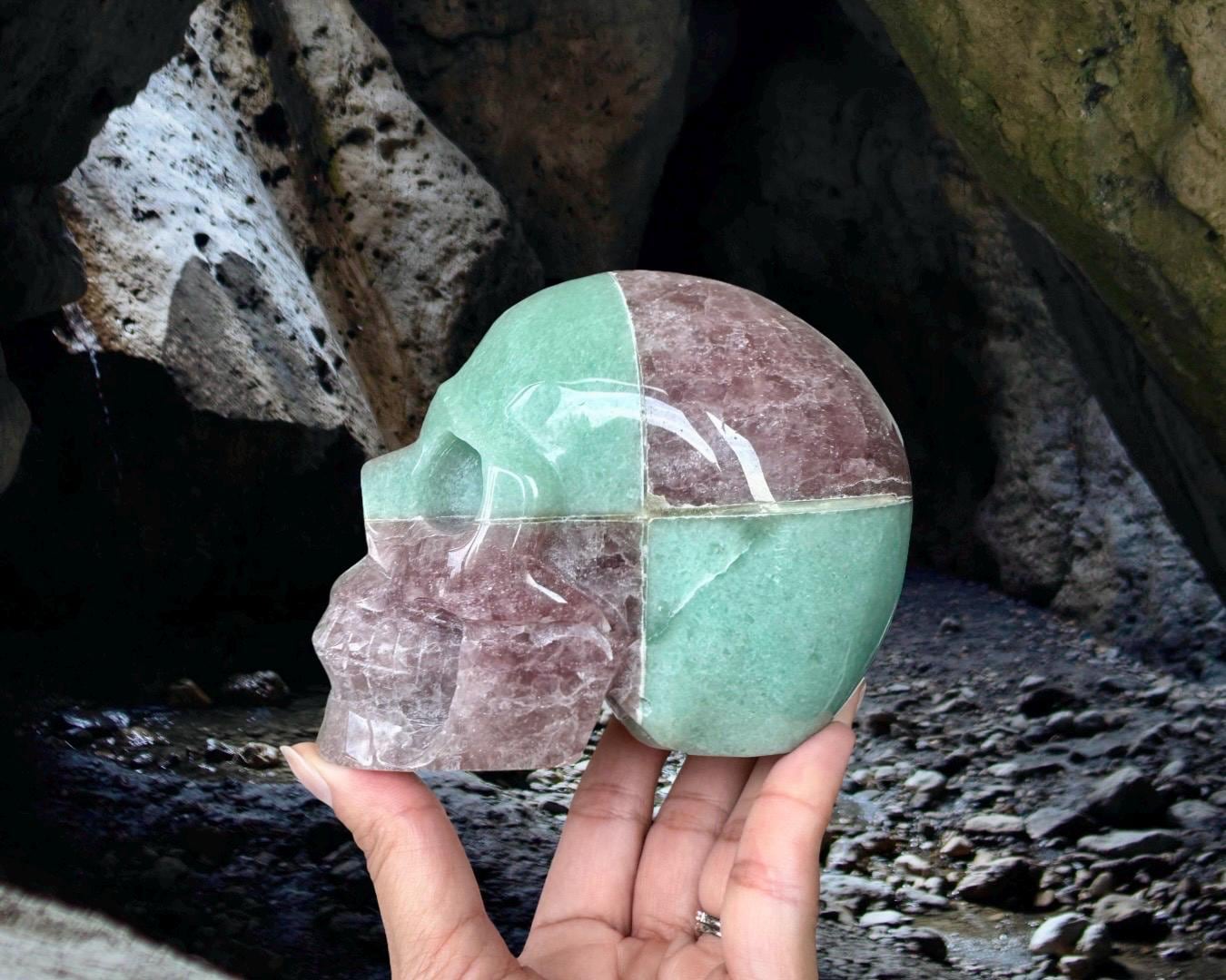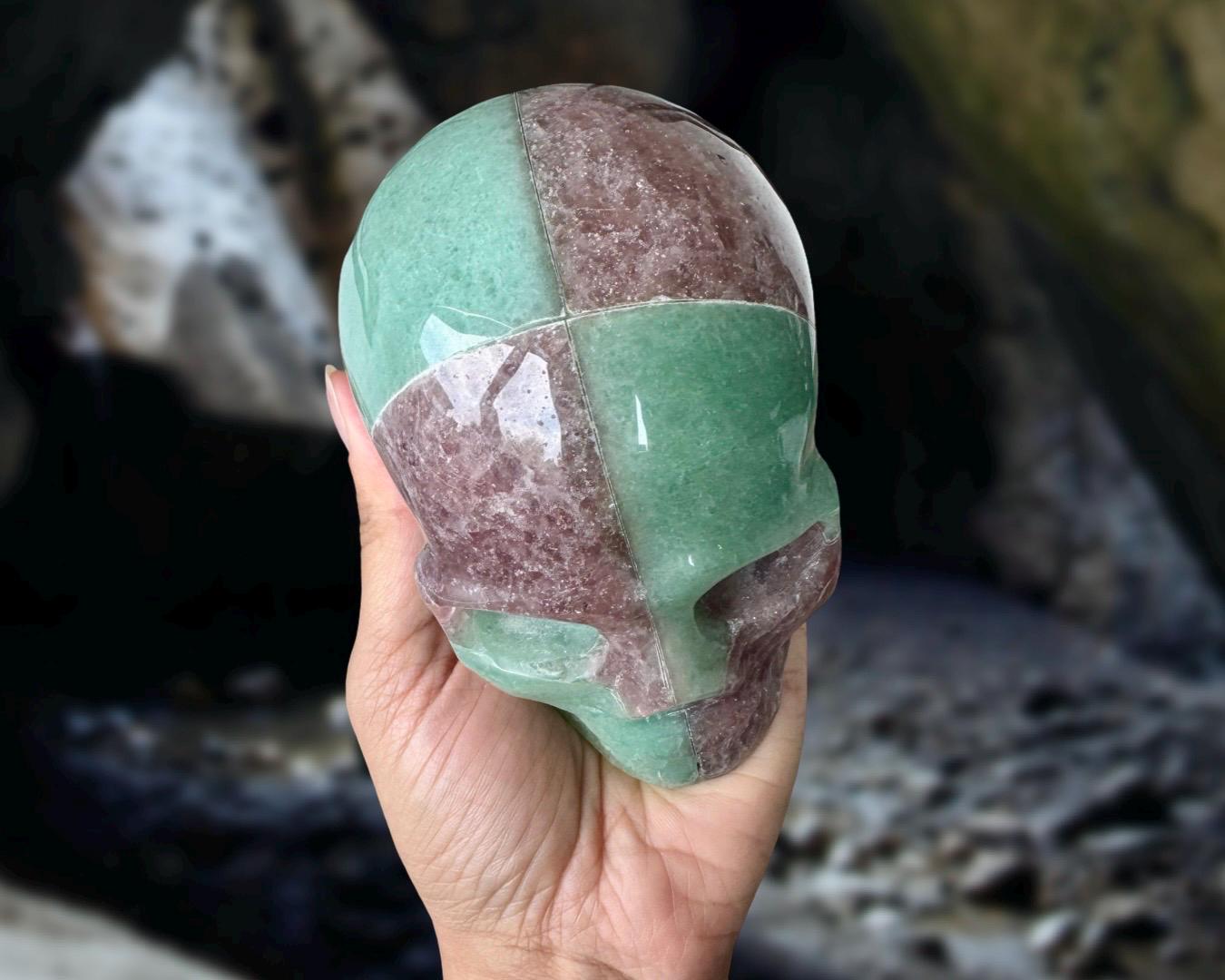 Listing Information: Large Hand-Carved Green Aventurine and Strawberry Quartz Checker Skull. Approx. 2.9 x 4.3 x 3.3 inches, 1.17 kg. You will receive the exact skull as photographed.