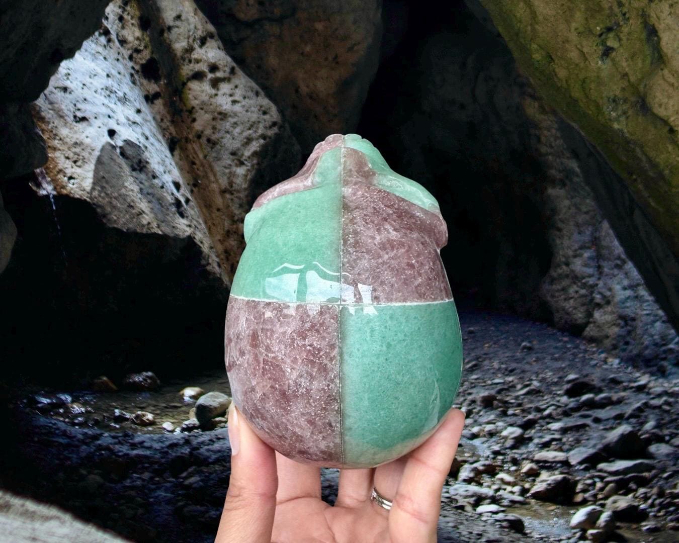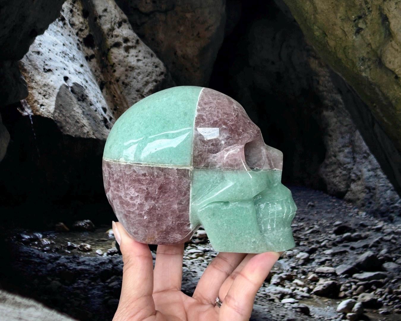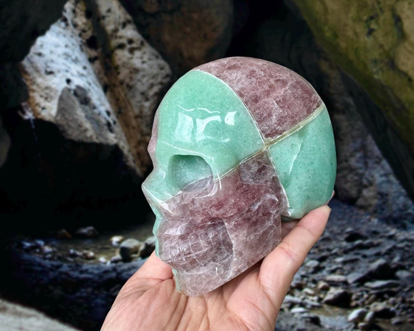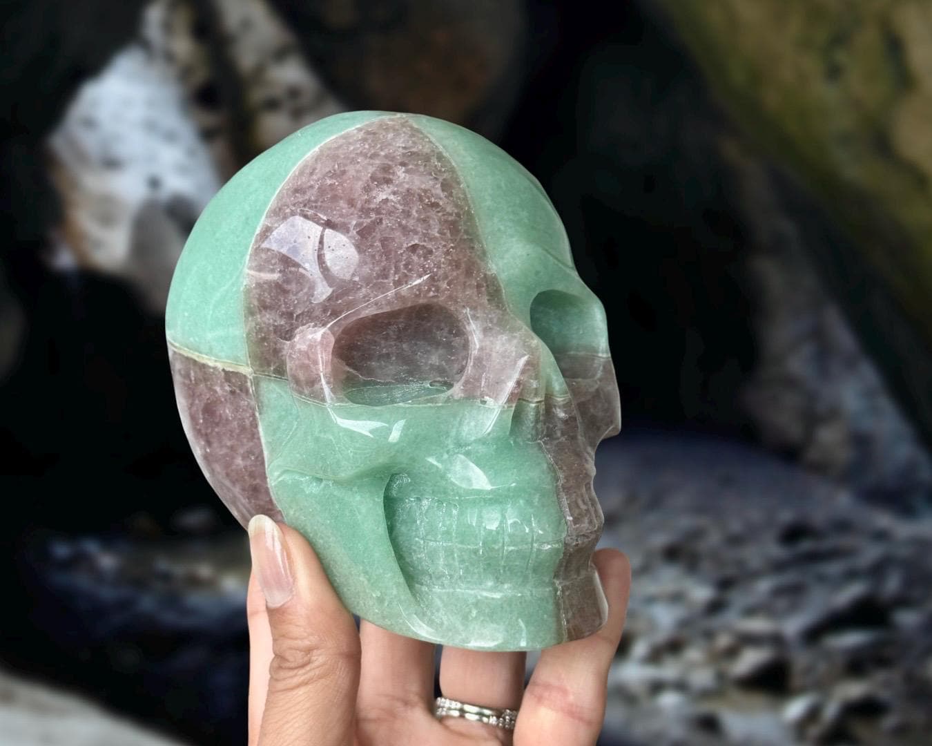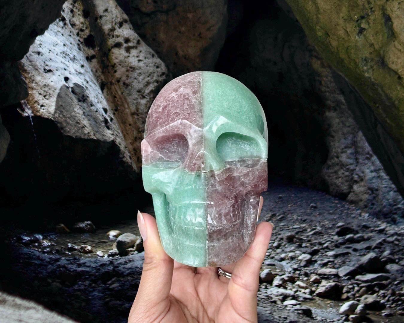 Listing Information: Large Hand-Carved Green Aventurine and Strawberry Quartz Checker Skull. Approx. 2.9 x 4.3 x 3.3 inches, 1.17 kg. You will receive the exact skull as photographed.