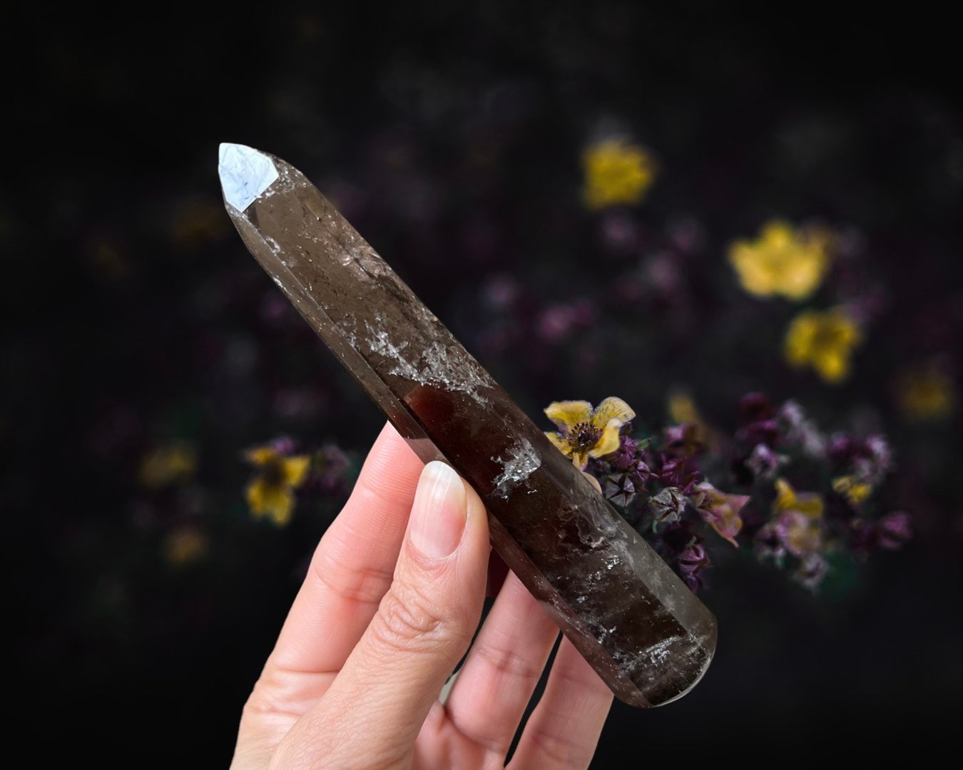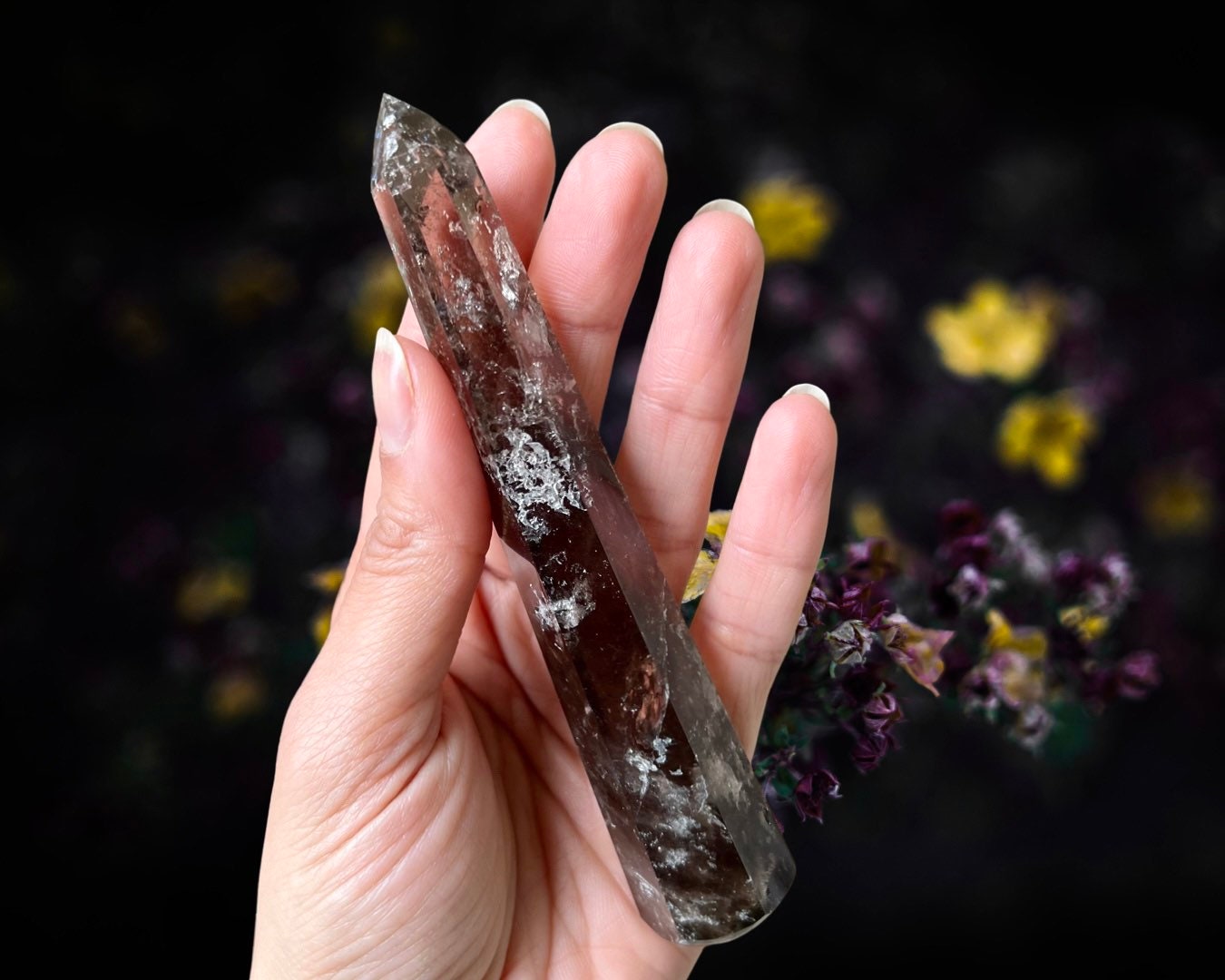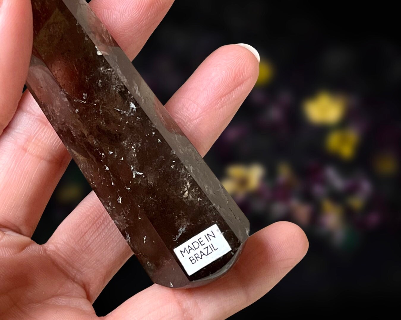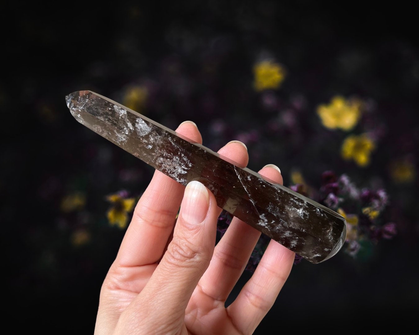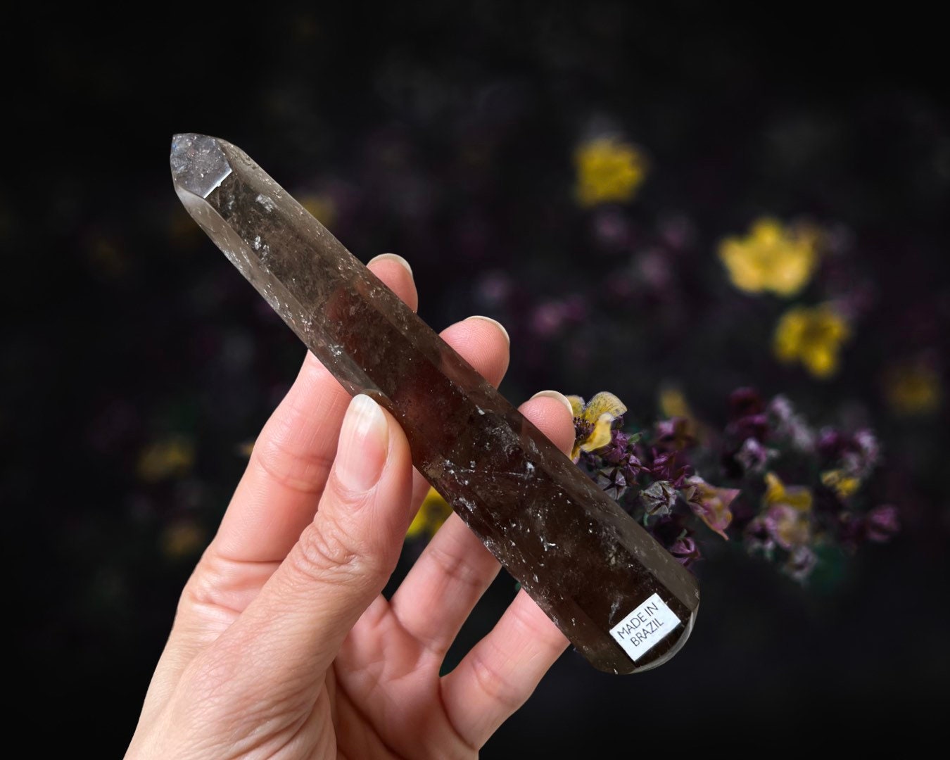 Item Information: Smoky Quartz Crystal Wand. Faceted Edges (approx. 5.1 inches, 87 grams). This wand is cut to six sides that come to a point and then highly polished. You will receive the exact item as photographed.
