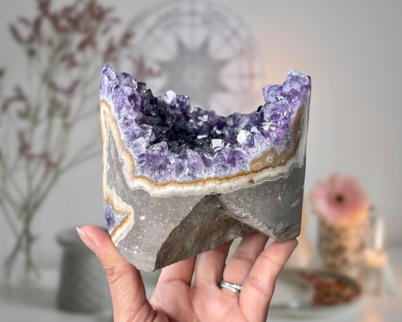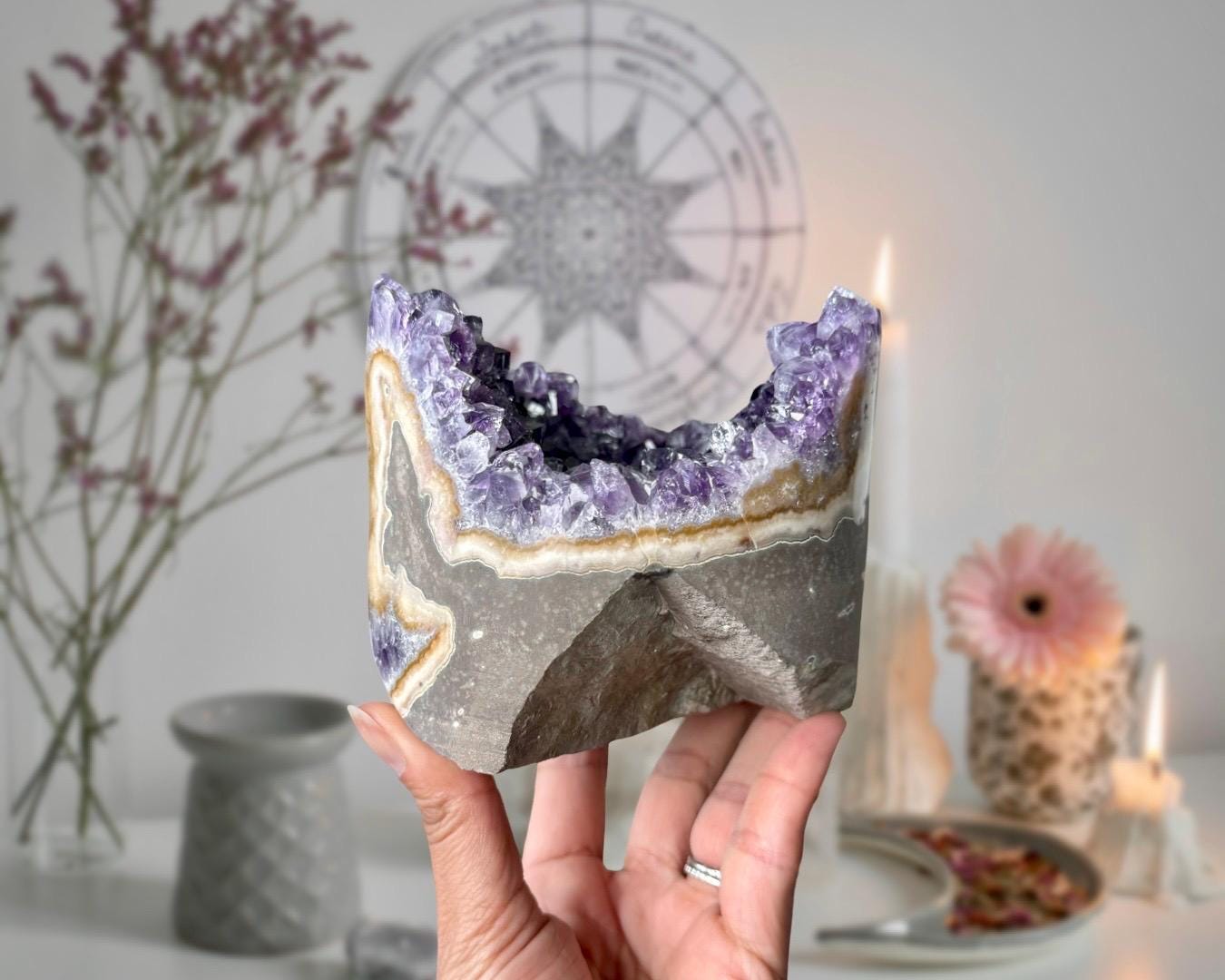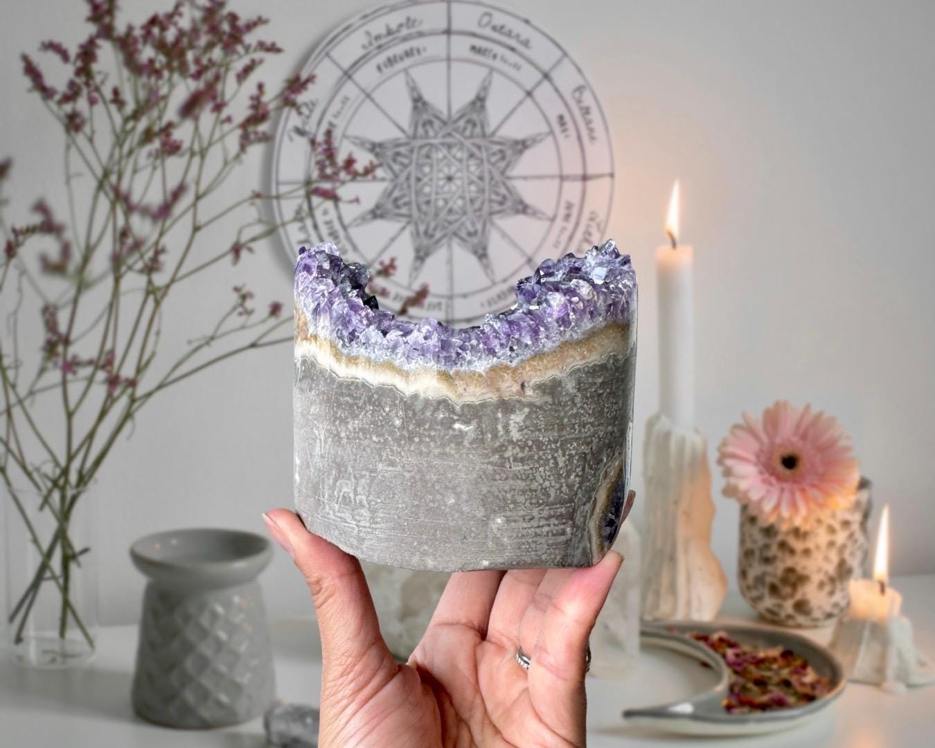 Enjoy the beauty of an Amethyst Cluster Cylinder with polished edges and a cut base for easy displaying! As a healing stone, Amethyst is helpful with calming an overworked and over stressed mind. It dispels negativity and creates a peaceful environment, making it a wonderful piece to add to your home decor.