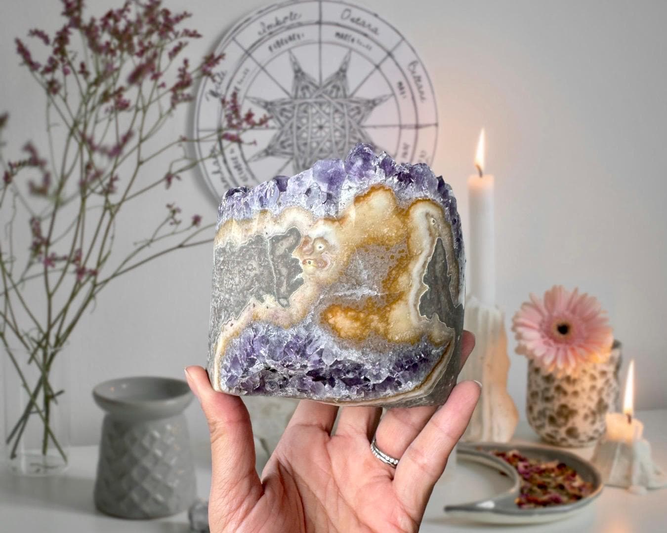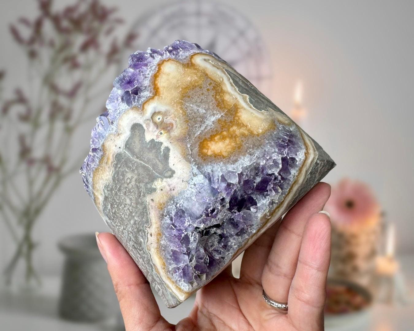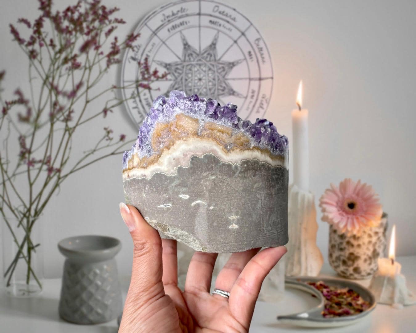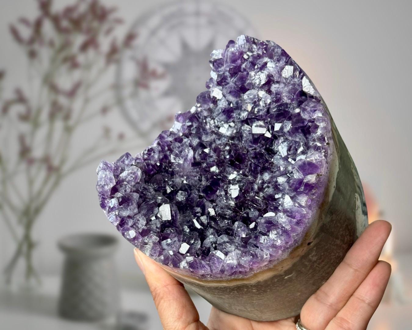 Enjoy the beauty of an Amethyst Cluster Cylinder with polished edges and a cut base for easy displaying! As a healing stone, Amethyst is helpful with calming an overworked and over stressed mind. It dispels negativity and creates a peaceful environment, making it a wonderful piece to add to your home decor.
