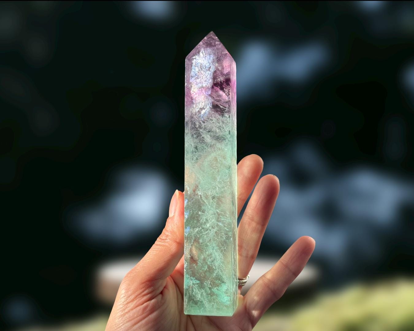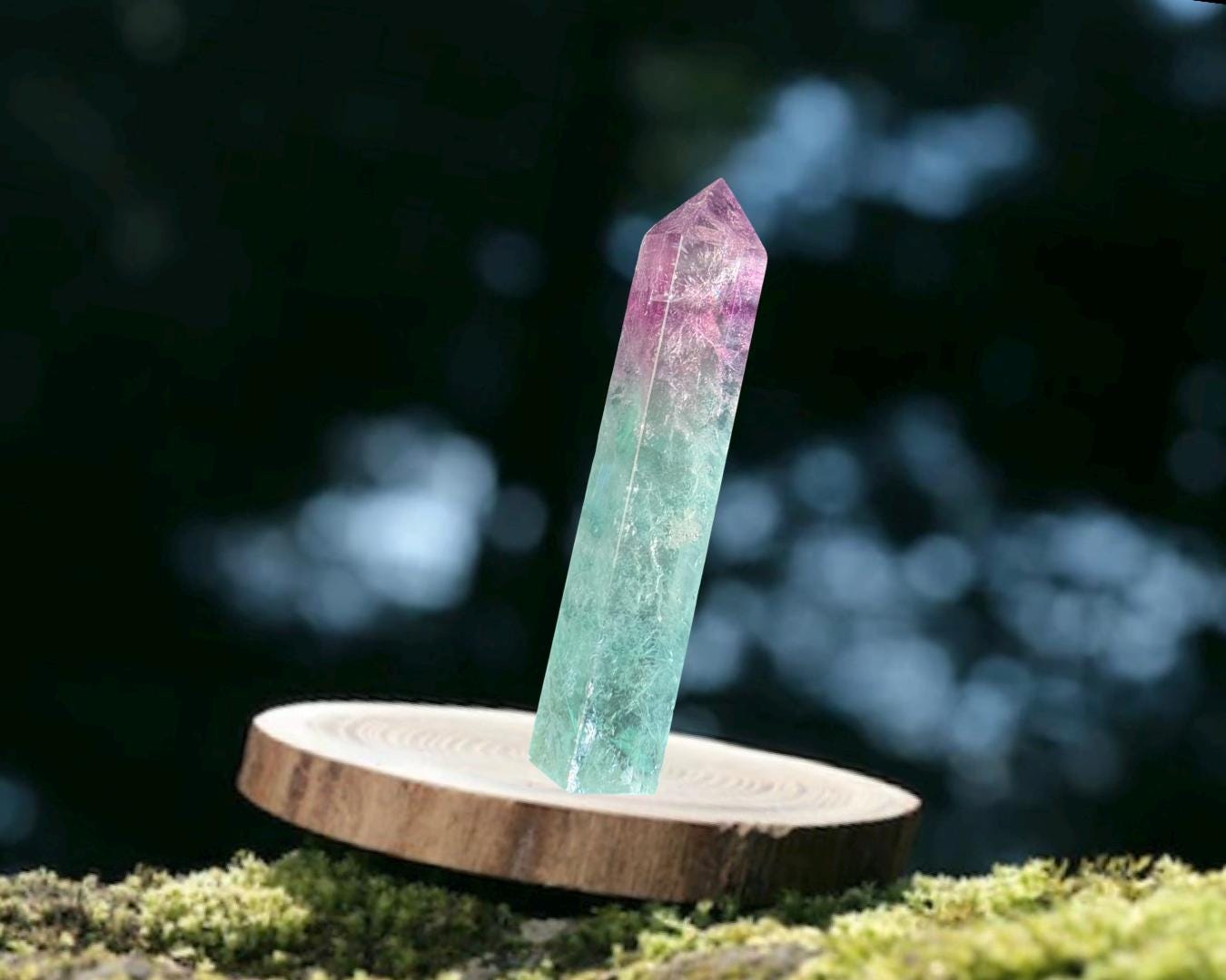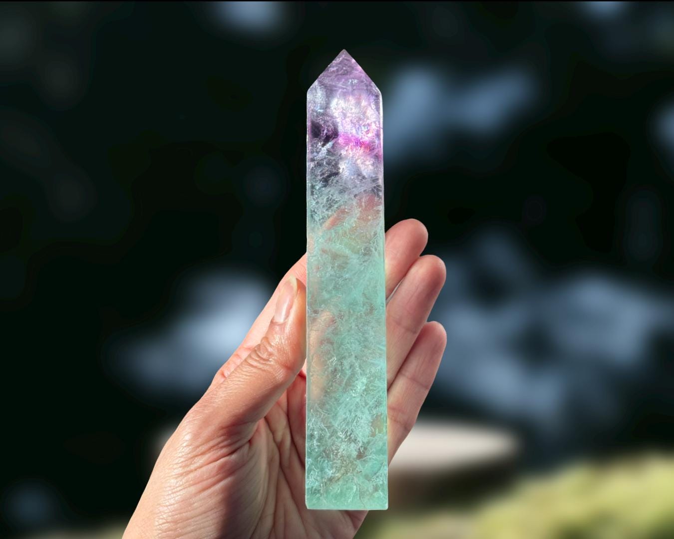 Listing Information: Watermelon Fluorite Obelisk (approx. 6 (H) x 0.90 (W) x 0.80 (D) inches, 270 grams).