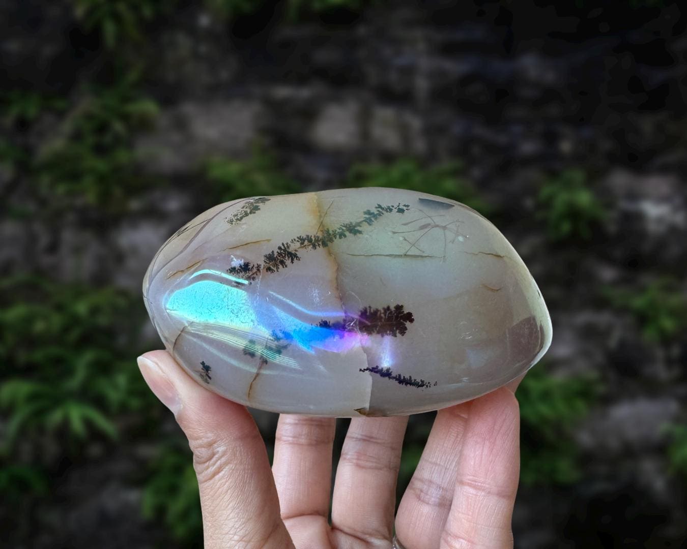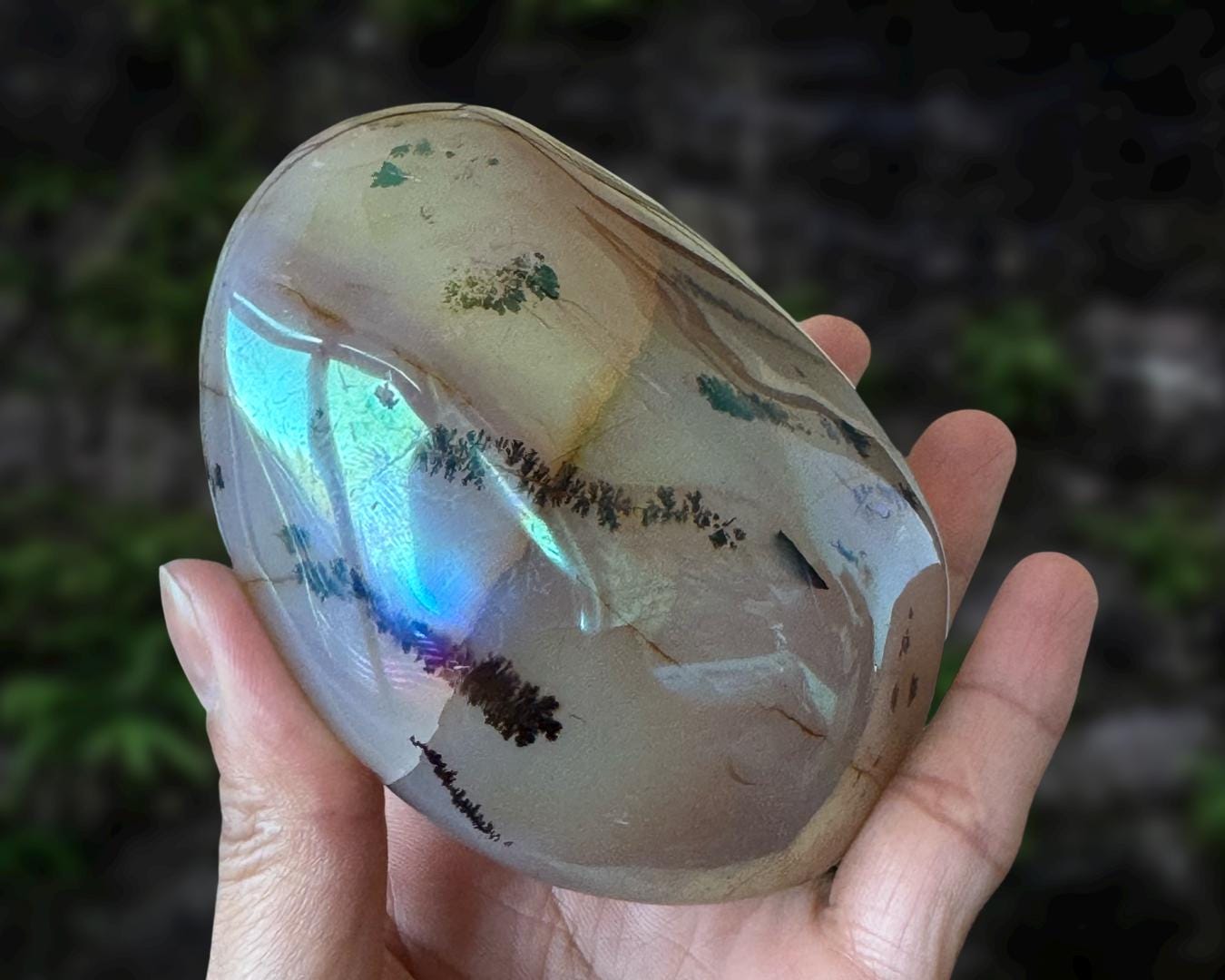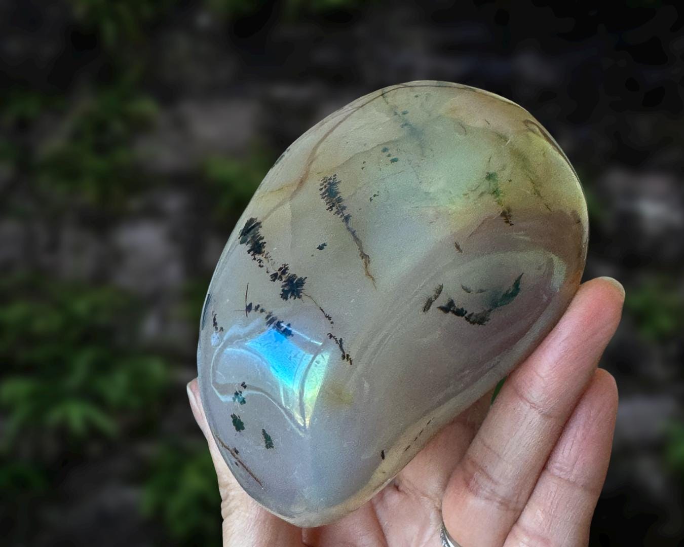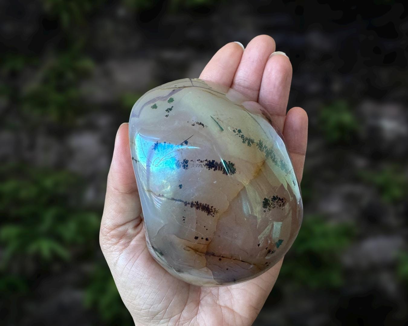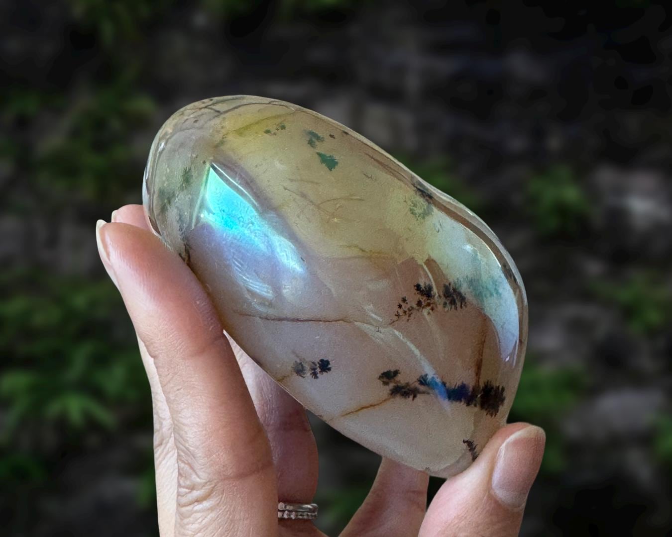 Listing information: Aura Moss Agate Free Form Crystal. Approx. 3.8 (L) x 3.0 (W) x 1.7 (H) inches, 530 grams.