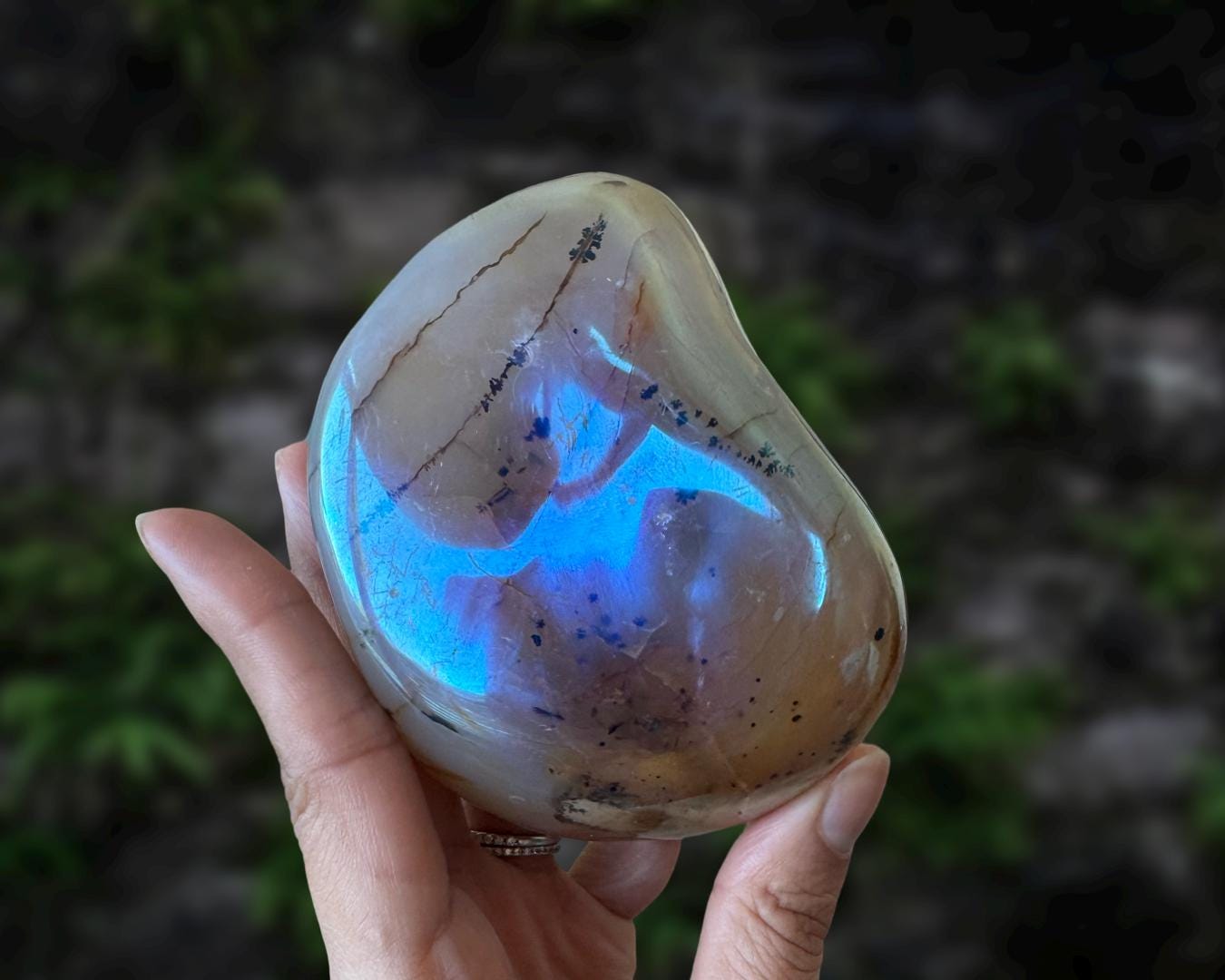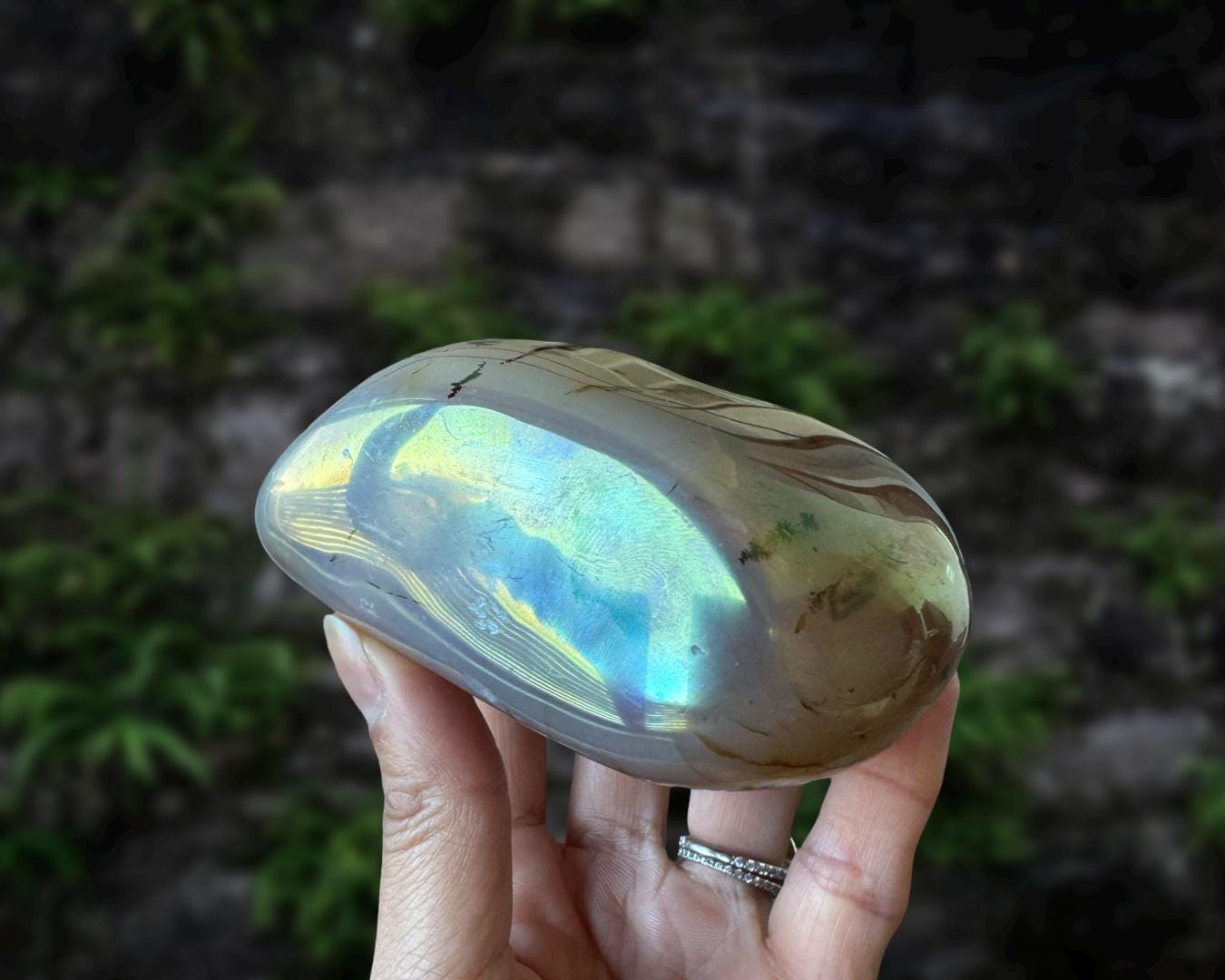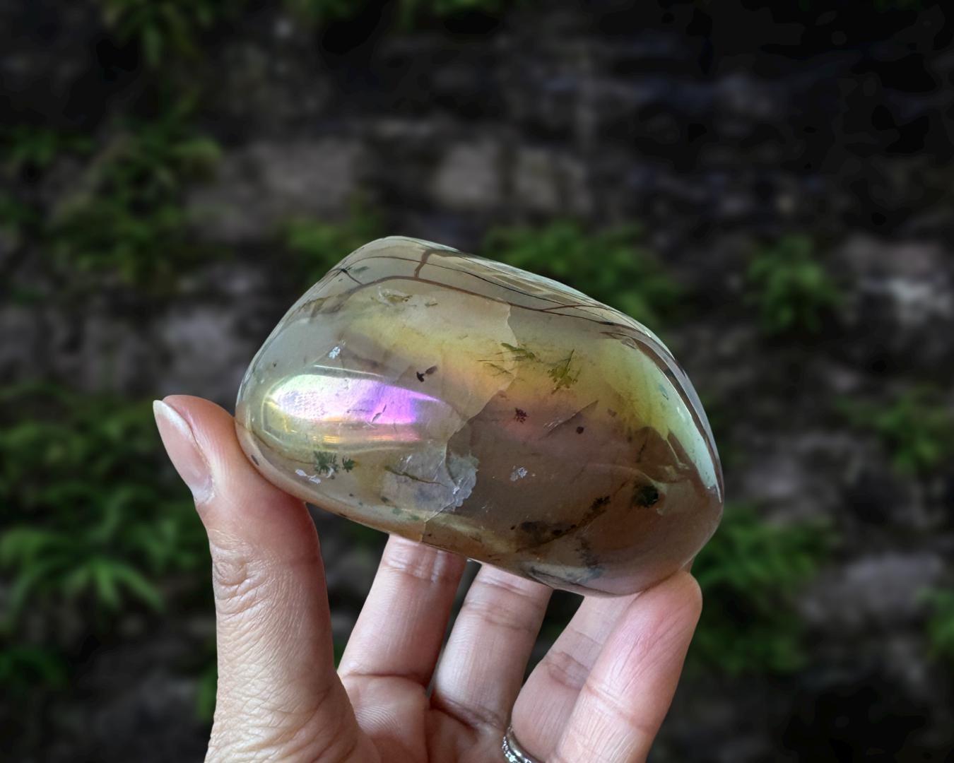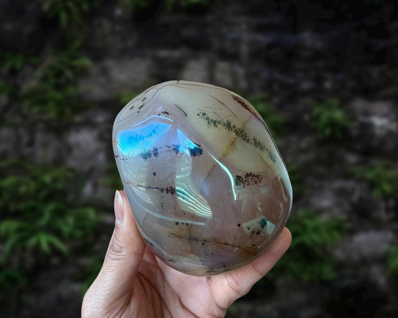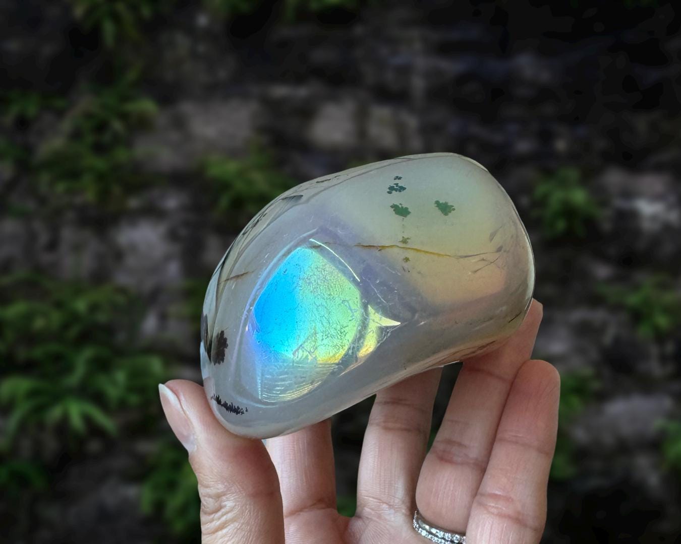 Listing information: Aura Moss Agate Free Form Crystal. Approx. 3.8 (L) x 3.0 (W) x 1.7 (H) inches, 530 grams.