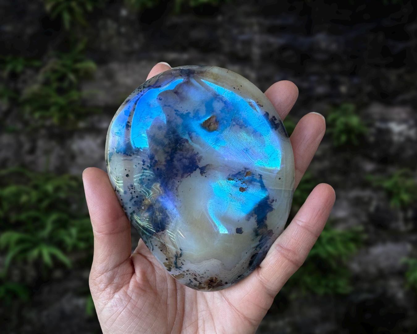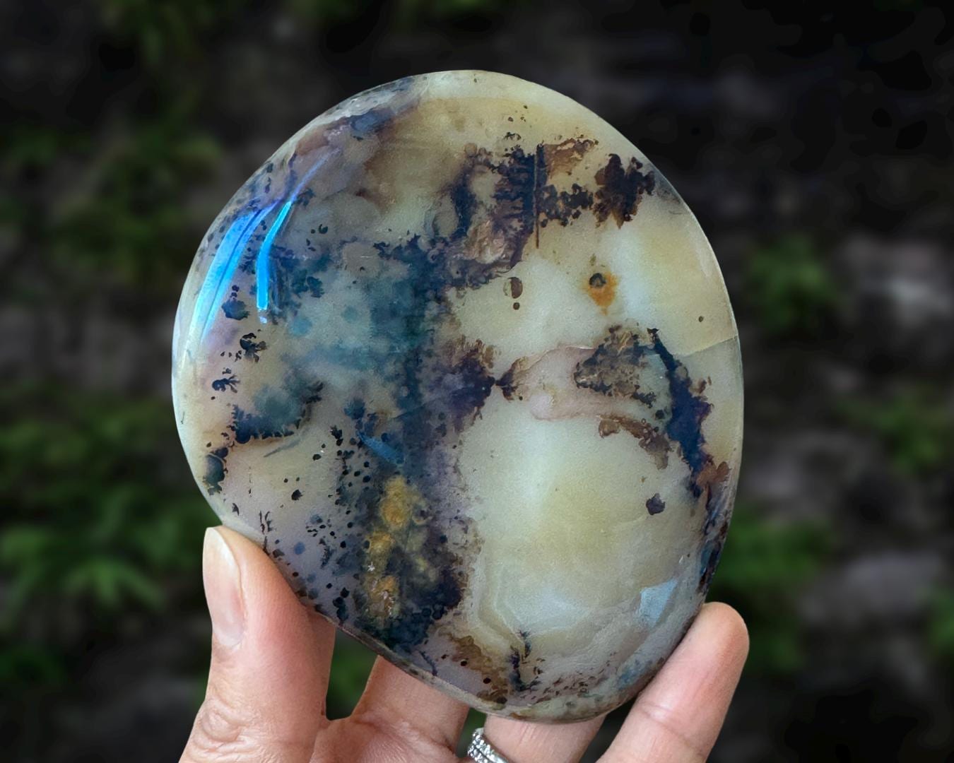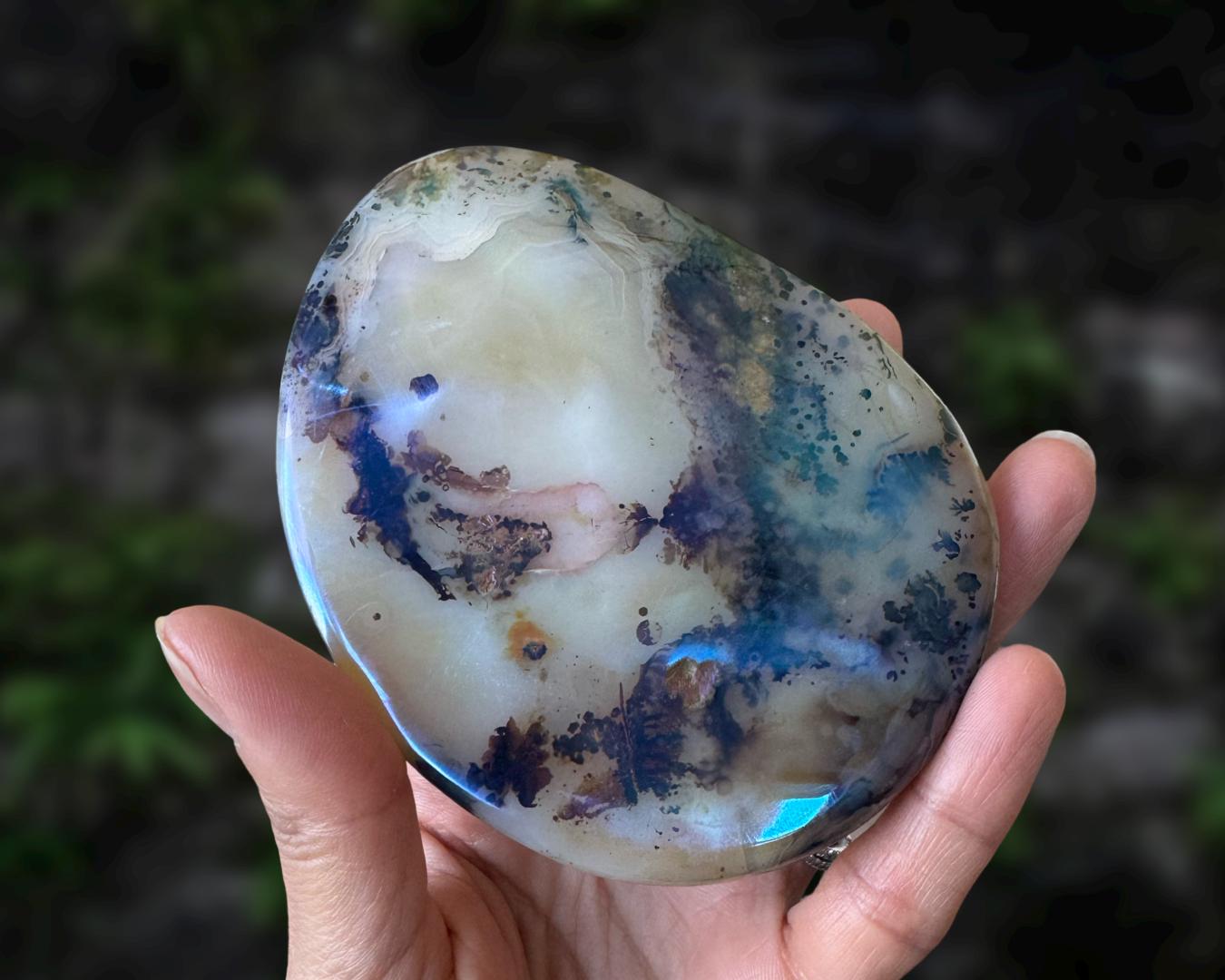 Listing information: Aura Moss Agate Free Form Crystal. Approx. 4.1 (L) x 3.2 (W) x 0.60 (H) inches, 206 grams.