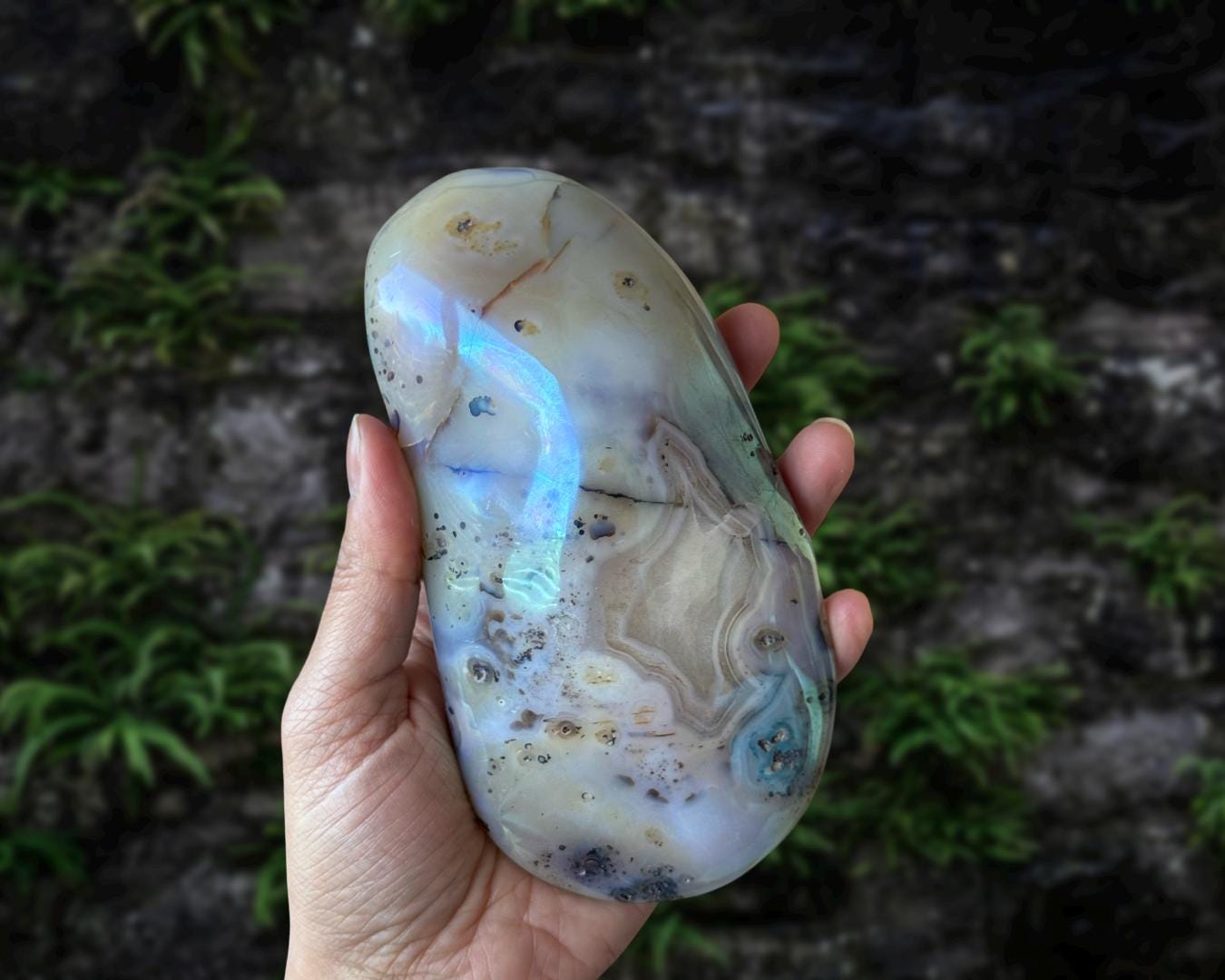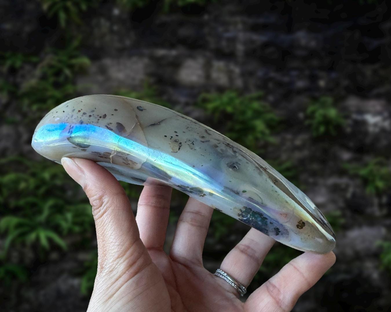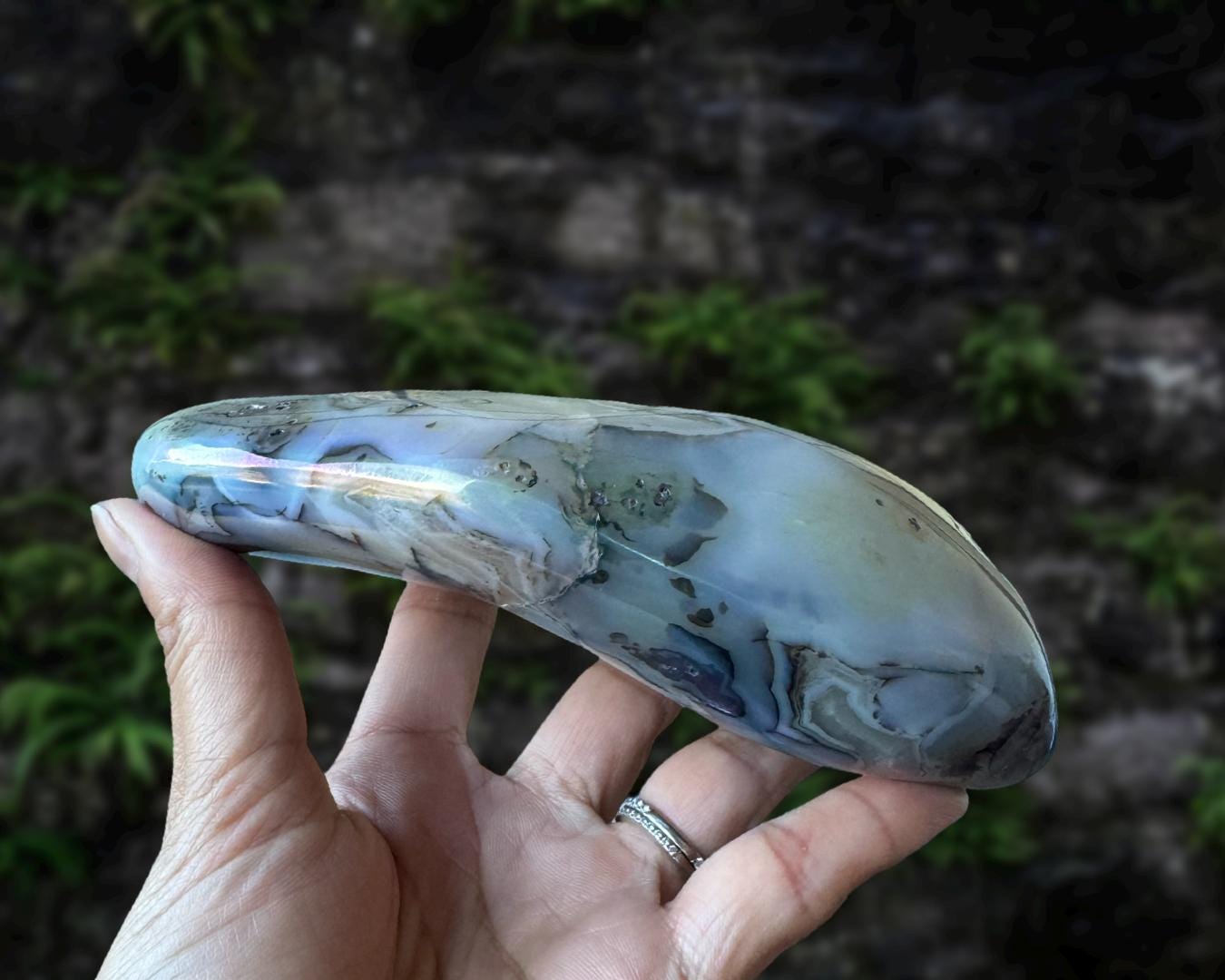 Listing information: Aura Moss Agate Free Form Crystal. Approx. 5.9 (L) x 3.0 (W) x 1.7 (H) inches, 645 grams.