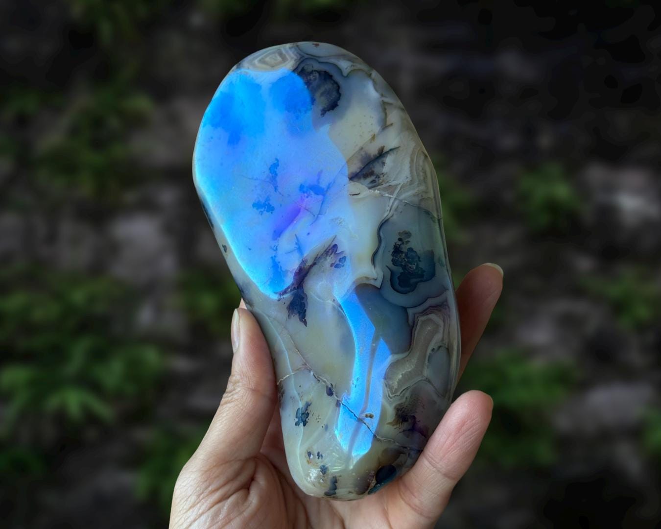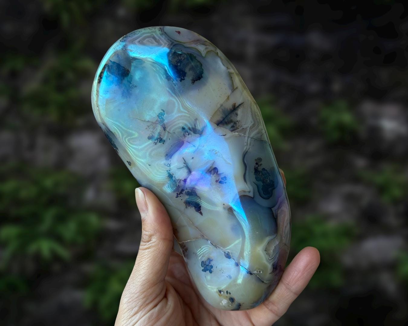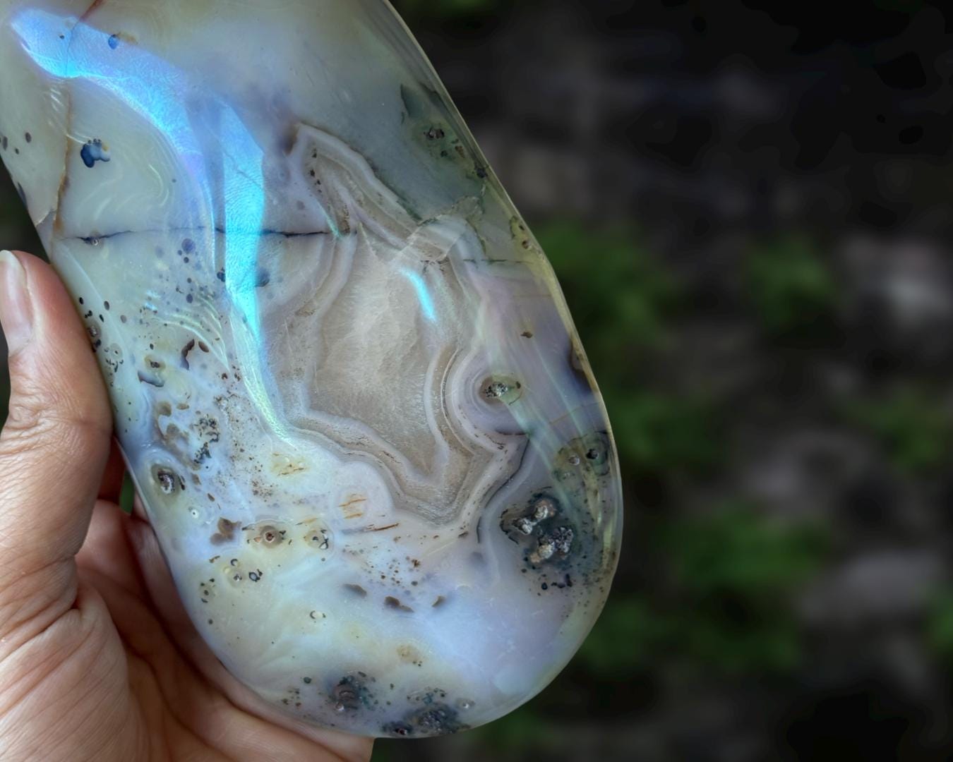 Listing information: Aura Moss Agate Free Form Crystal. Approx. 5.9 (L) x 3.0 (W) x 1.7 (H) inches, 645 grams.