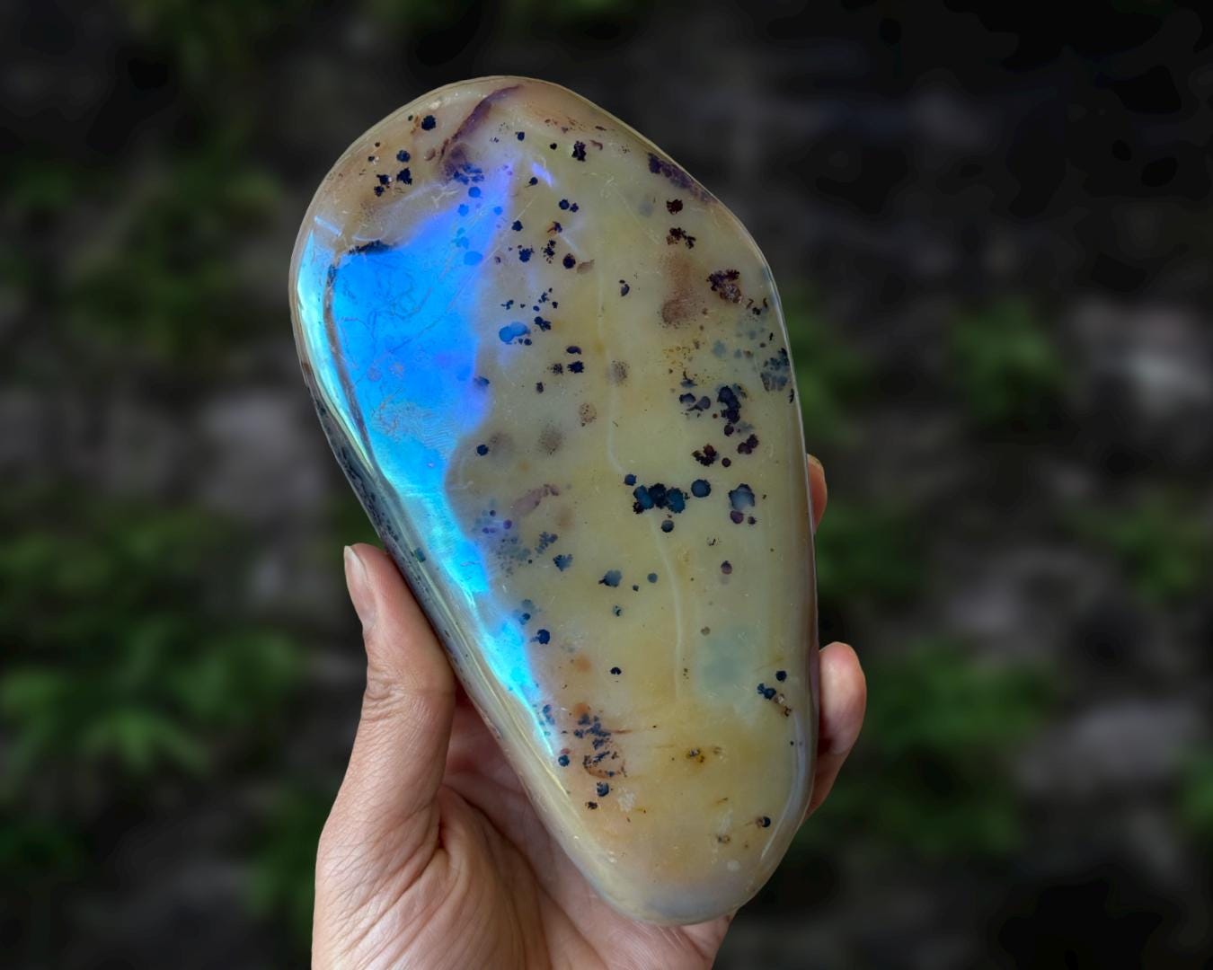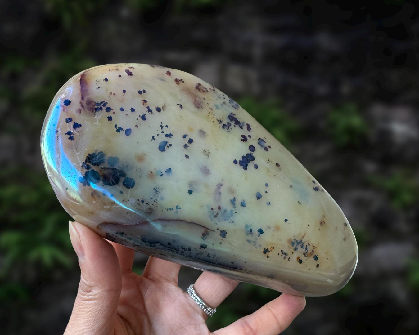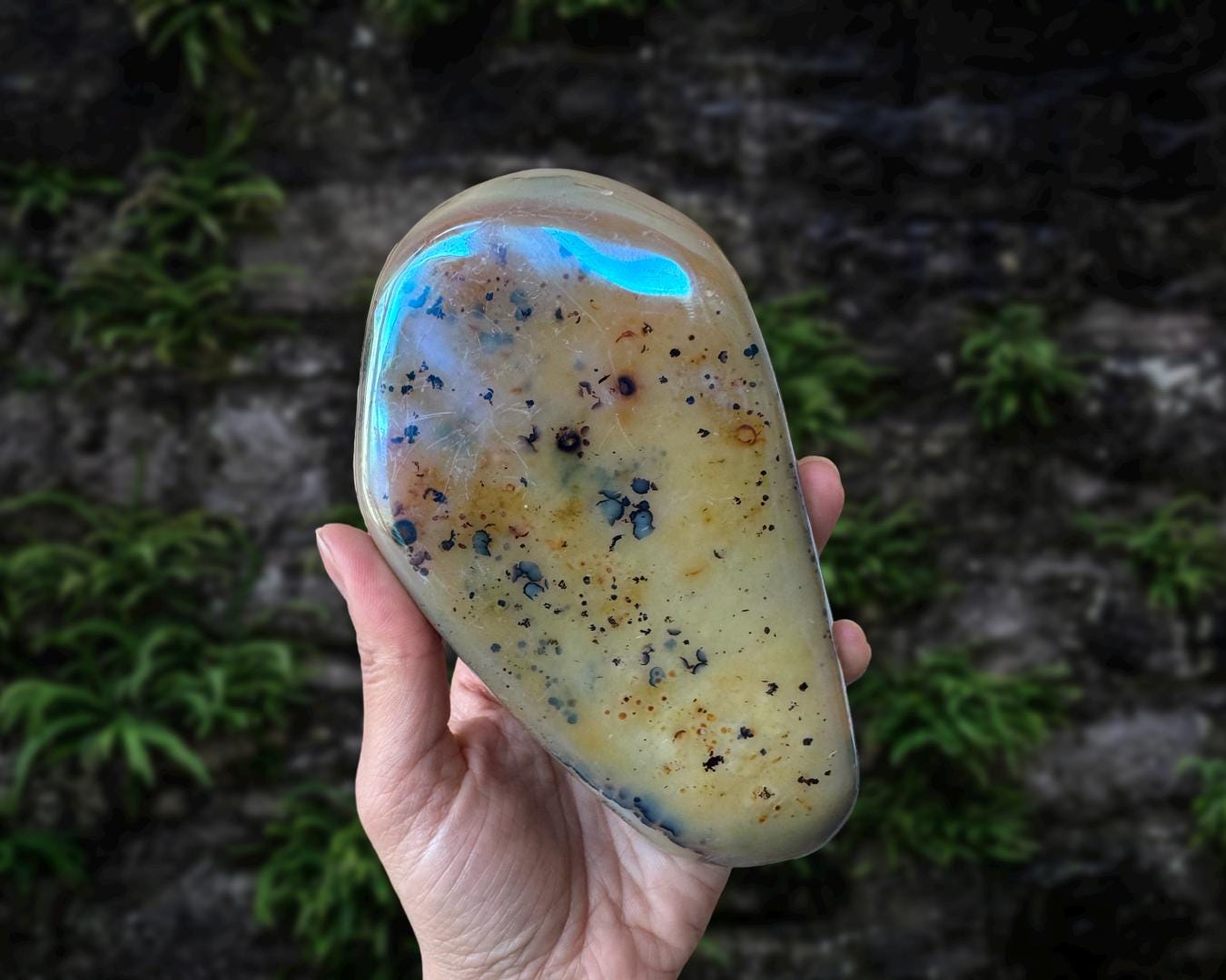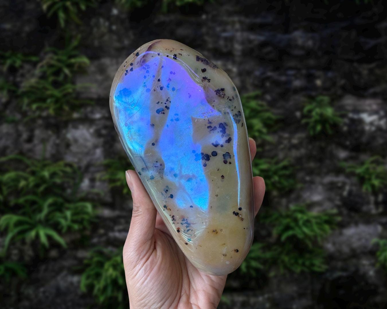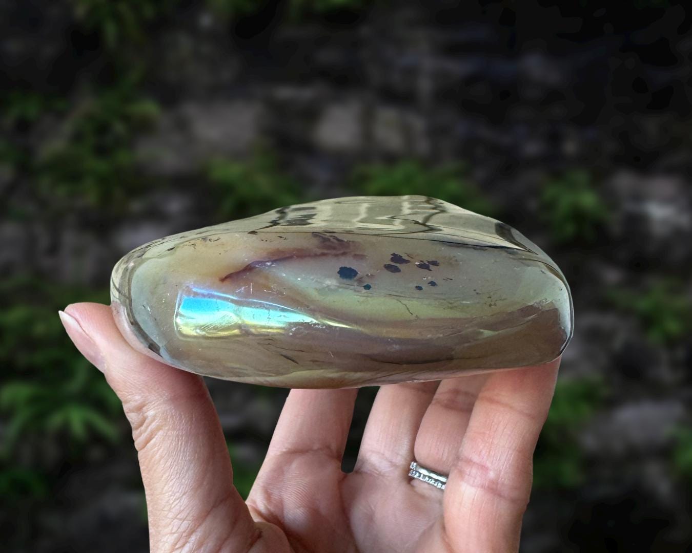 Listing information: Aura Moss Agate Free Form Crystal. Approx. 6.2 (L) x 3.4 (W) x 1.2 (H) inches, 625 grams.