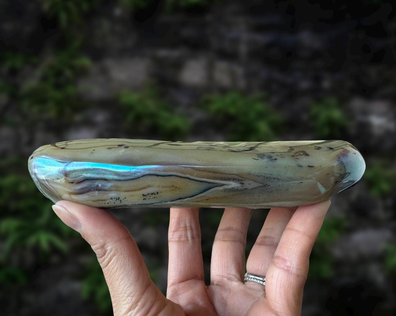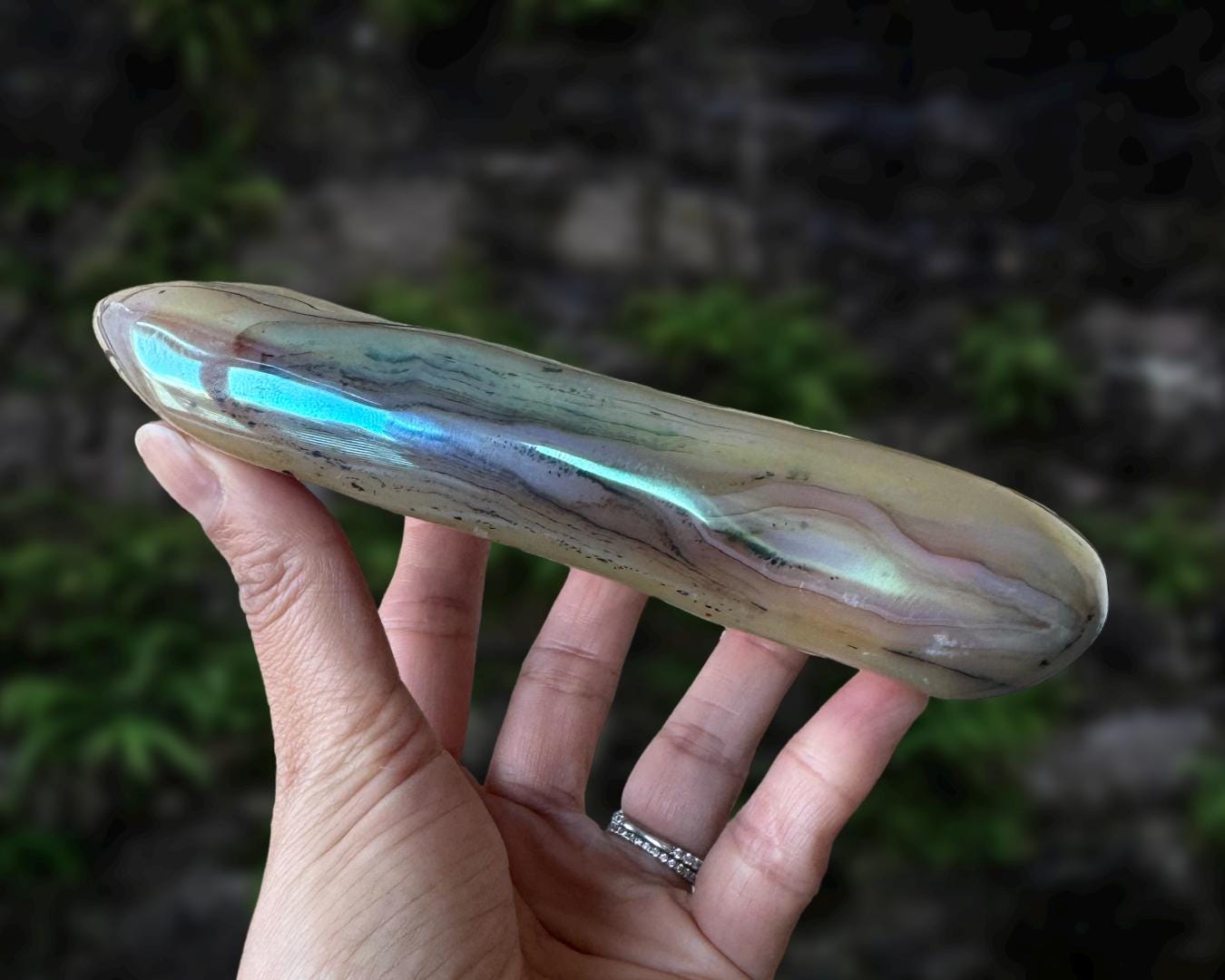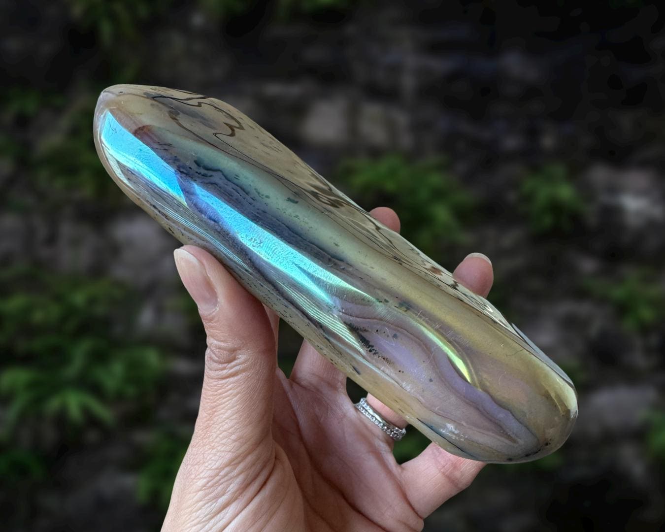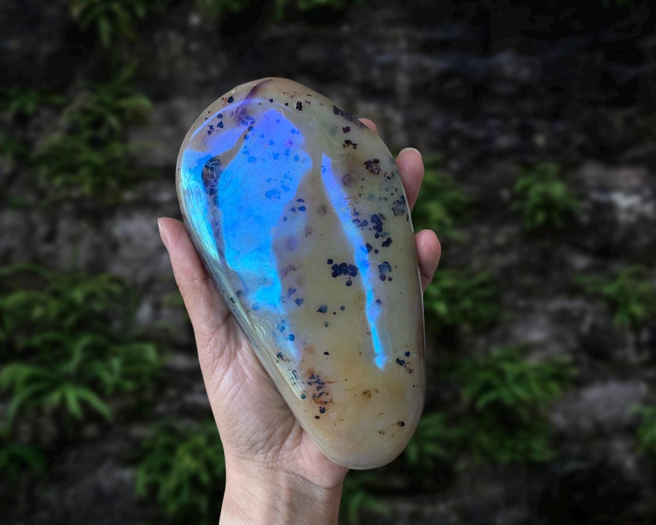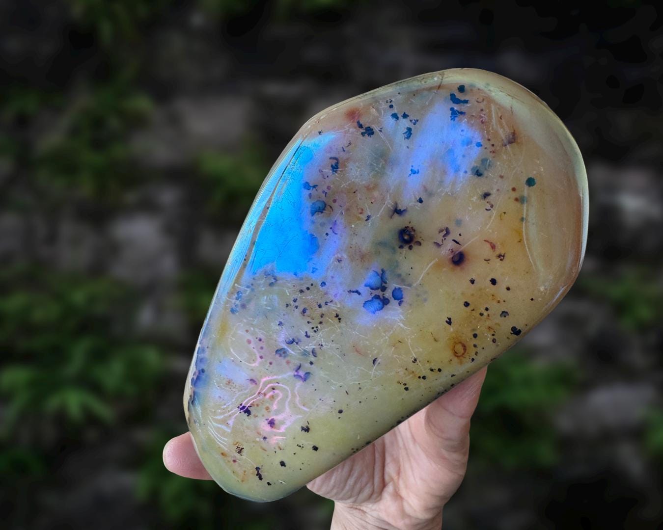 Listing information: Aura Moss Agate Free Form Crystal. Approx. 6.2 (L) x 3.4 (W) x 1.2 (H) inches, 625 grams.
