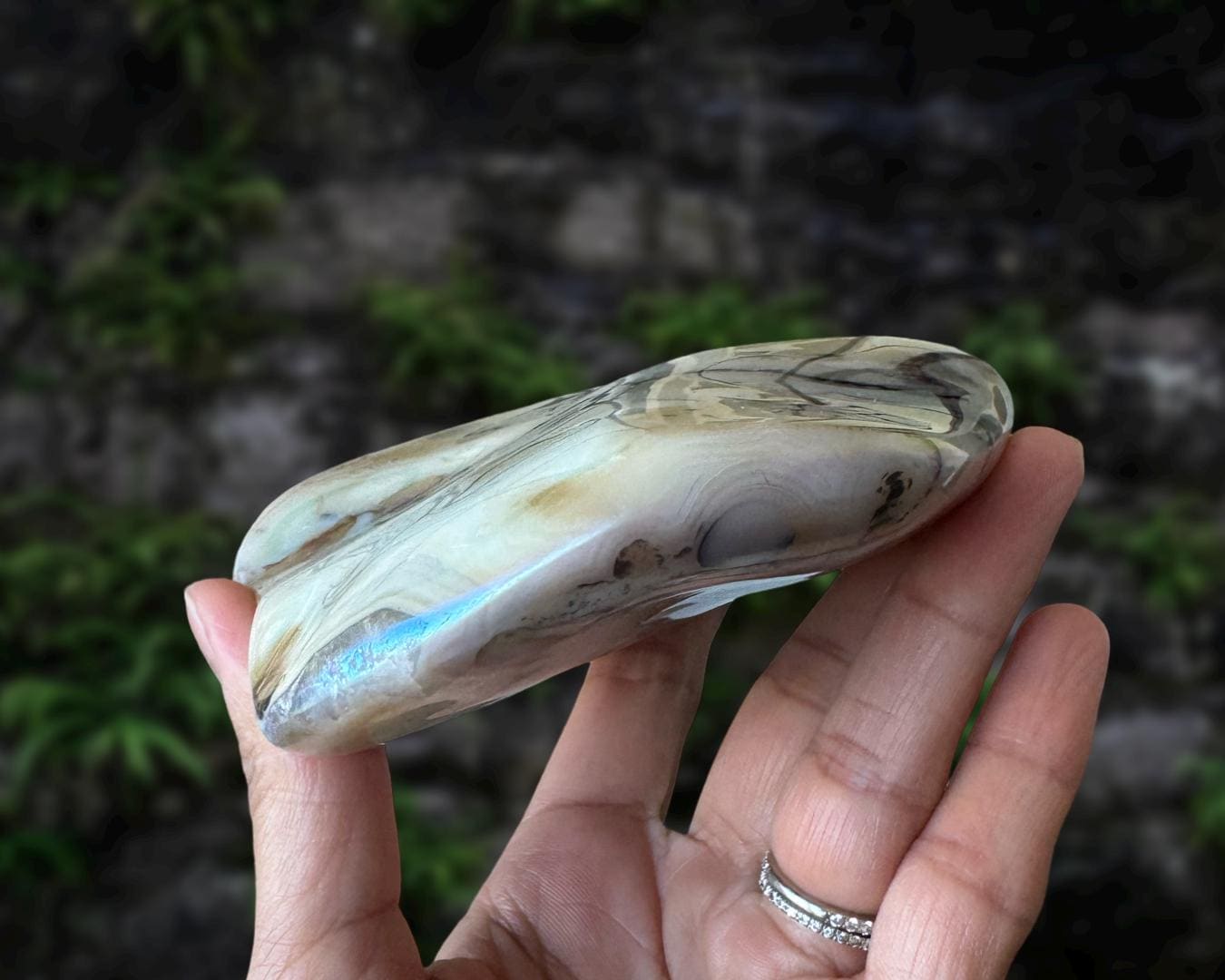 Moss agate is said to encourage tranquillity and emotional balance. It’s useful for those who experience strong aggression or overly nurturing emotions, helping to balance male and female energies whenever they become too extreme.