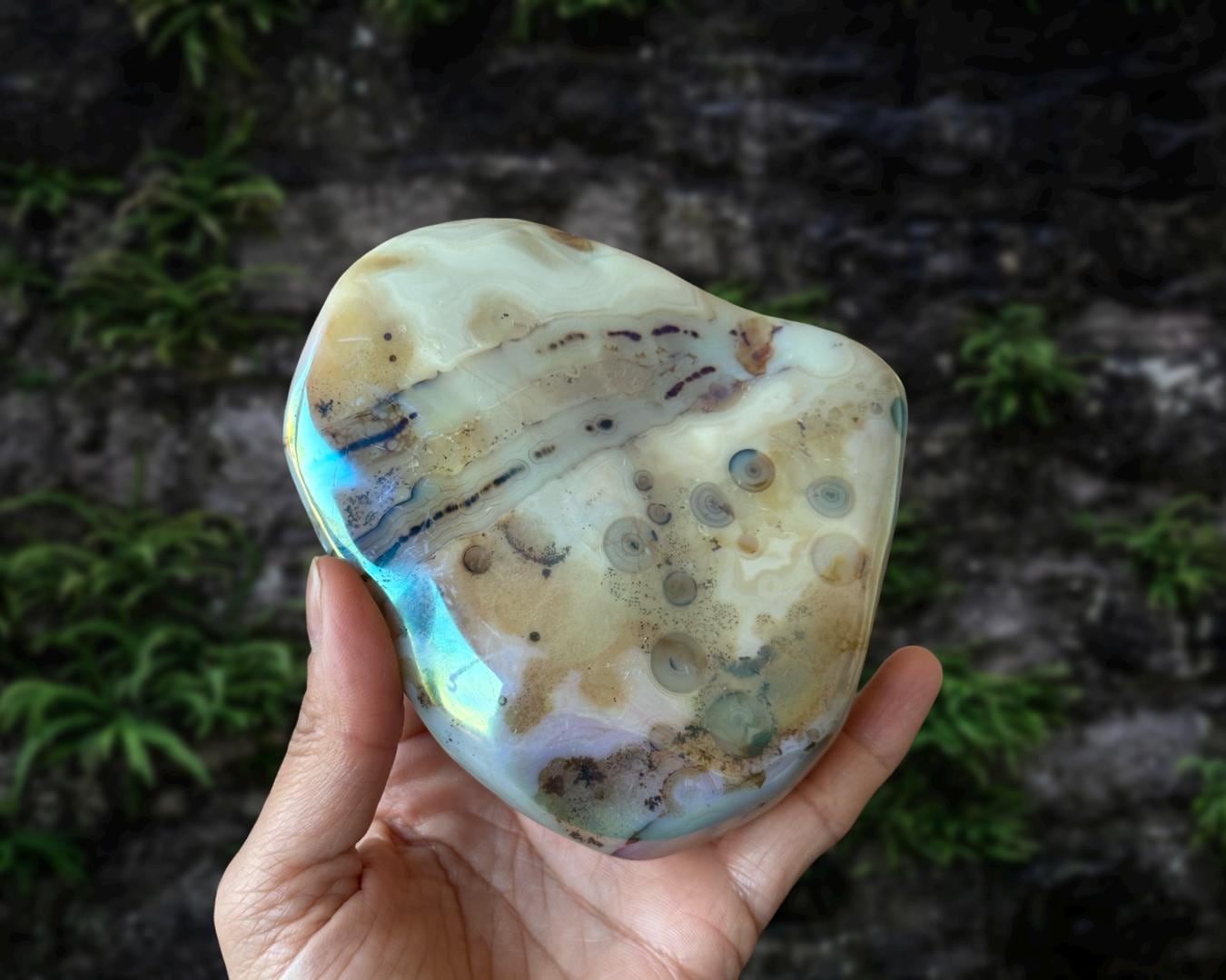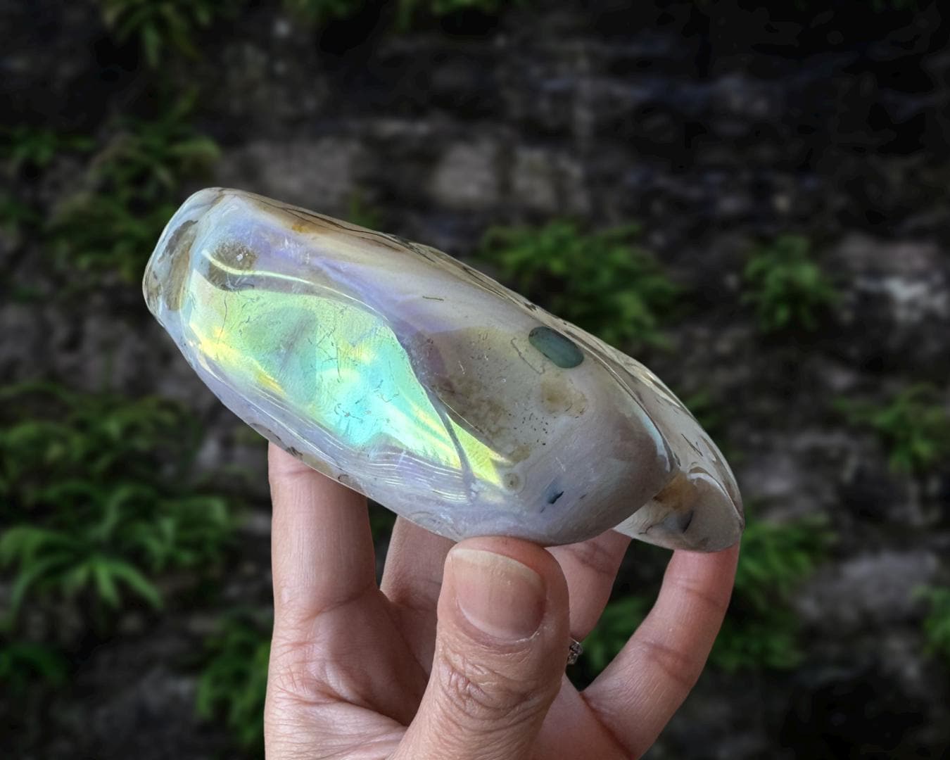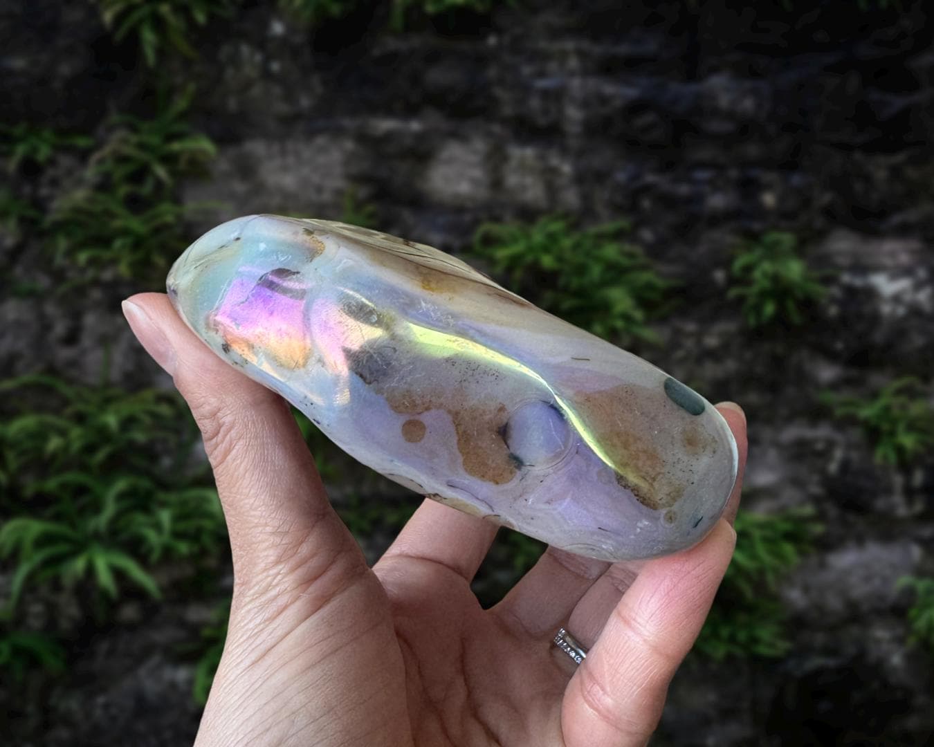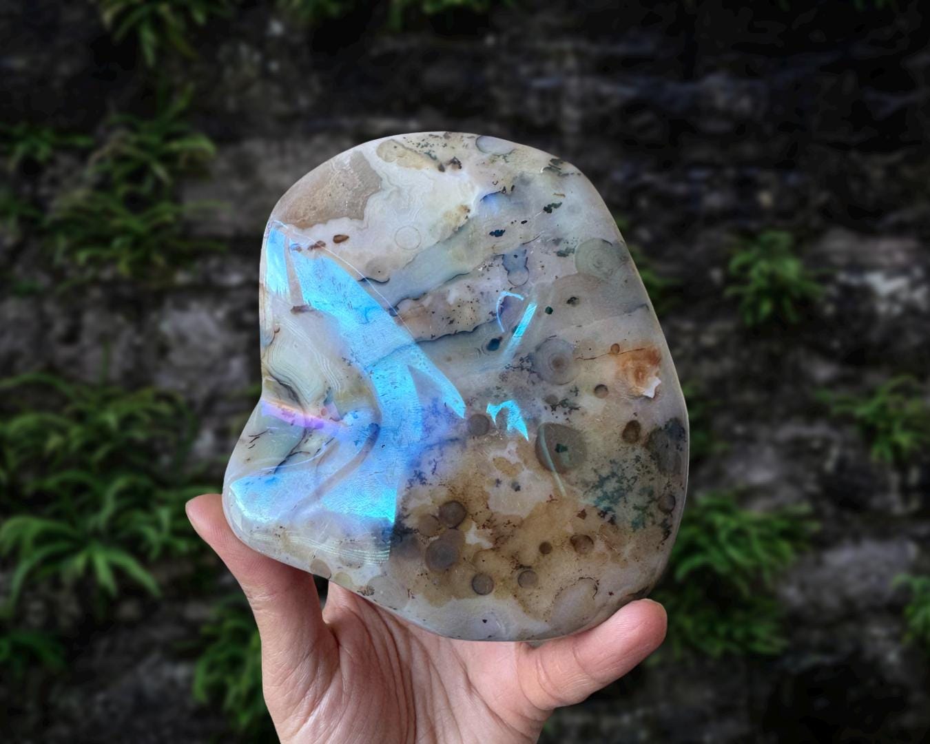 Listing information: Aura Moss Agate Free Form Crystal. Approx. 4.7 (L) x 4.3 (W) x 1.4 (H) inches, 565 grams.