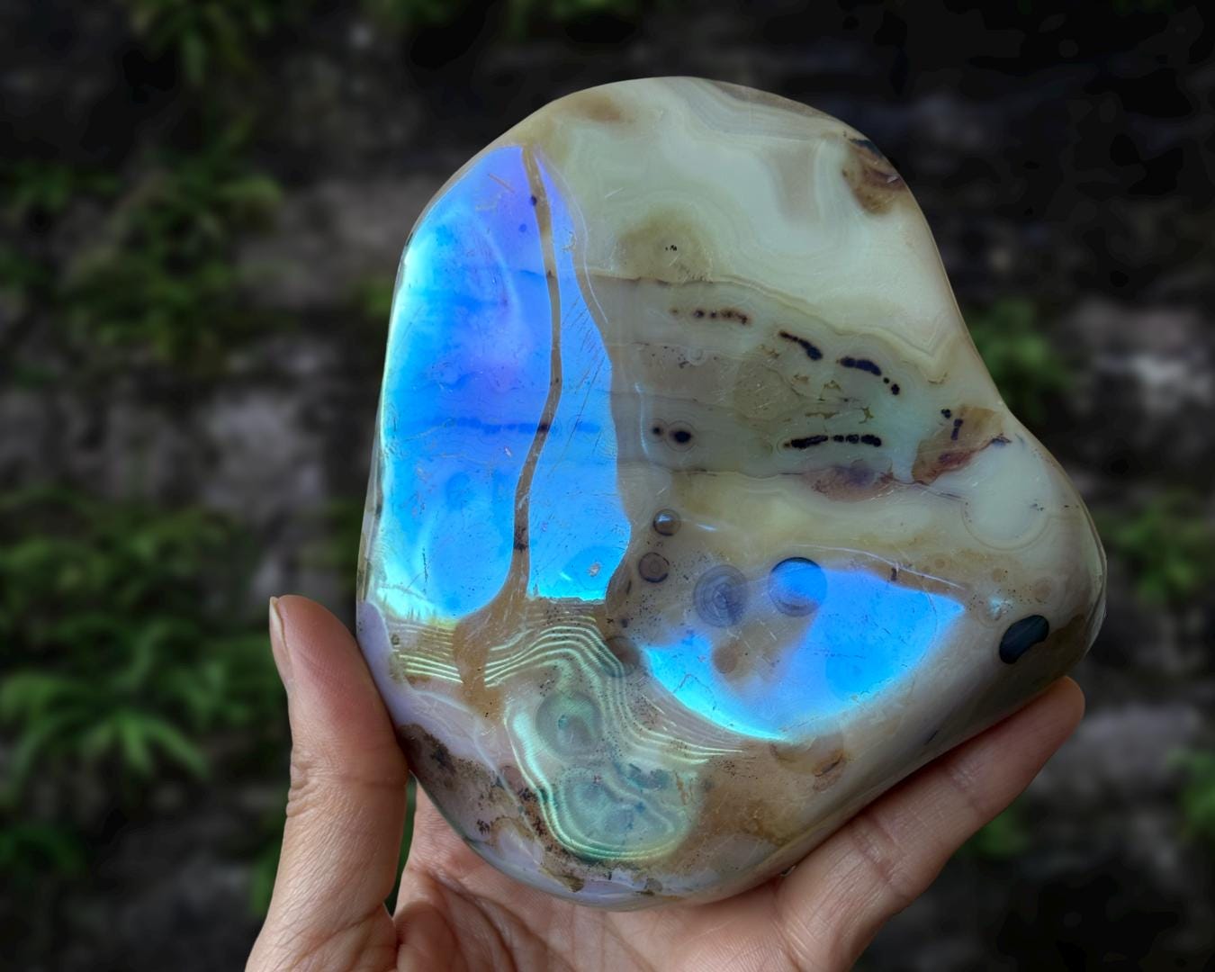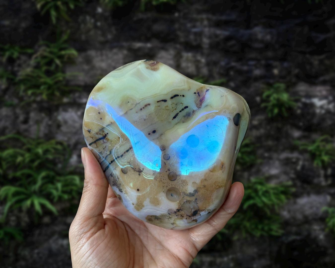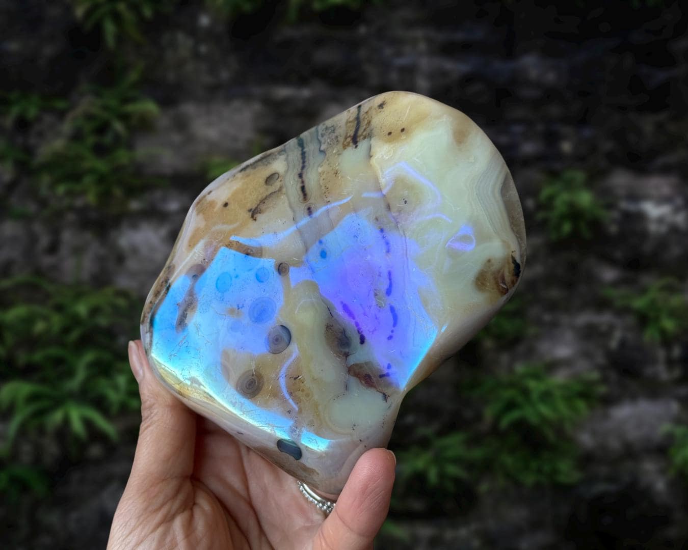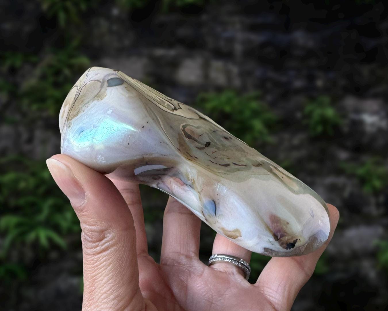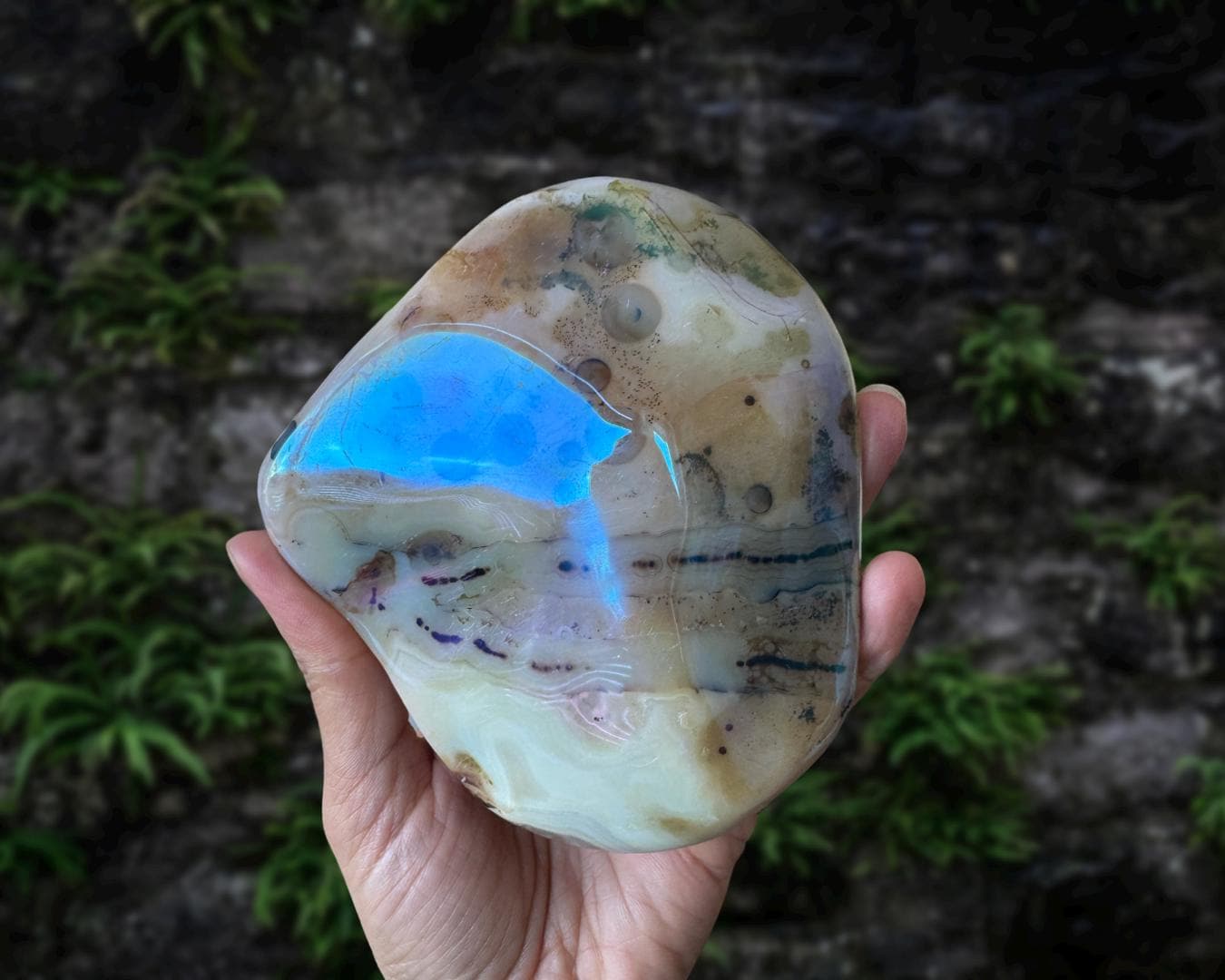 Listing information: Aura Moss Agate Free Form Crystal. Approx. 4.7 (L) x 4.3 (W) x 1.4 (H) inches, 565 grams.