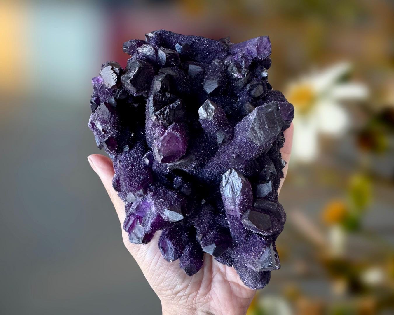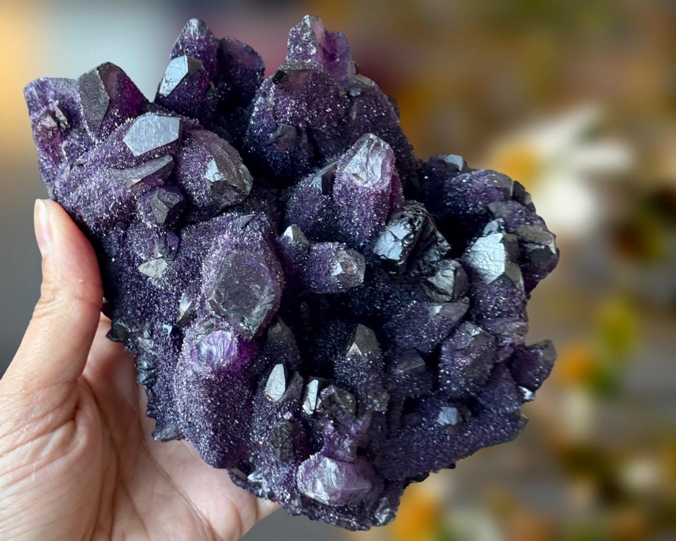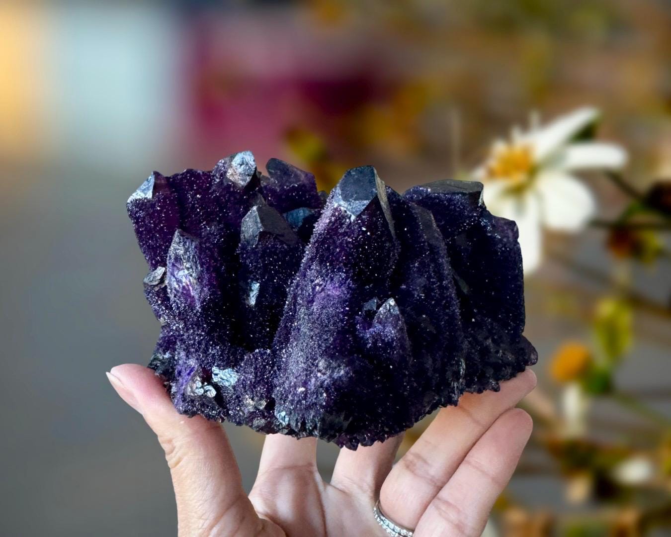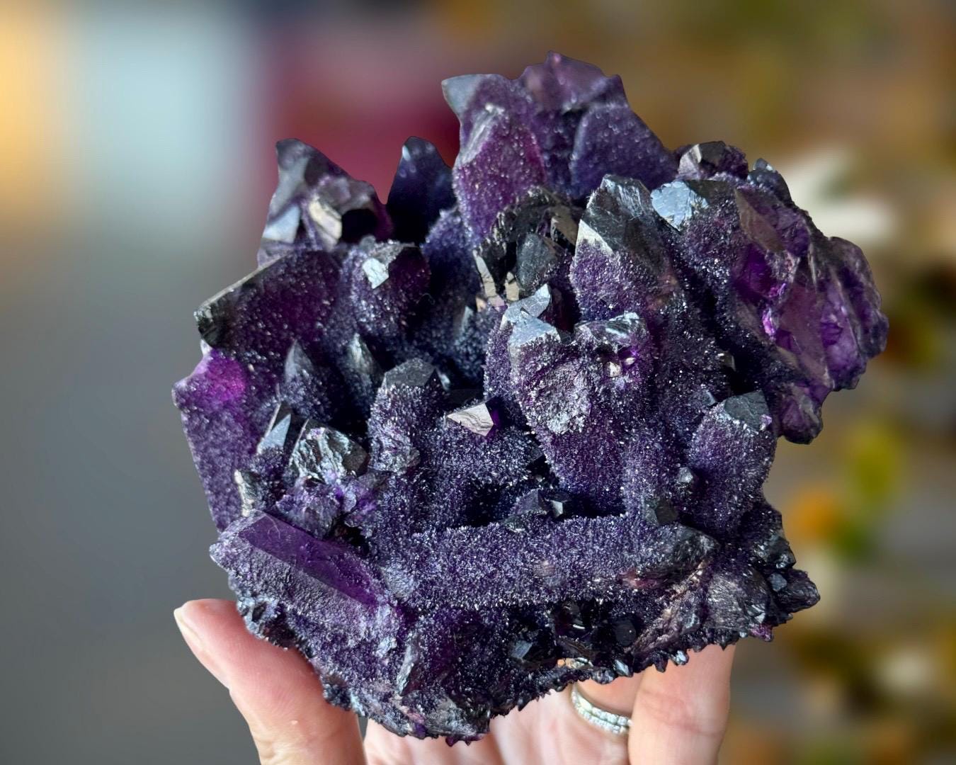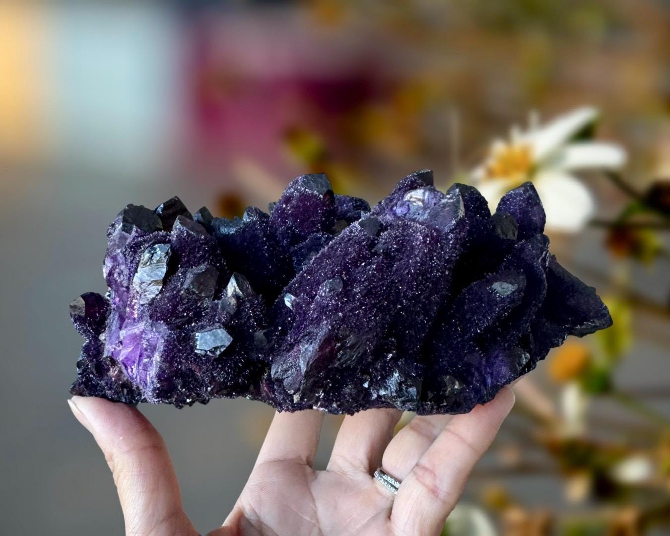 Majestic Manganese Purple Quartz Cluster • Approx. 6.5 (W) x 2.6 (H) x 4.8 (D), 1139 grams • This druzy quartz has been treated under pressure with an ionic salt and manganese at high temperatures to produce the majestic purple and dark tips.