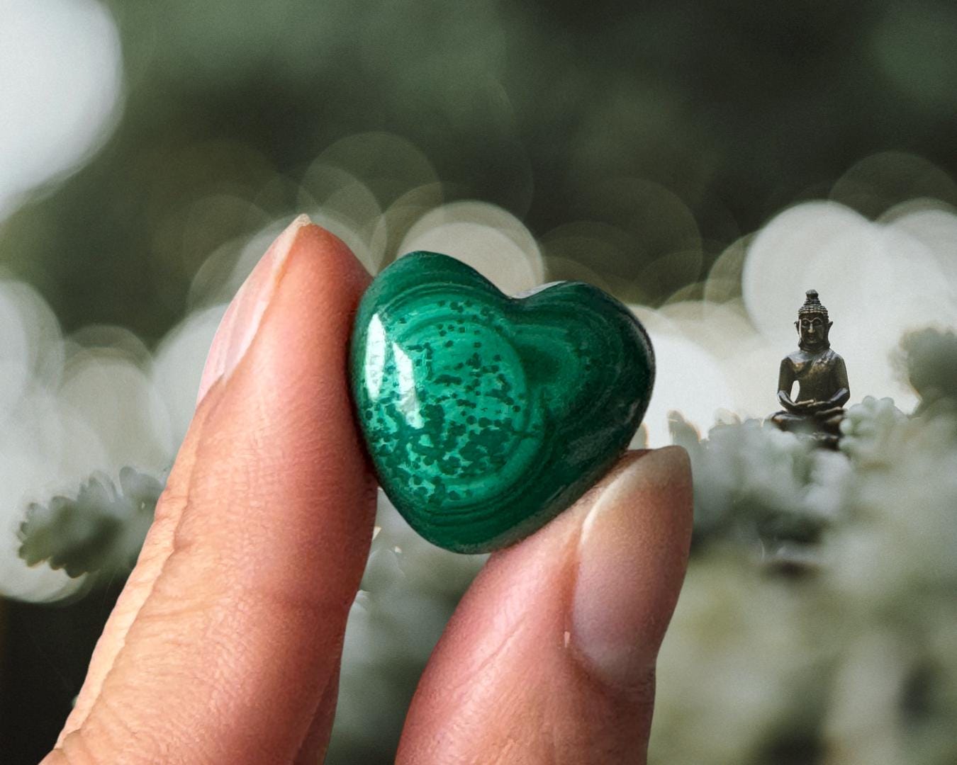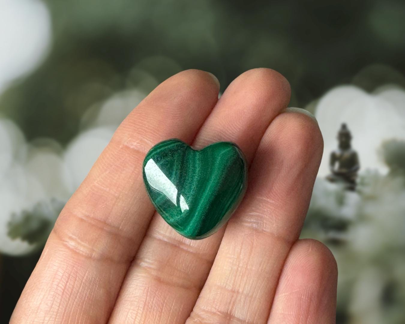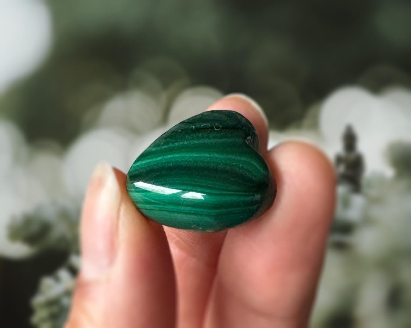 Listing information: Malachite Puffy Heart Crystal (approx. 22 mm wide, 10 grams) • Velvet Pouch for Safekeeping.