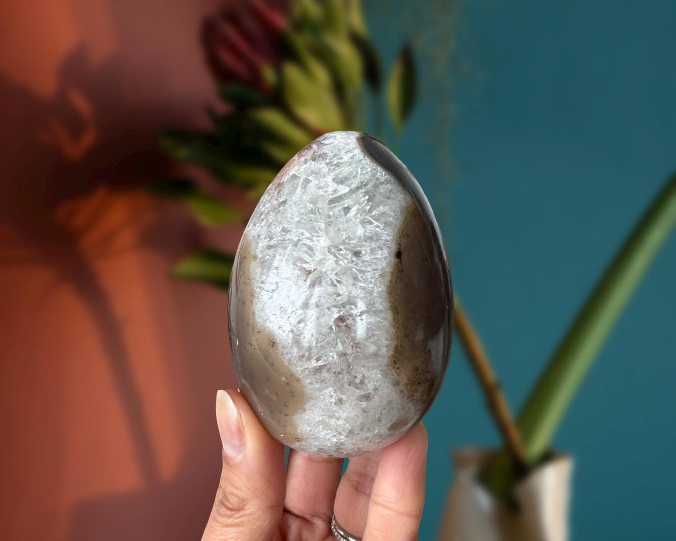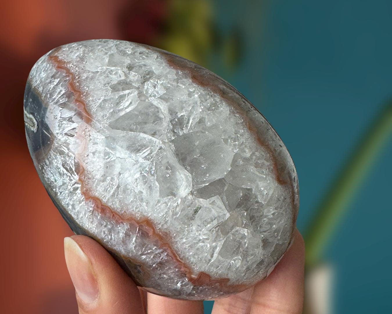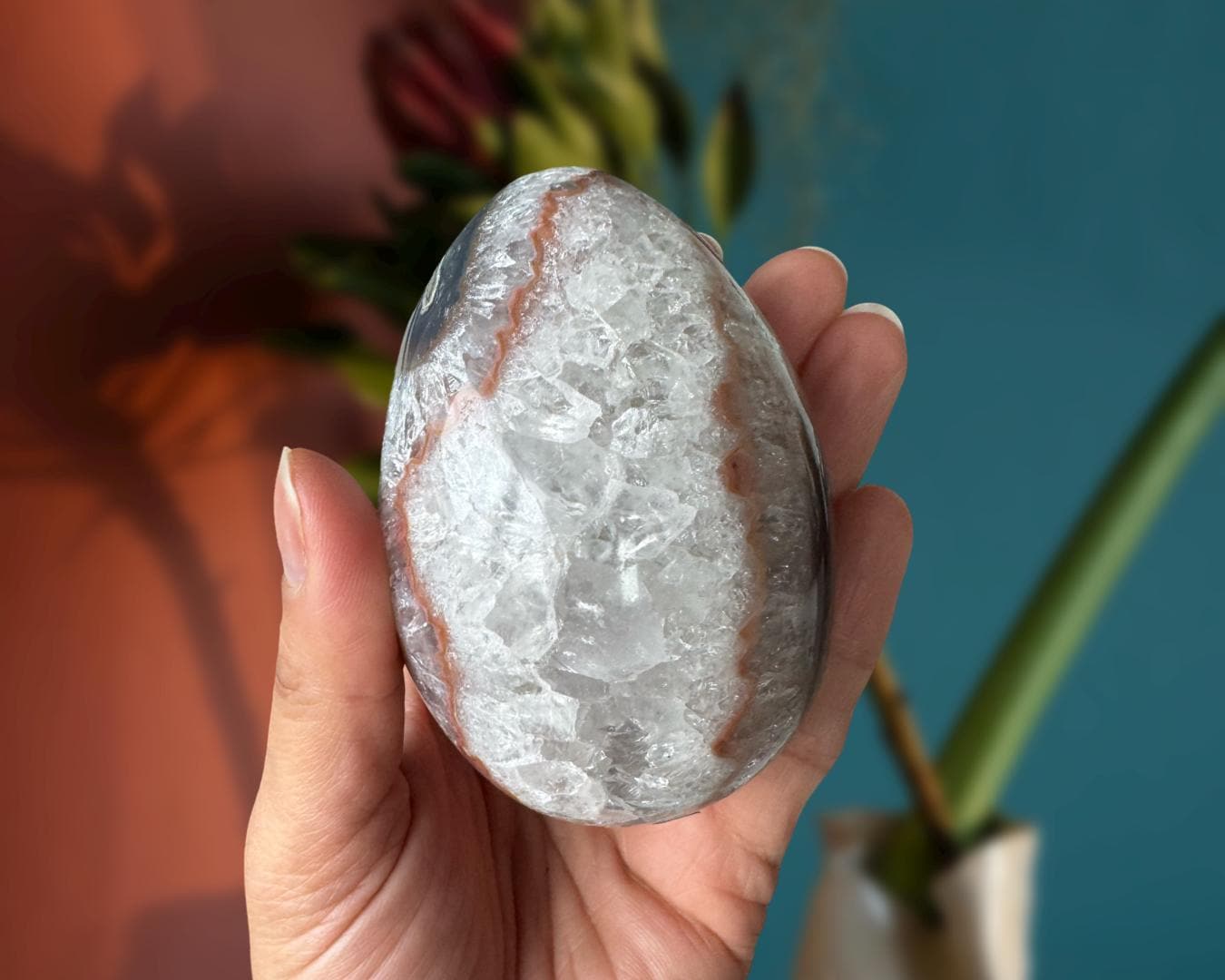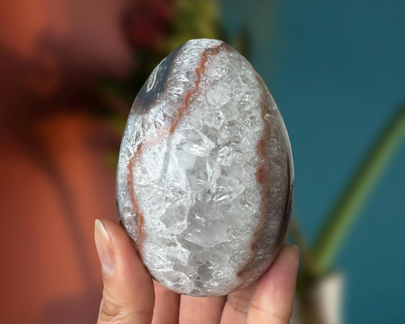 Listing Information: Natural Agate Egg with Quartz Crystals. Approx. 3.3 x 2.3 inches, 400 grams.