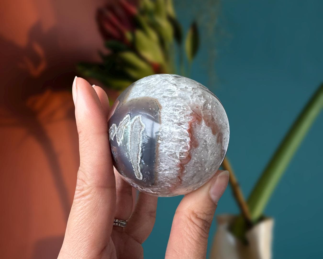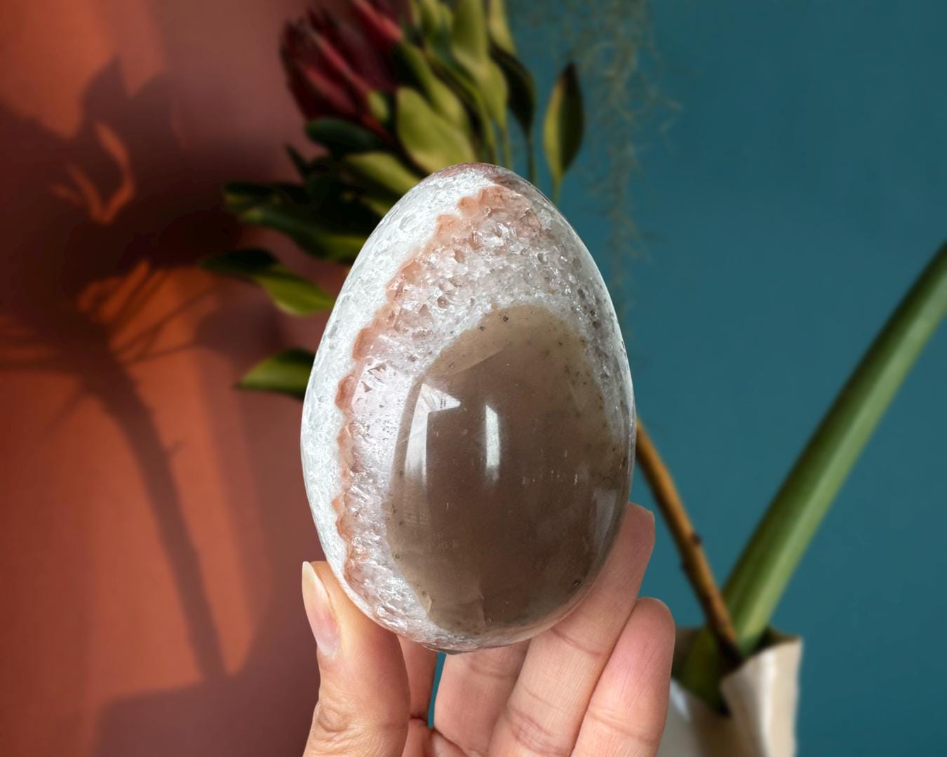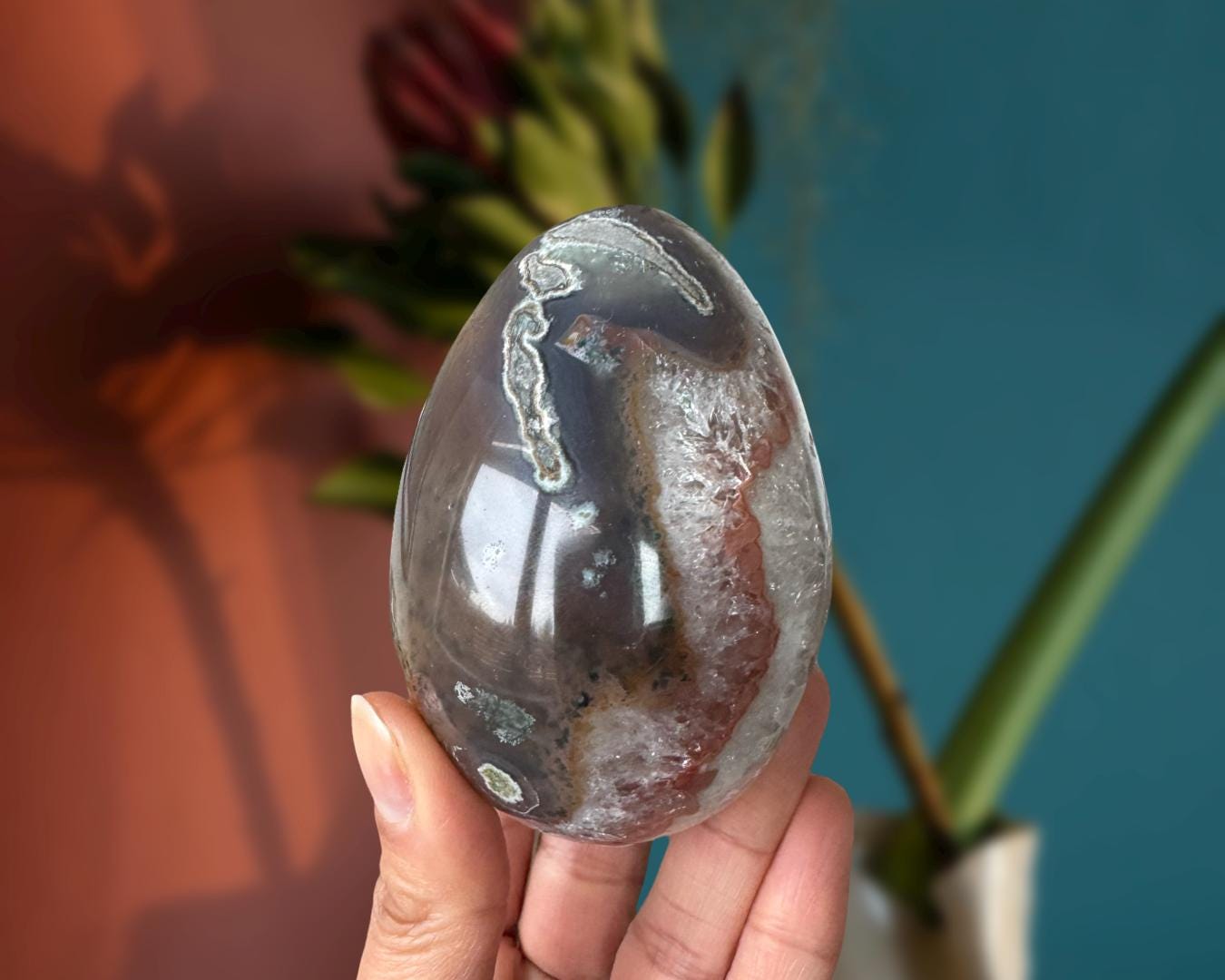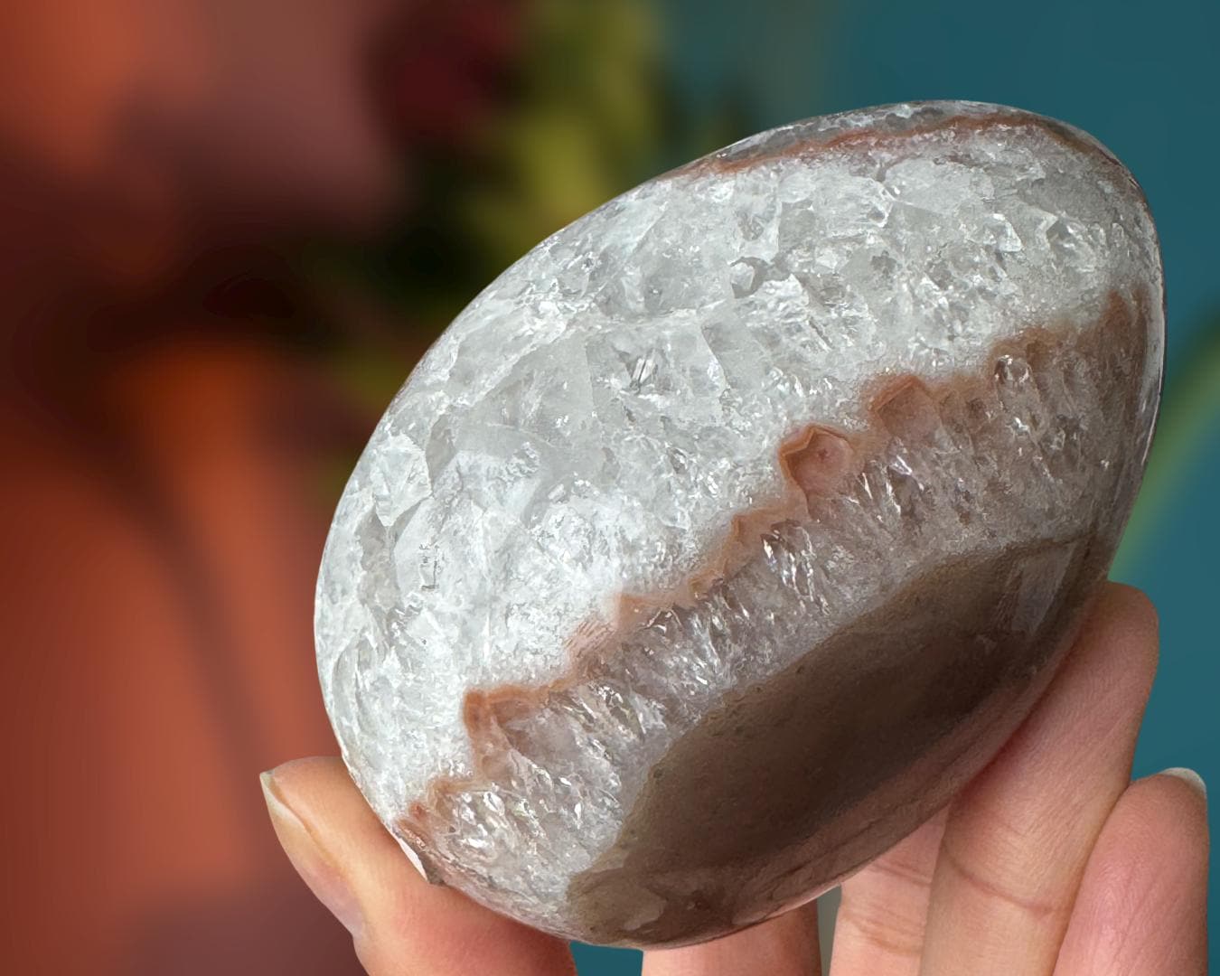 Listing Information: Natural Agate Egg with Quartz Crystals. Approx. 3.3 x 2.3 inches, 400 grams.