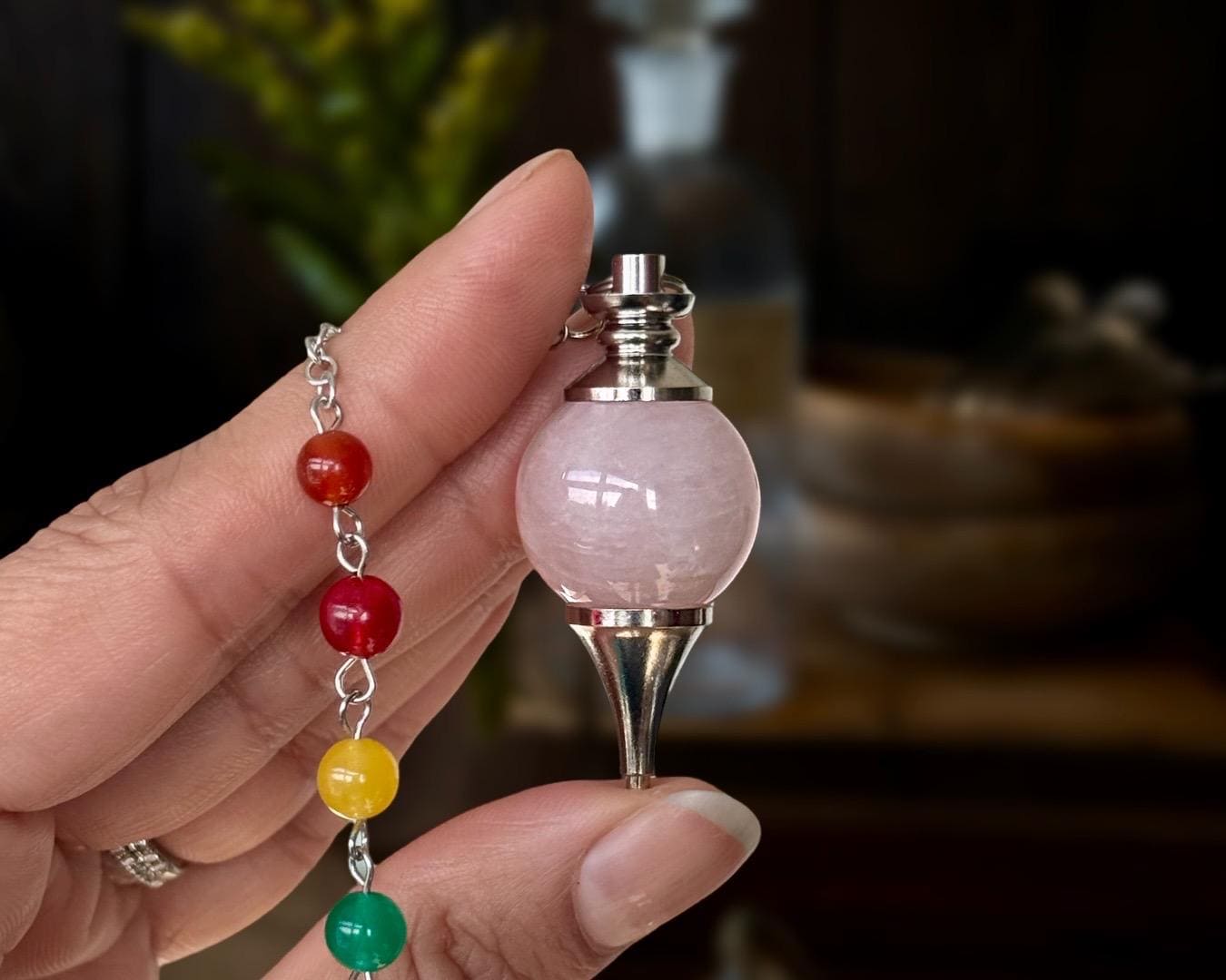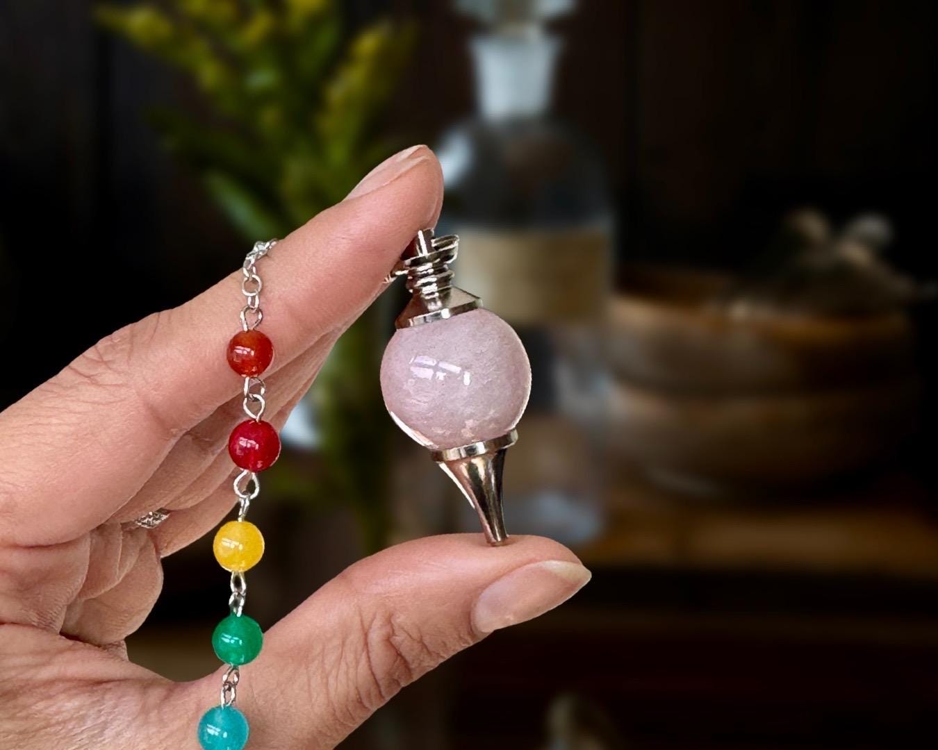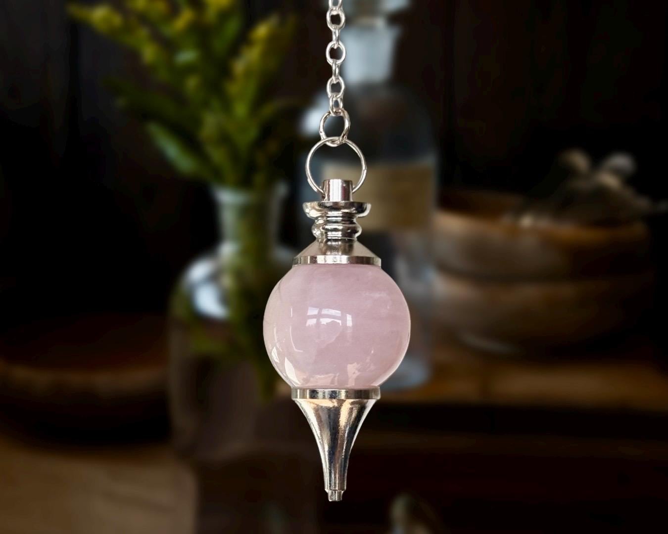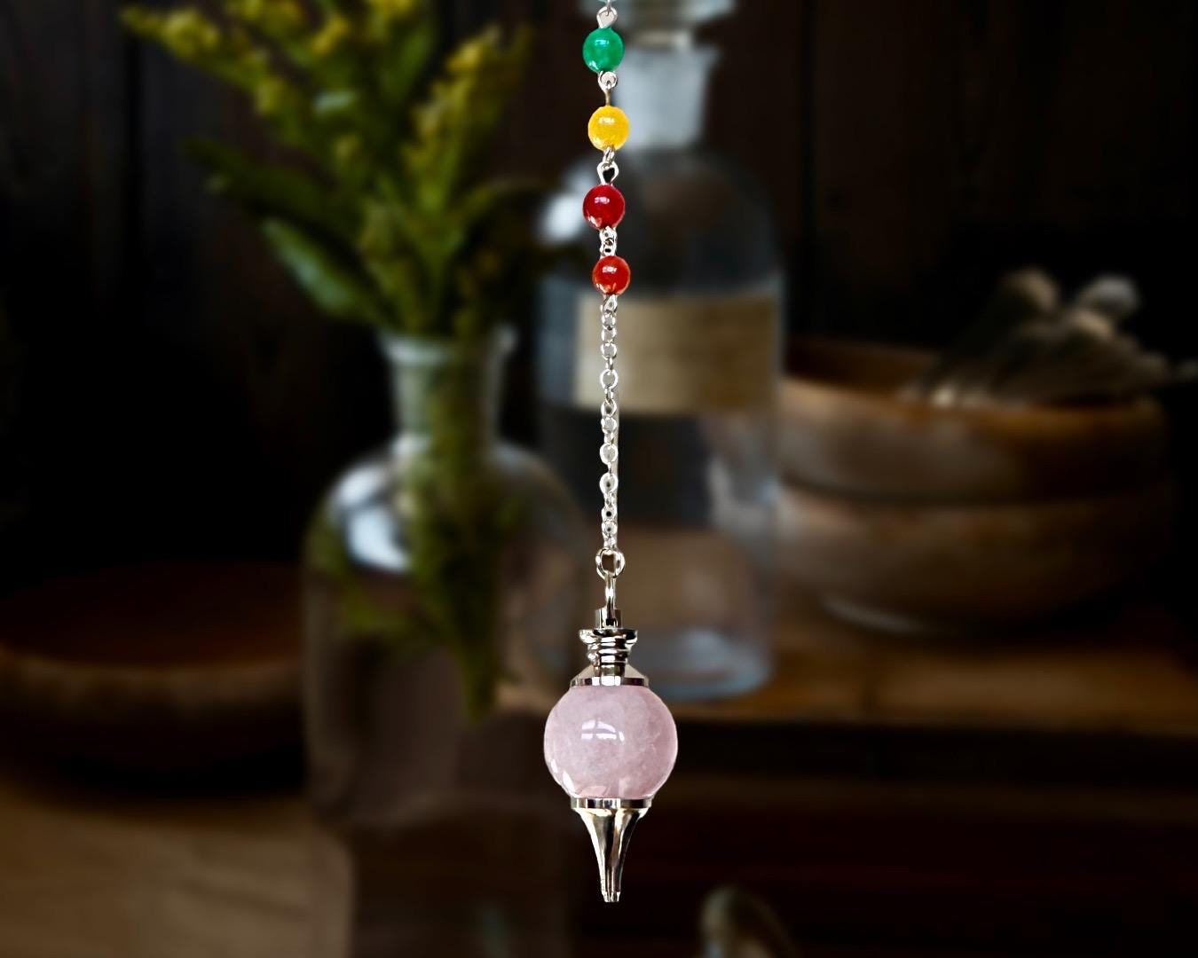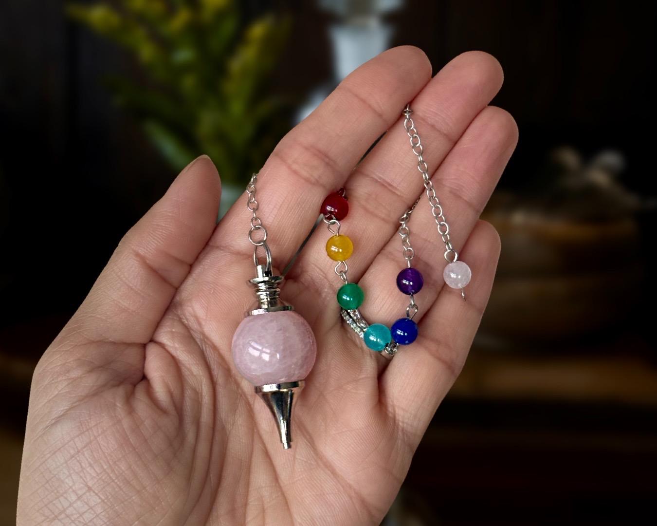 Materials: One (1) Rose Quartz Pendulum with Chakra Beads • Chain and Handle • Velvet Pouch. Size will vary from approximately 1.5 - 2 inches tall (plus chain), and stone color may vary from the photos shown. As gemstones are naturally formed, much like snowflakes, no two stones will be identical.