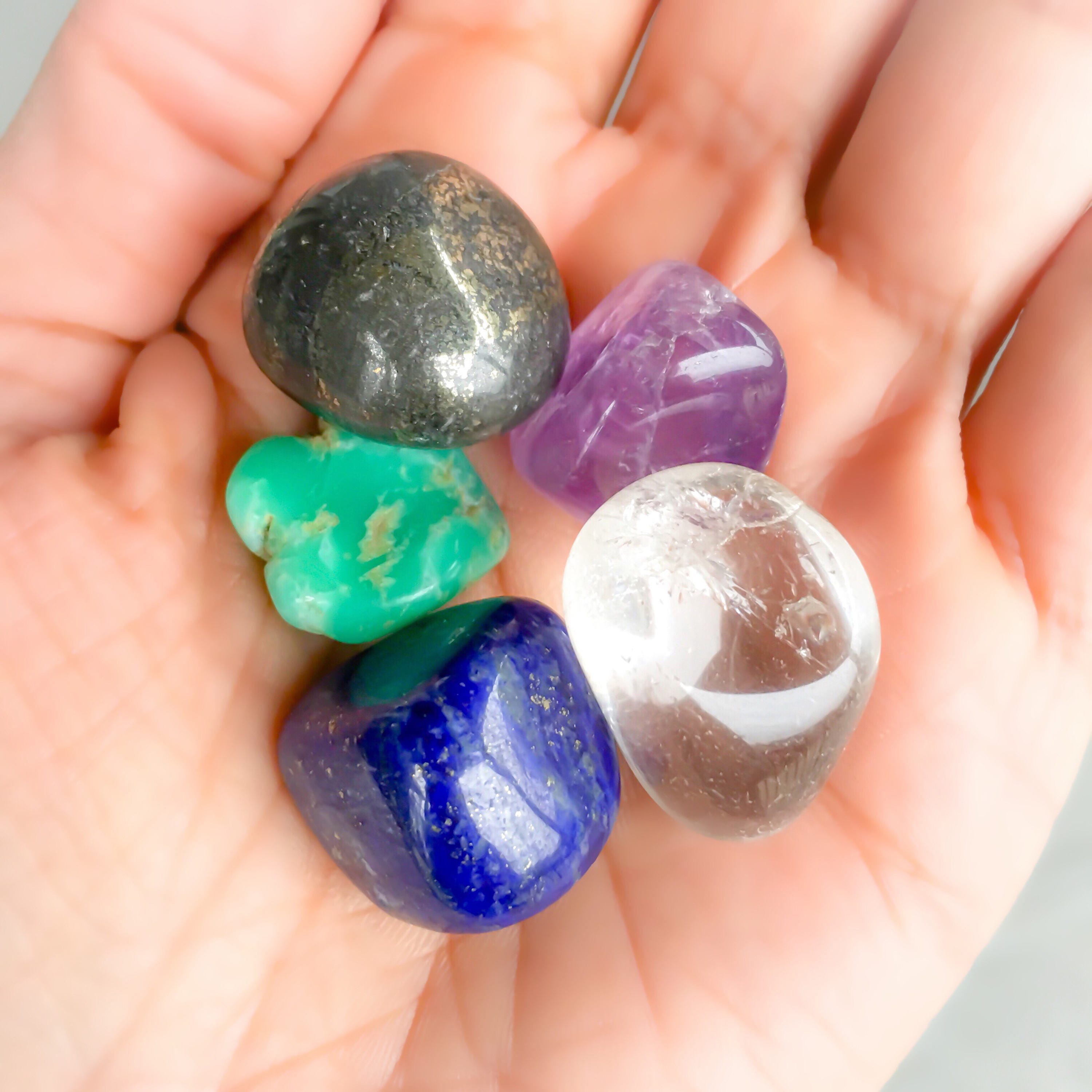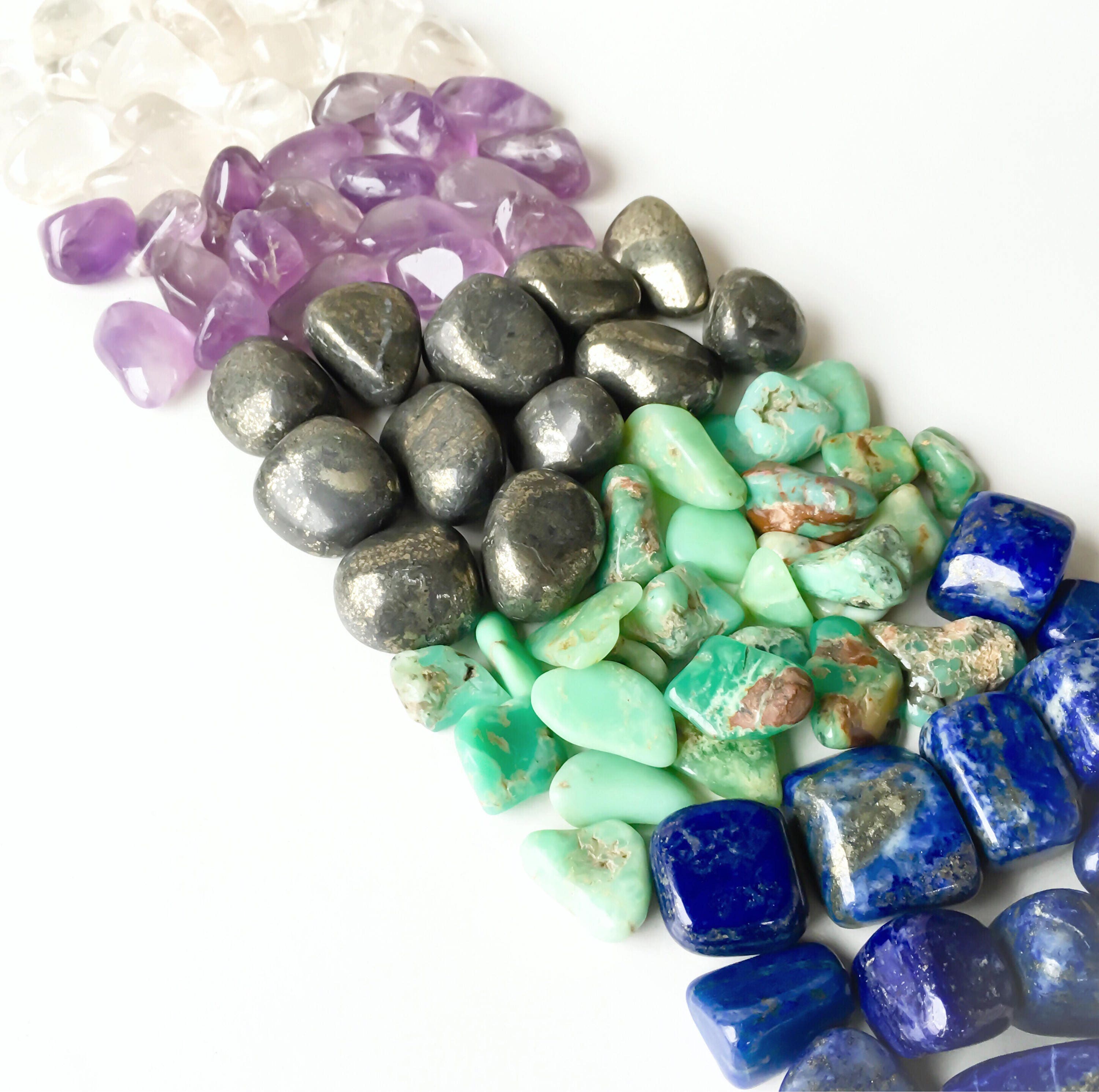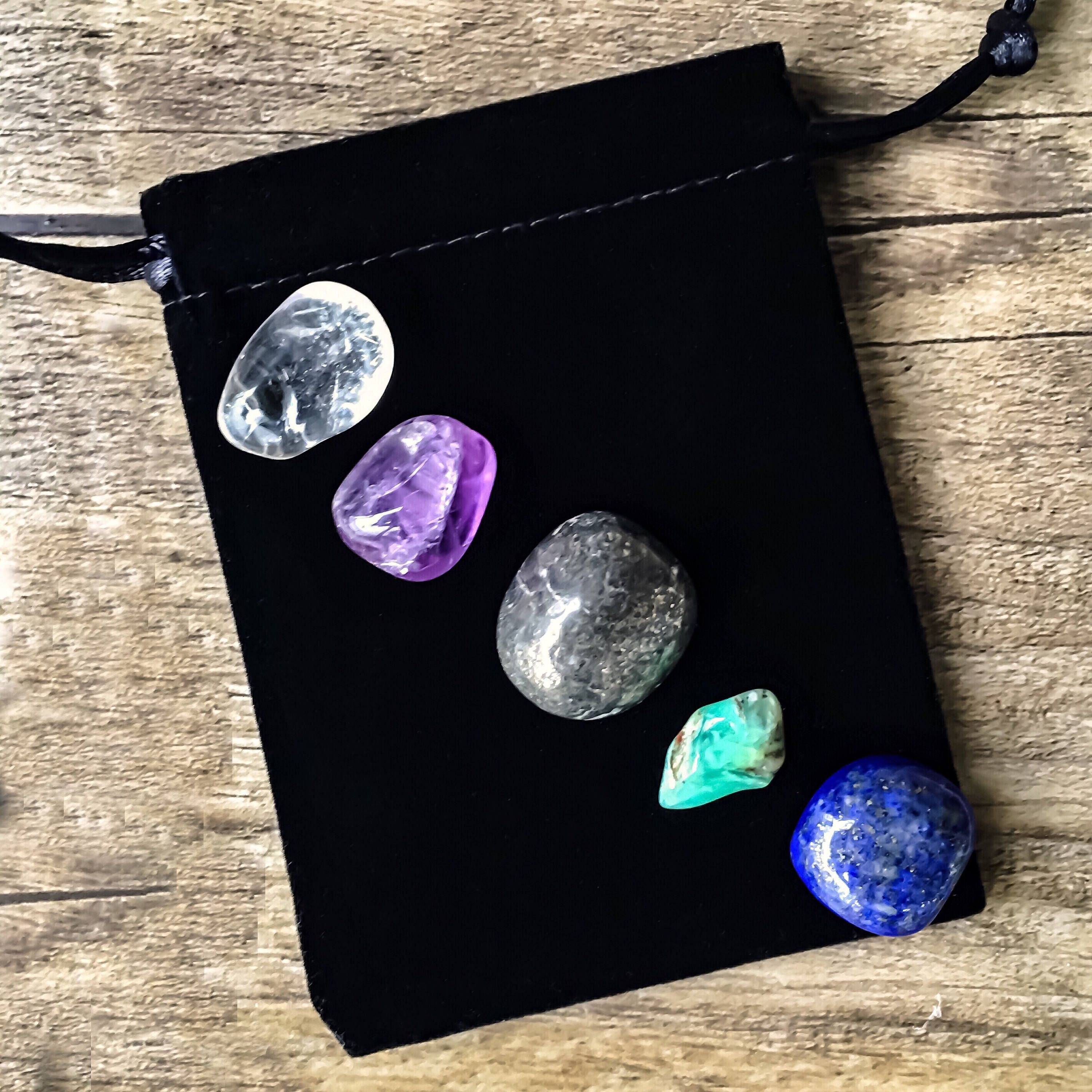 Materials: Five (5) Genuine Natural Tumbled Gemstones • Pocket Stones • Crystal Quartz • Amethyst • Pyrite • Chrysoprase • Lapis Lazuli • Information Card on How to Use Gemstones • Information Card on How to Cleanse and Charge Gemstones • Velvet Pouch.
