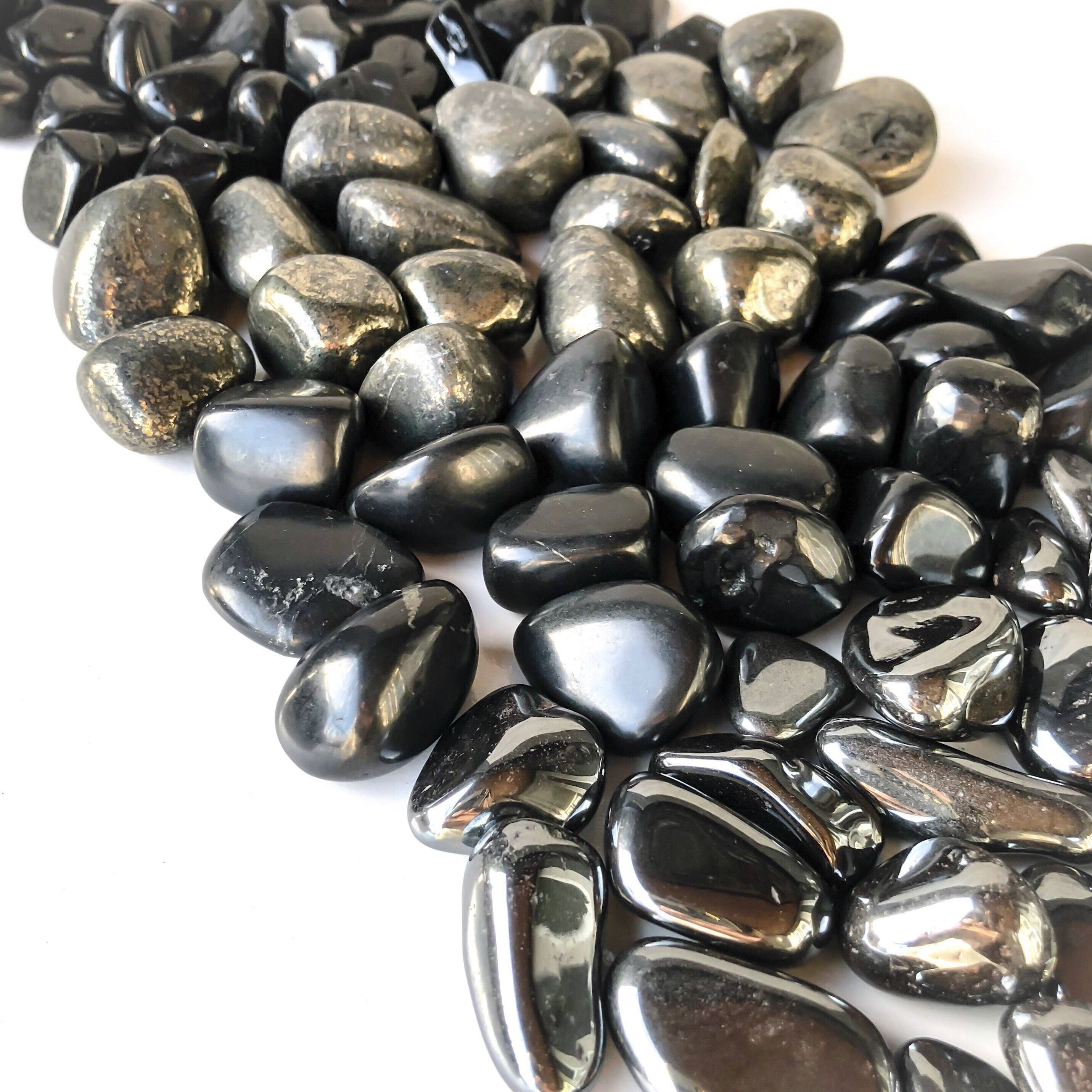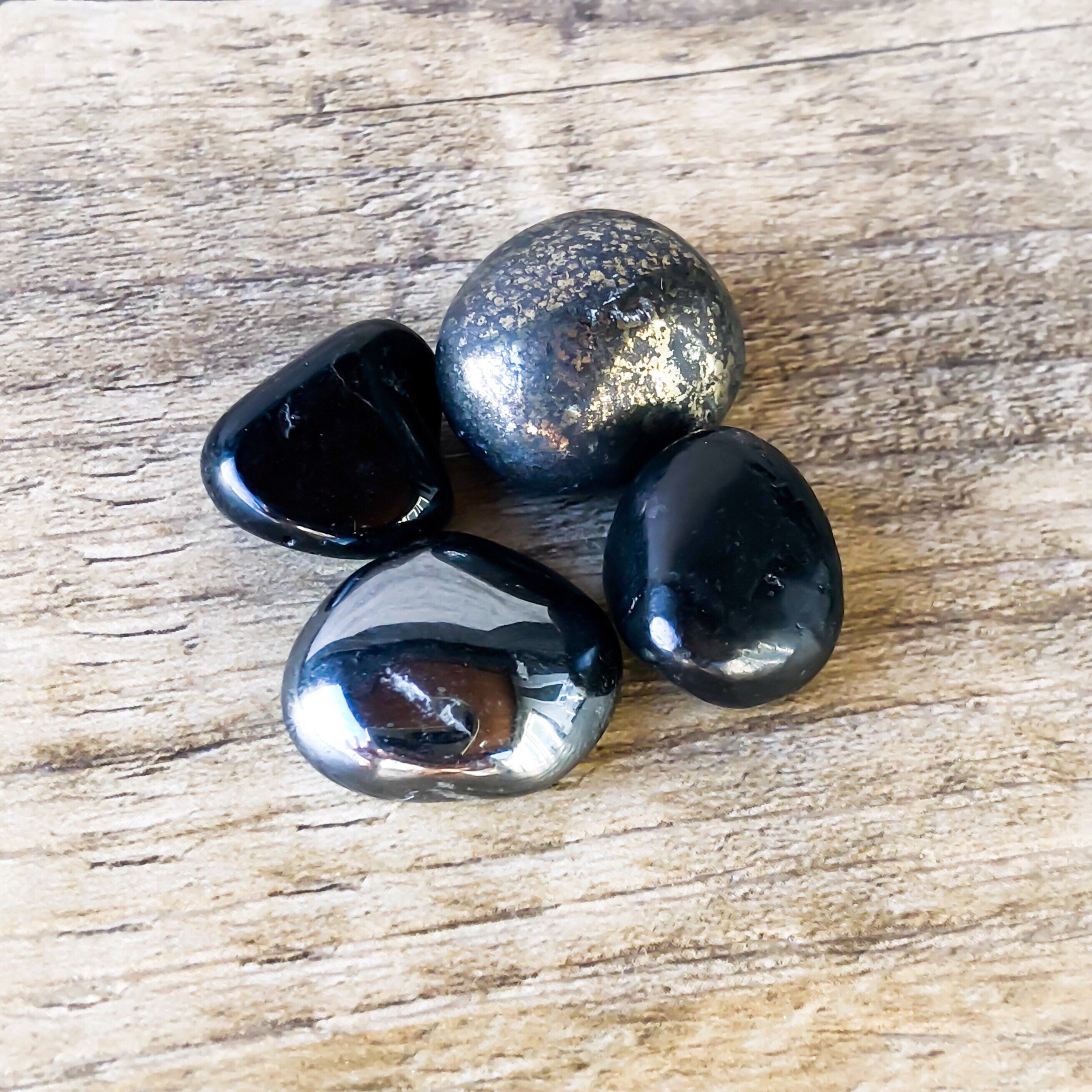 Listing Information: Four (4) Genuine Natural Tumbled Gemstones • Pocket Stones • Black Tourmaline • Hematite • Shungite • Pyrite • Information Card on How to Use Gemstones • Information Card on How to Cleanse and Charge Gemstones • Velvet Pouch.