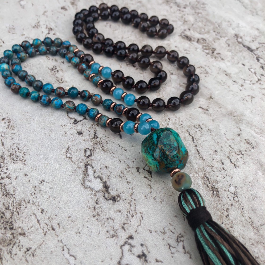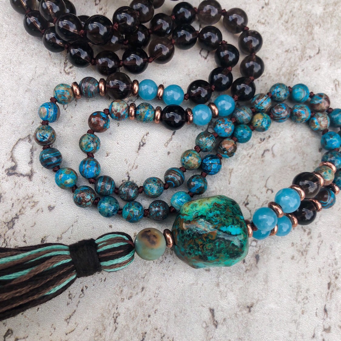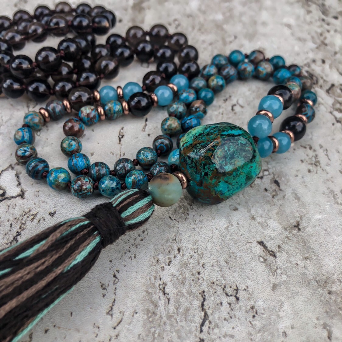 Chyrsocolla (Guru Bead) the stone of communication, allows truth and inner wisdom to surface and be heard. It emphasizes the power our words and actions have on those around us, and encourages compassion and strengthening of character.