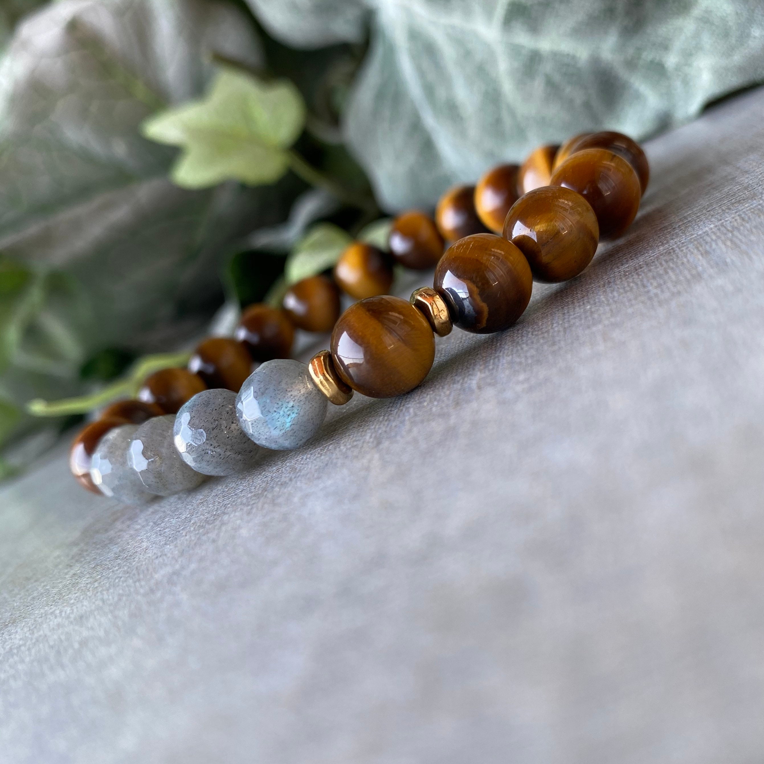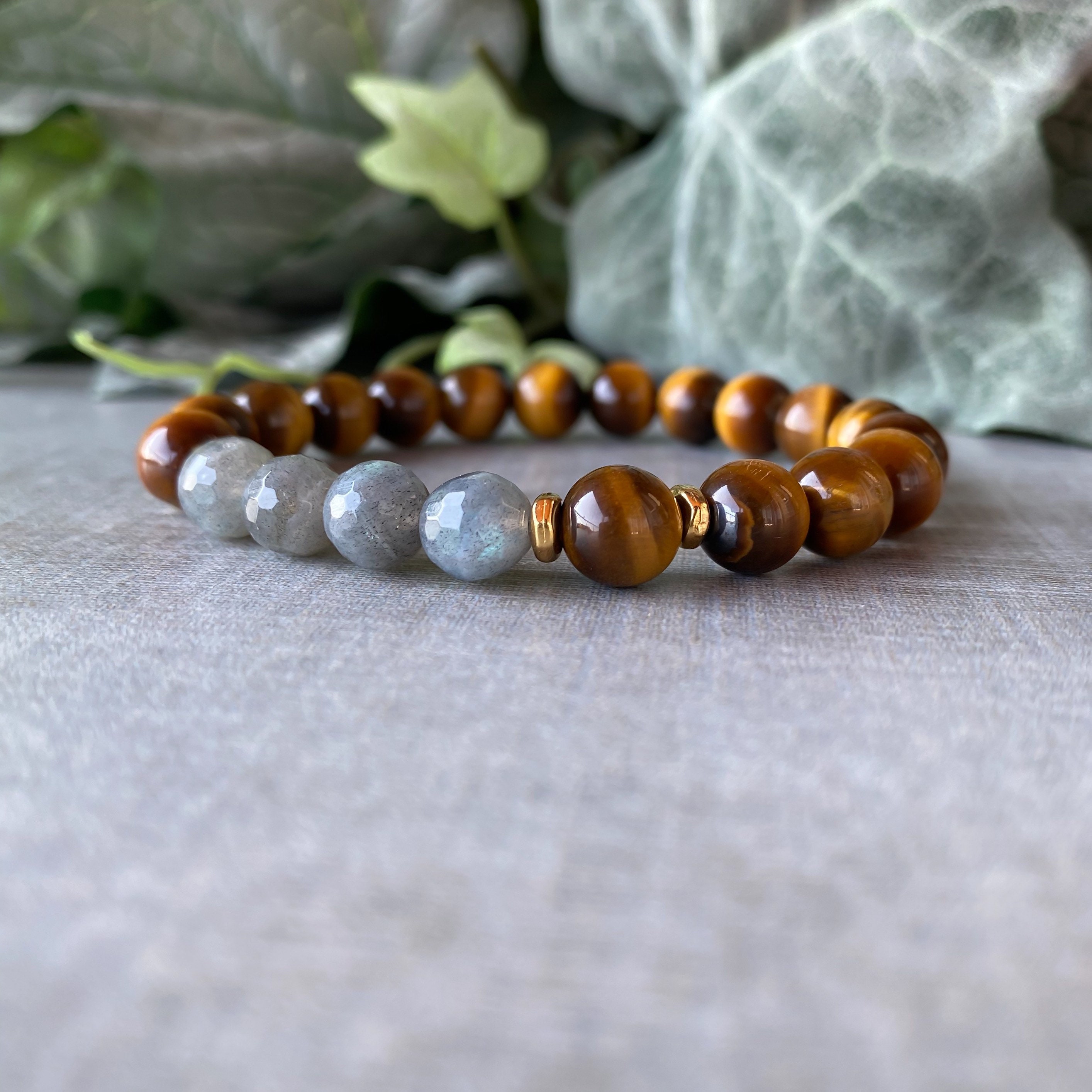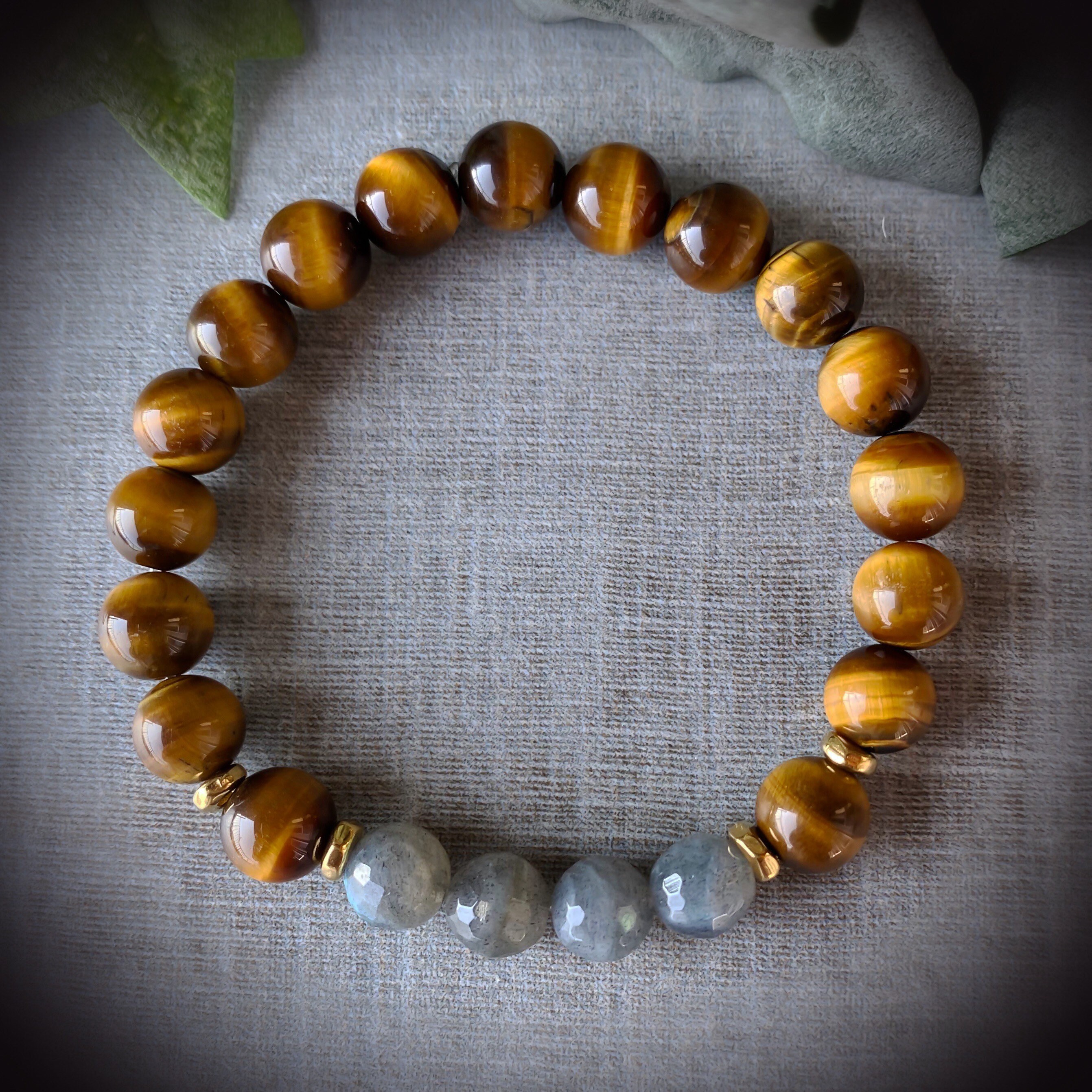 Materials: 8mm Genuine Natural Gemstone Beads • Faceted Labradorite • Tiger's Eye • Gold Plated TierraCast Nugget Spacers • Elasticated Bracelet w/Stretch Cord