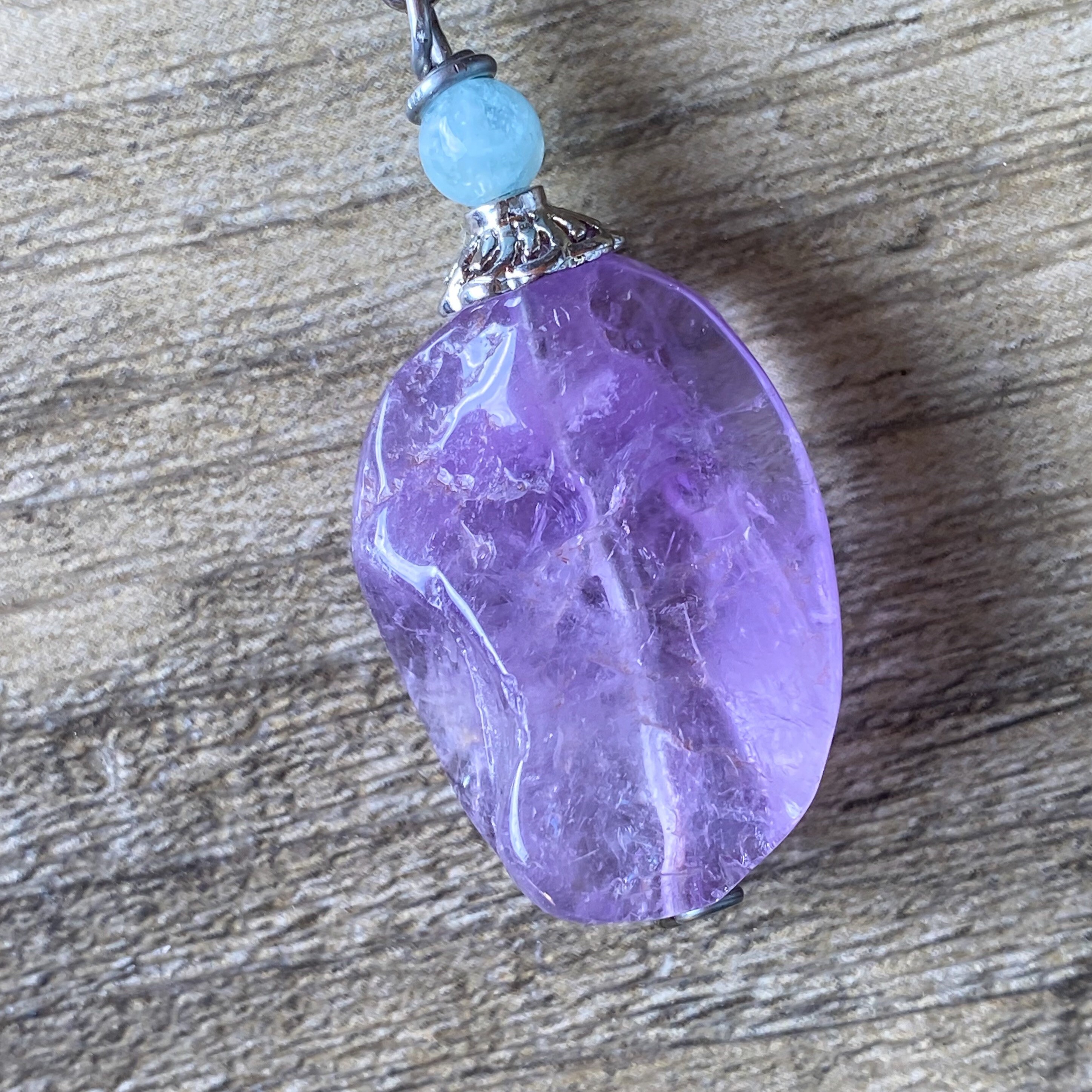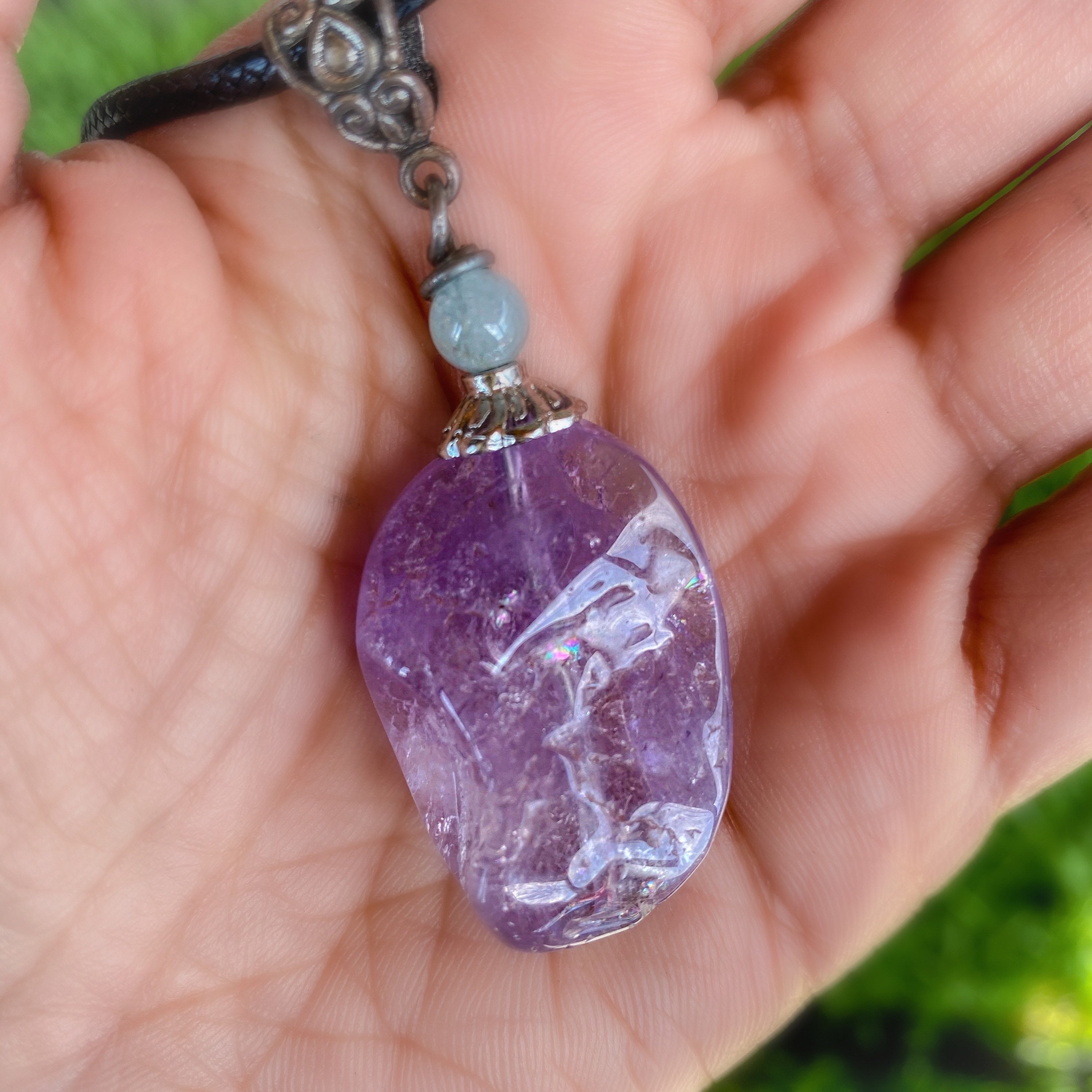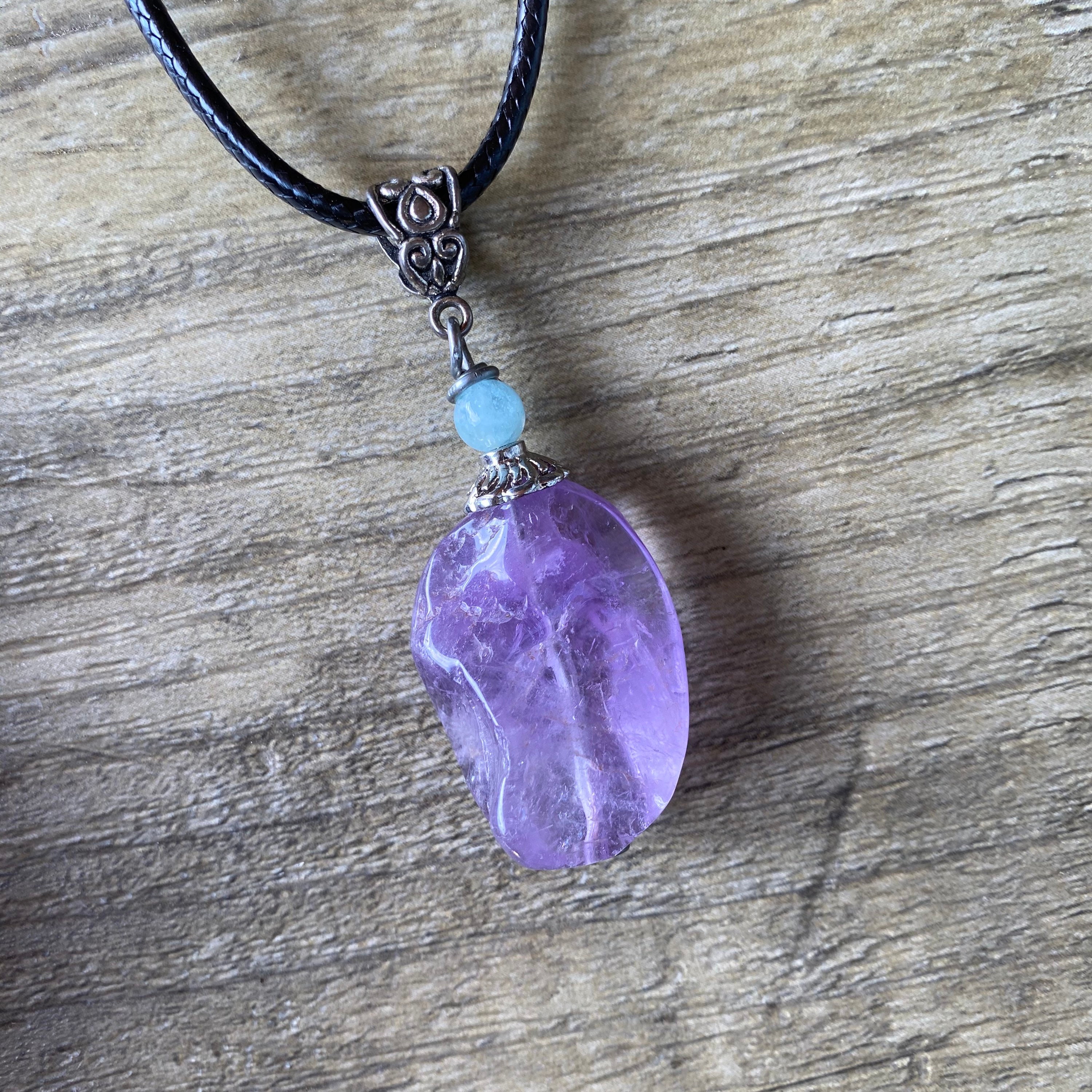 Materials: One (1) Genuine Lavender Amethyst Polished Crystal Pendant • 18 inch Black Necklace Cord w/Clasp and Extender • Velvet Pouch