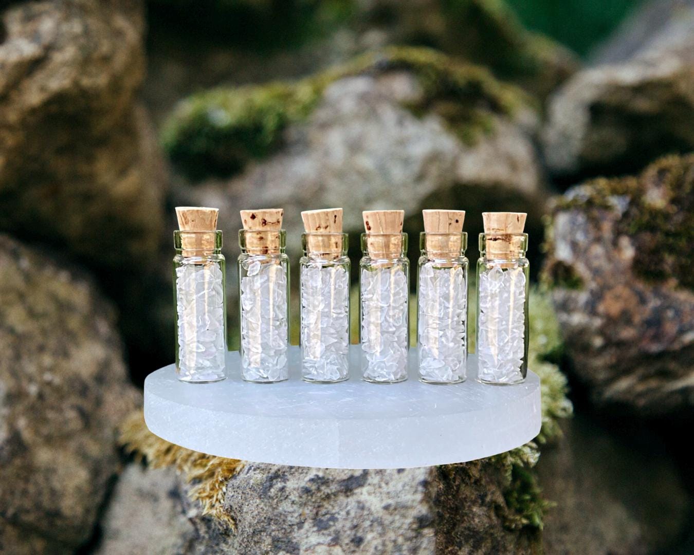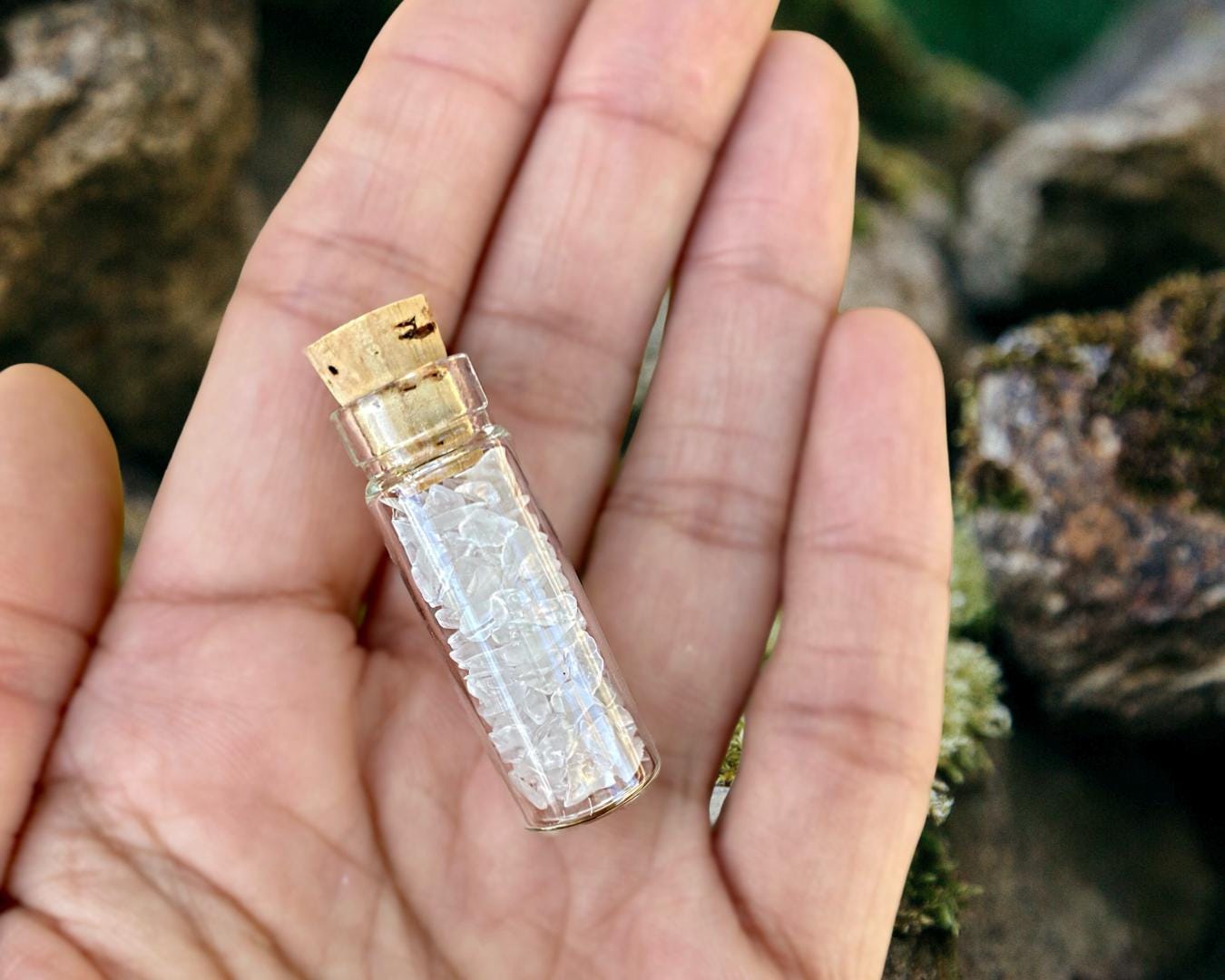 Item Details: One (1) Glass Vial with Cork (approx. 12 x 35 mm) • Clear Quartz Crystal Chips • Velvet Pouch.